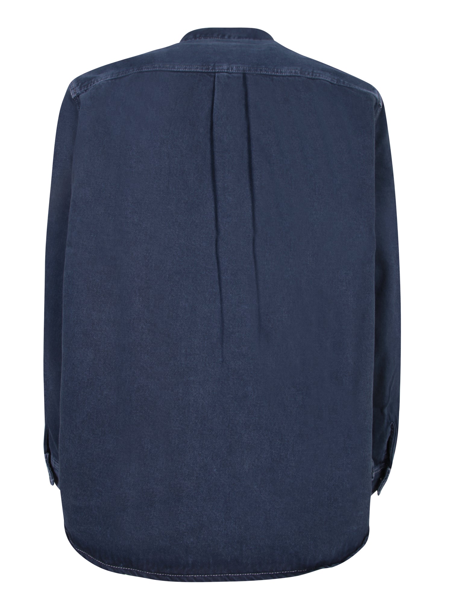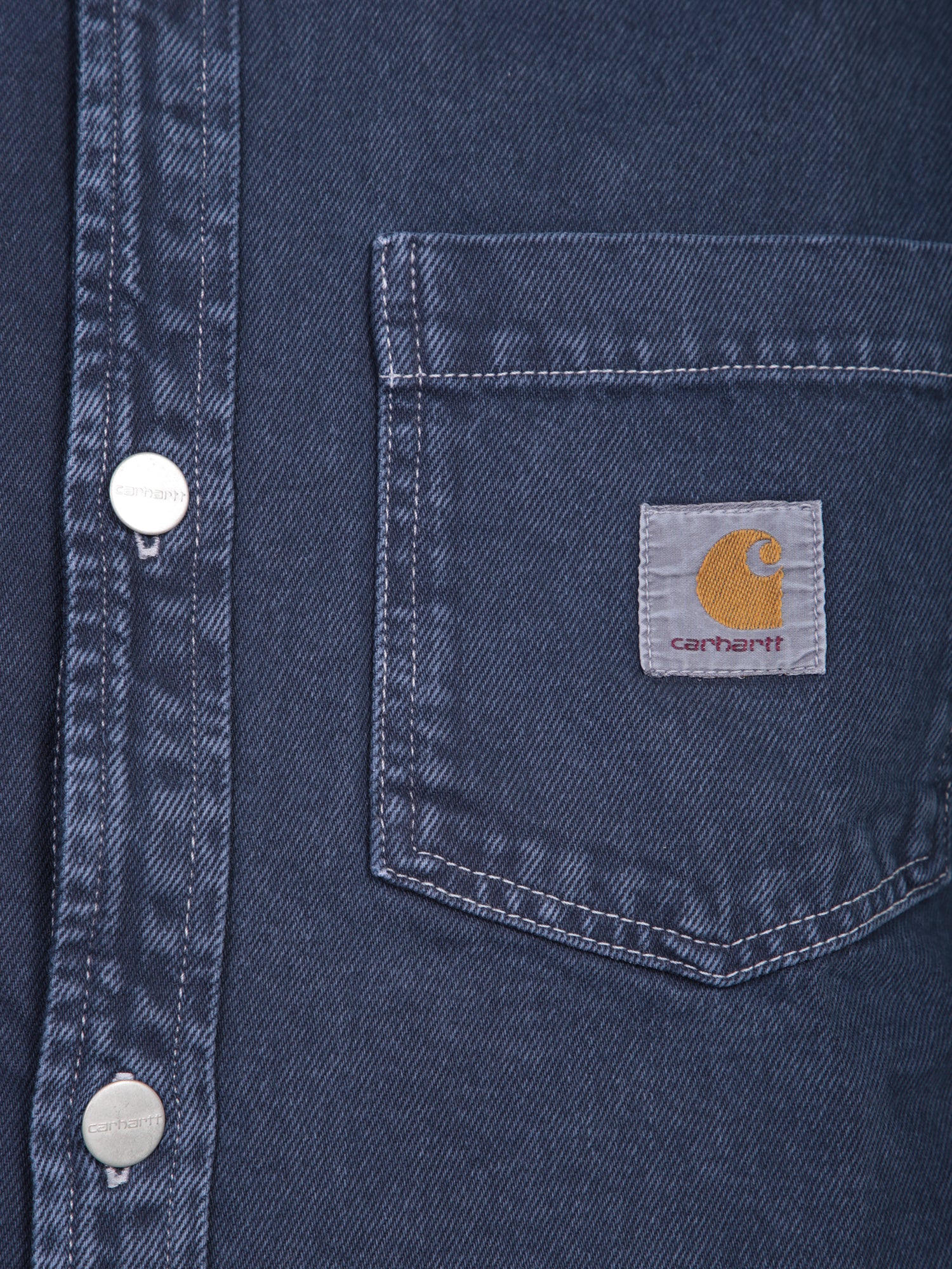 Denim shirt with button closure. Chest pocket with visible logo. Classic collar.