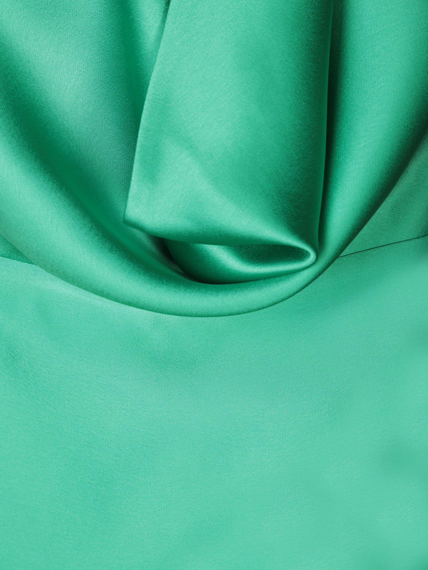 Halter neckline. Ribbon tie closure at the back. Silk satin fabric.
