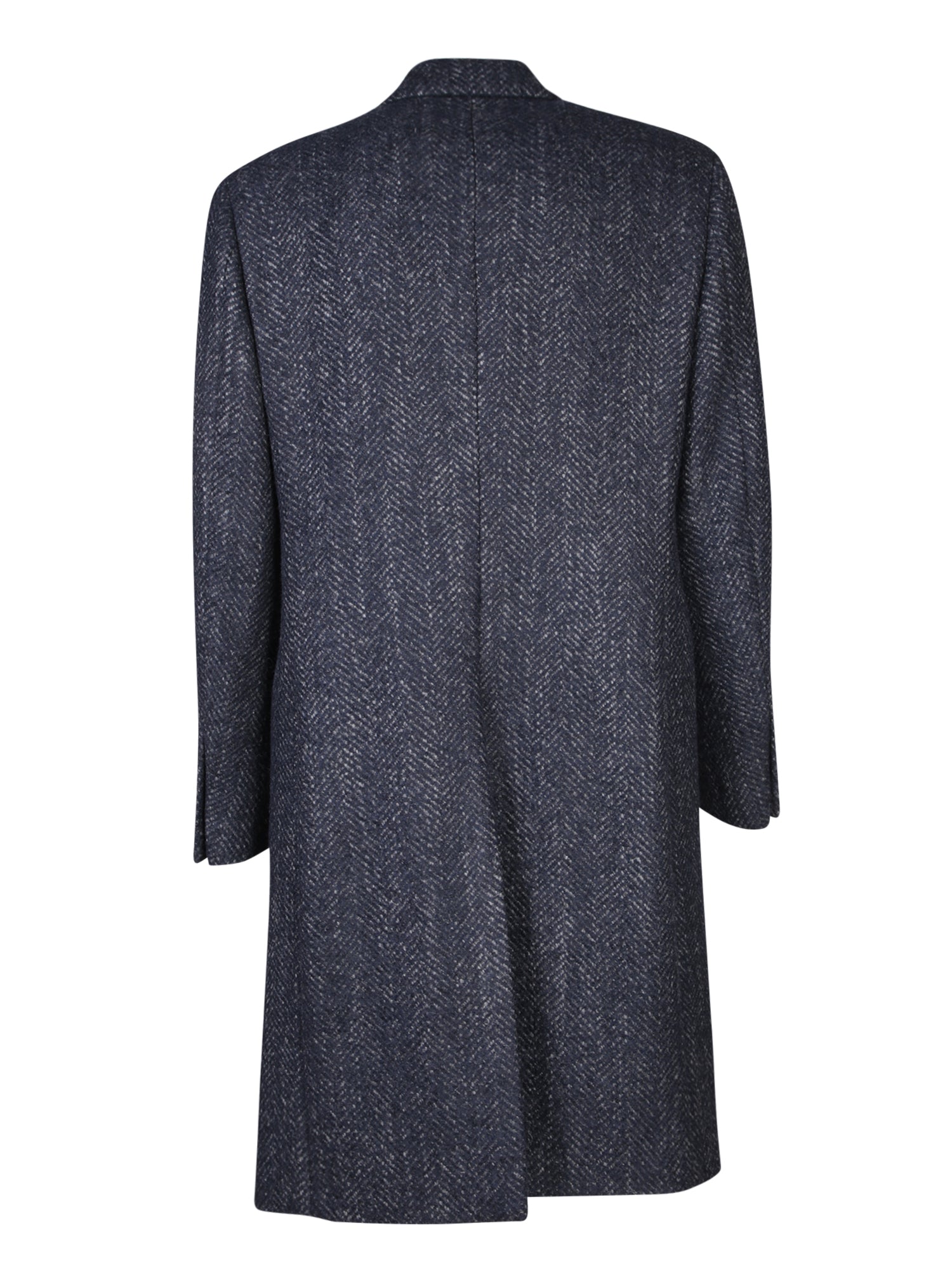 Double-breasted coat in herringbone fabric. Features classic lapels and front button closure.