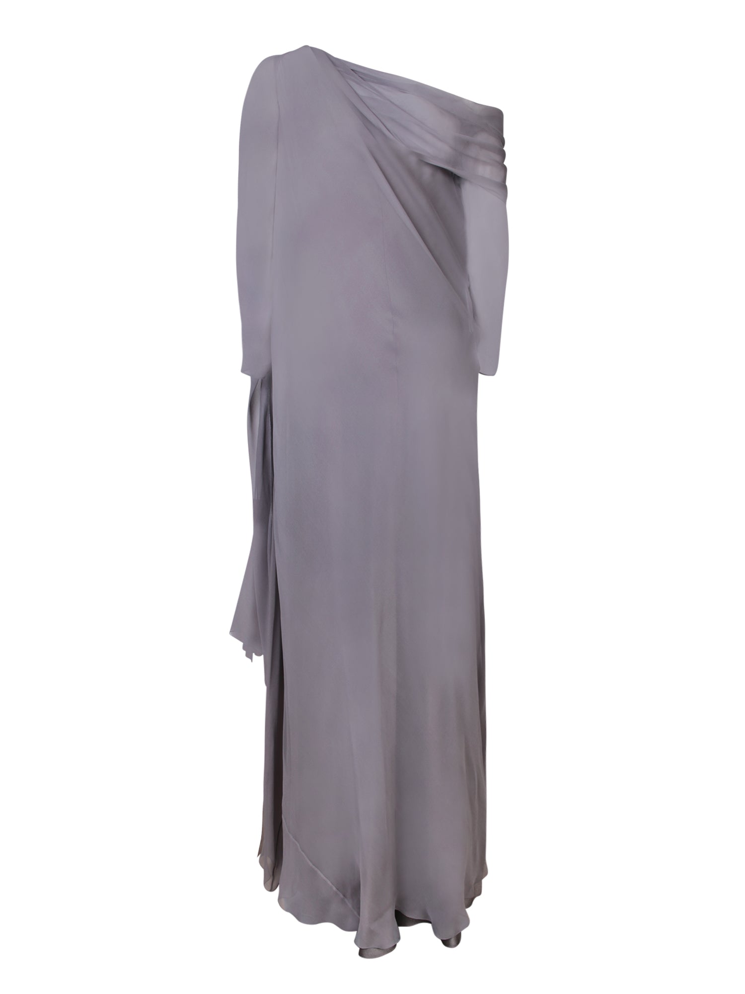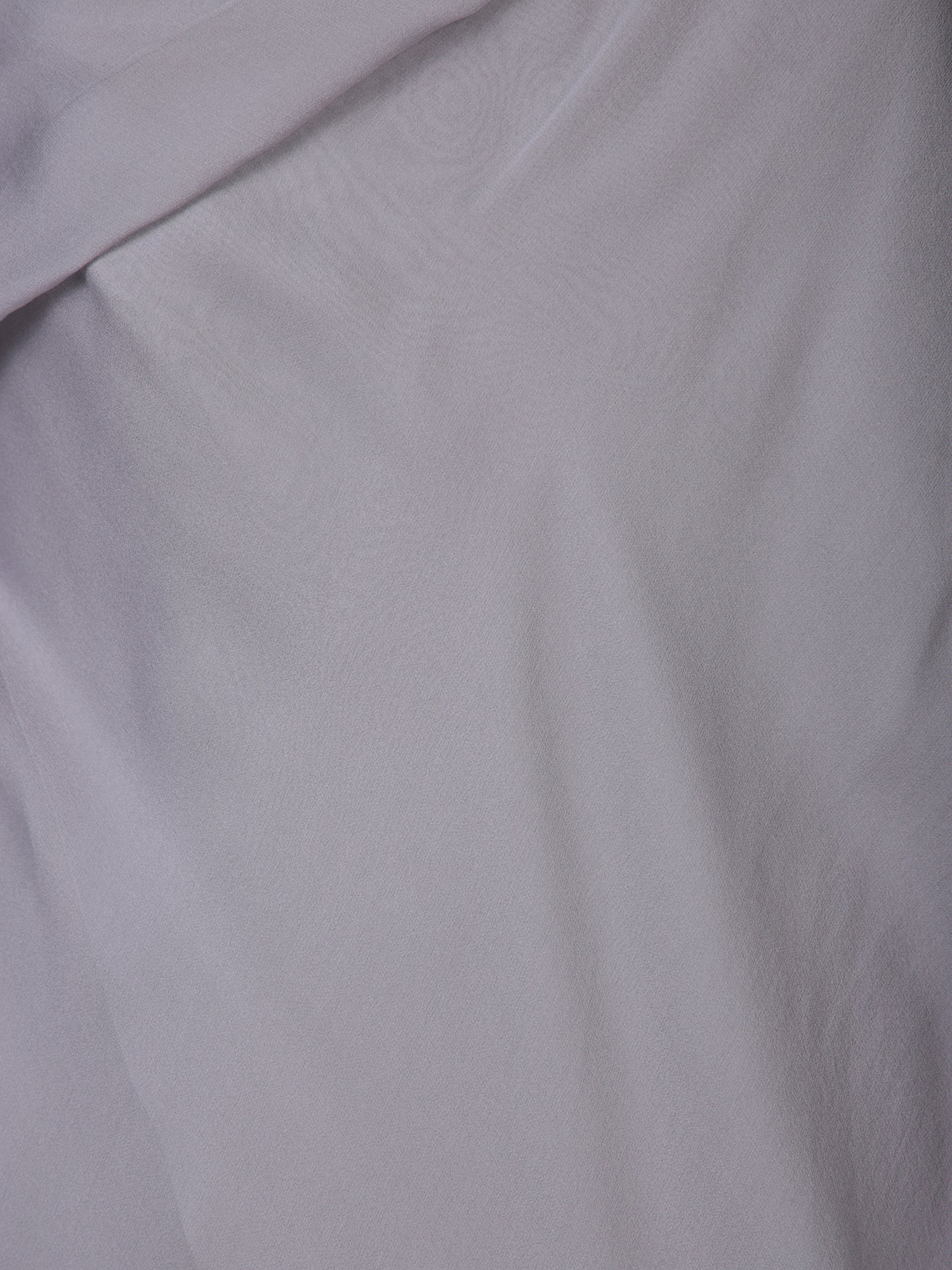 One-shoulder light chiffon dress. Asymmetric hem. Bow detail on shoulder.