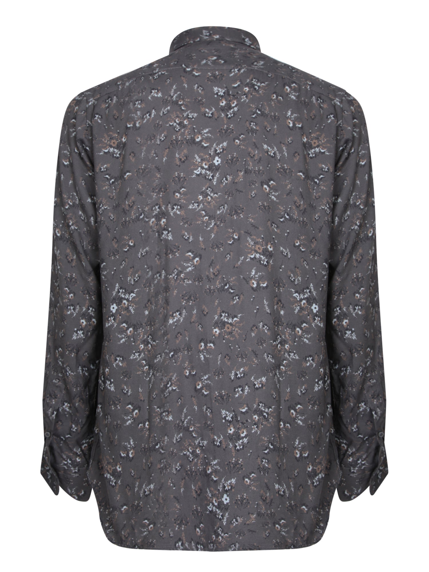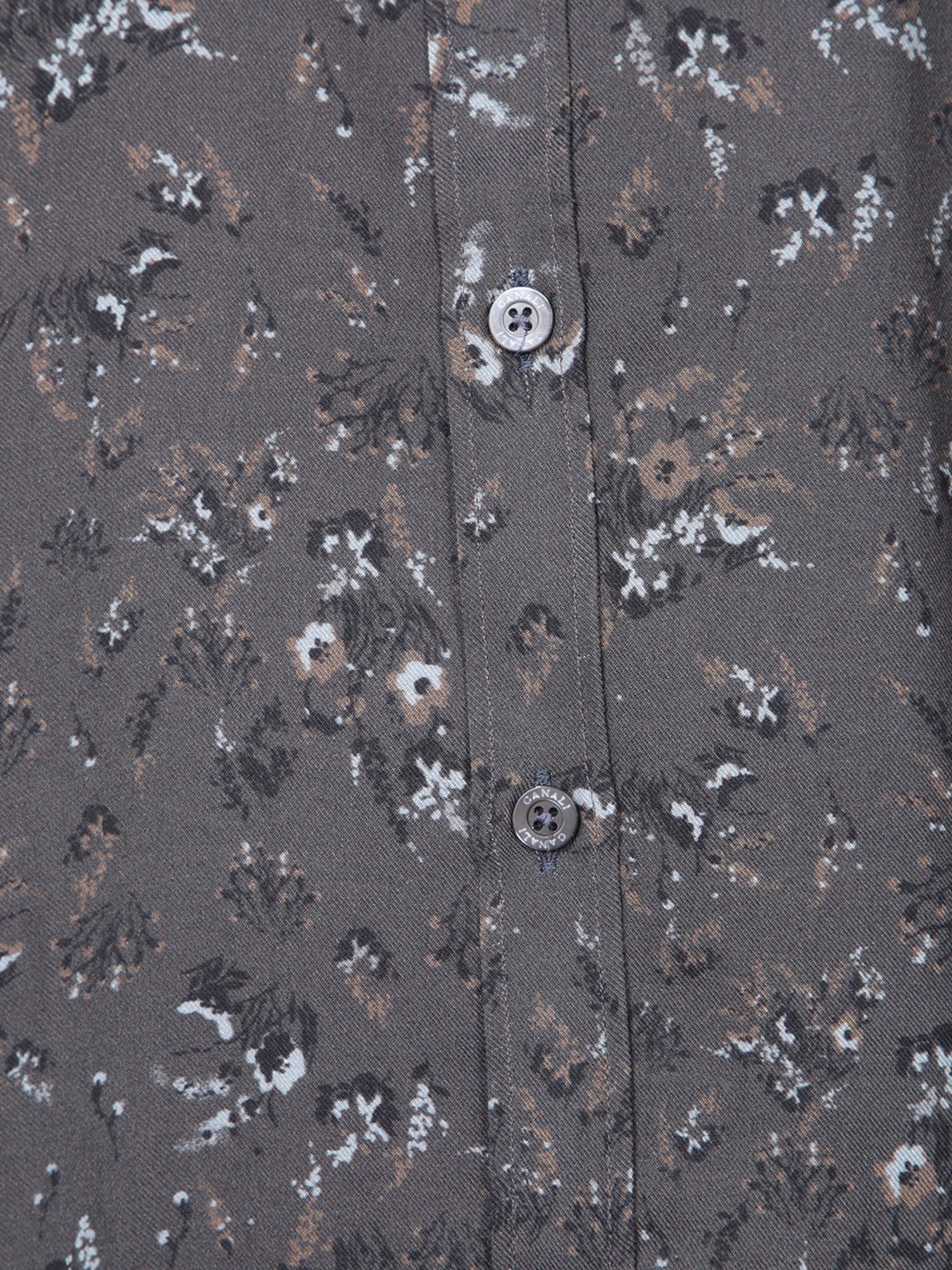Long-sleeved viscose shirt. Floral pattern on a grey melange base. Front button closure.