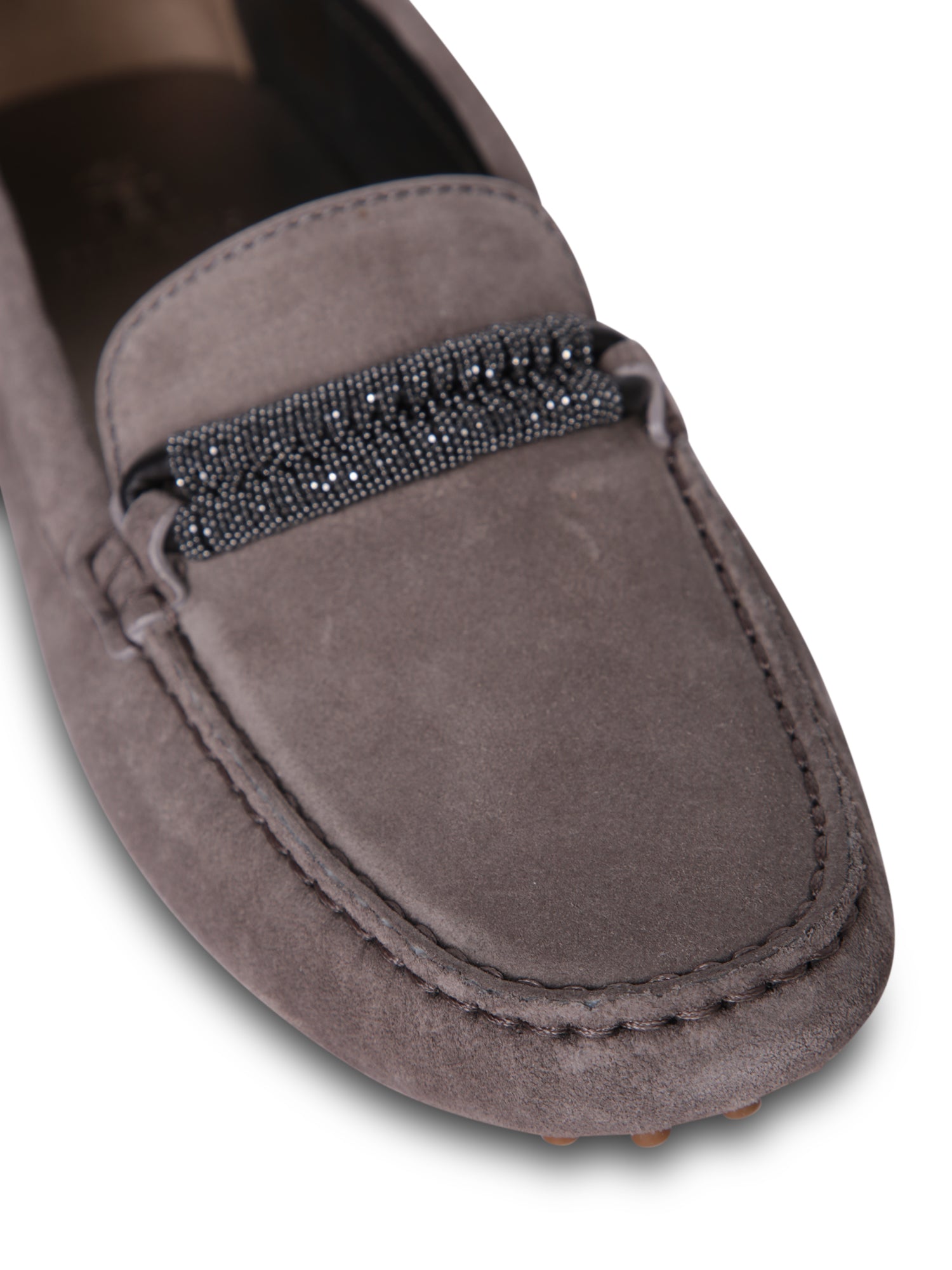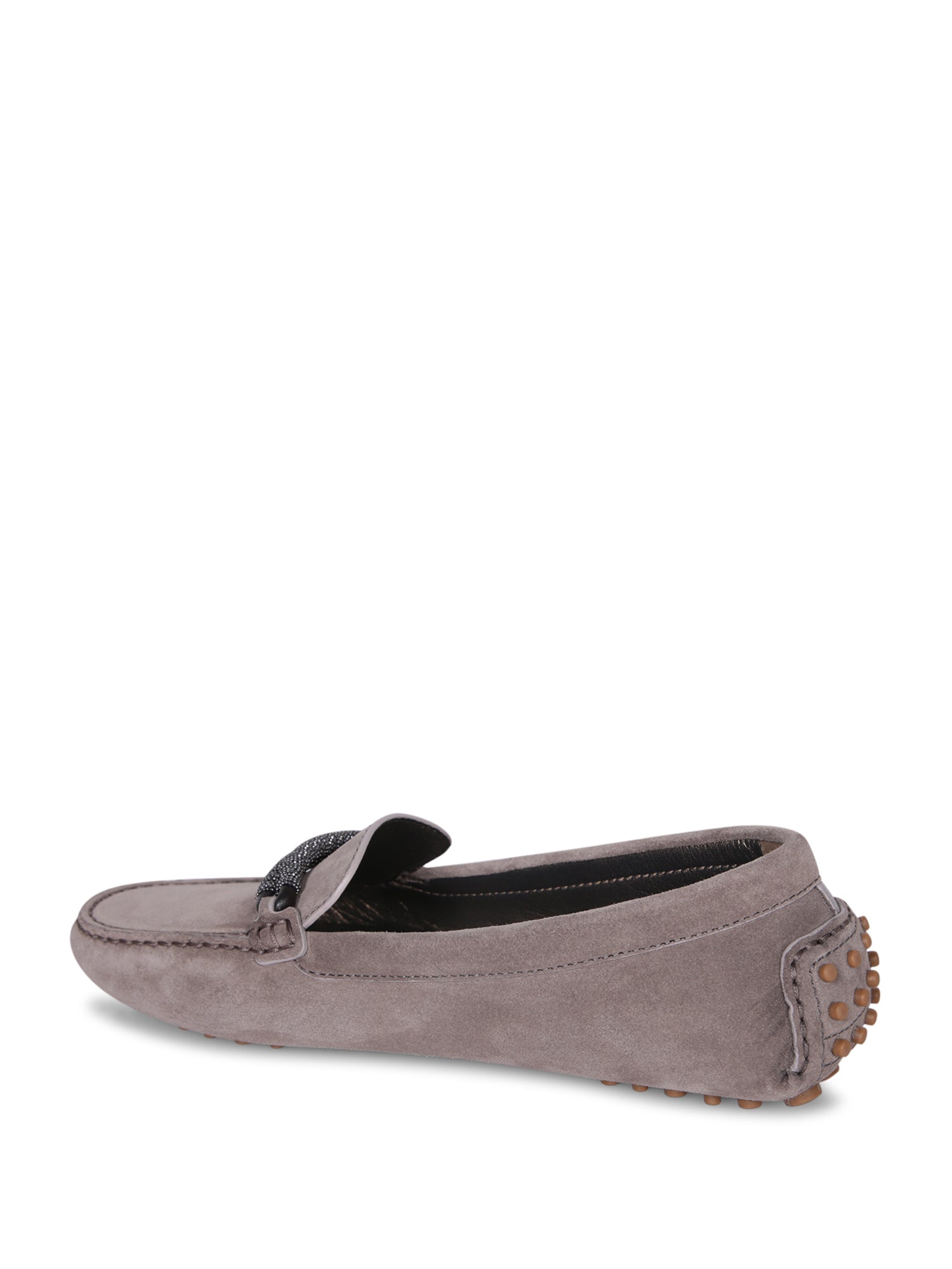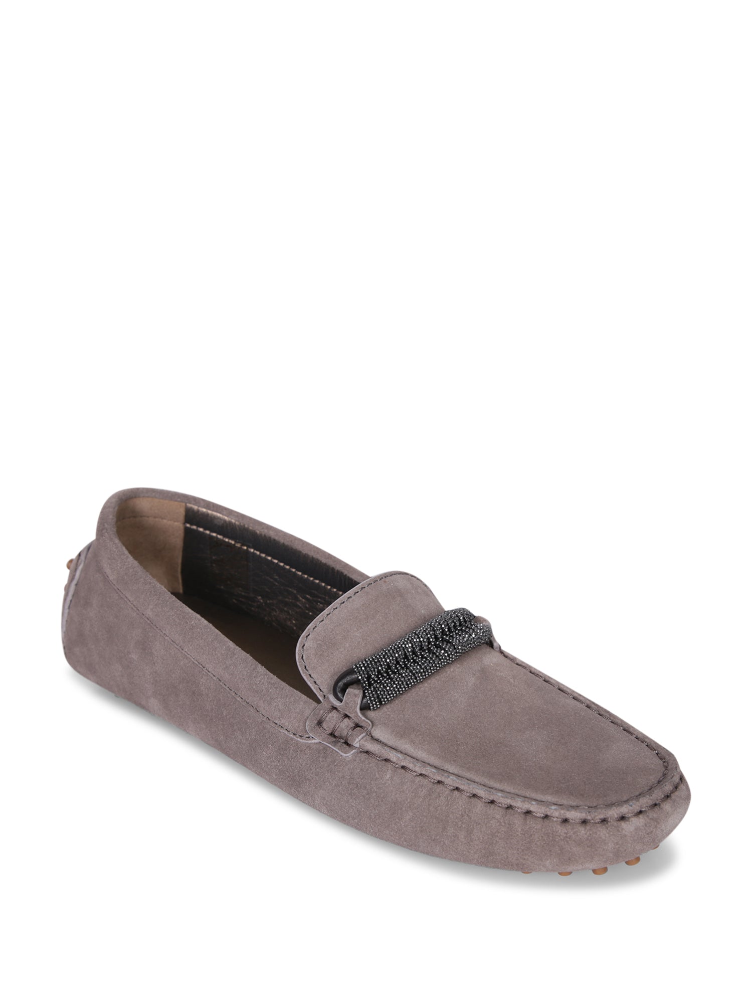 Grey suede loafer. Crystal buckle detail. Rubber pebble sole.