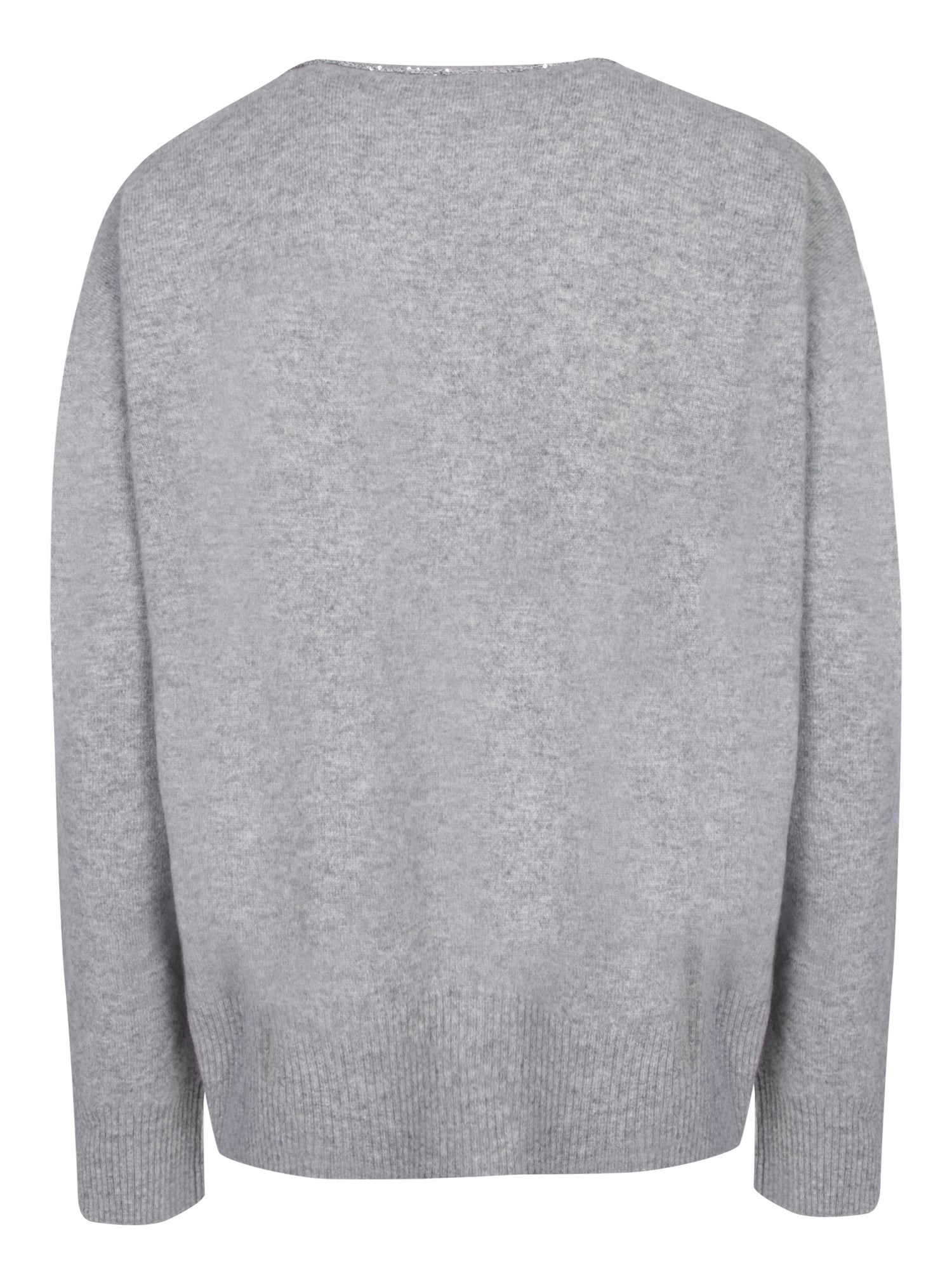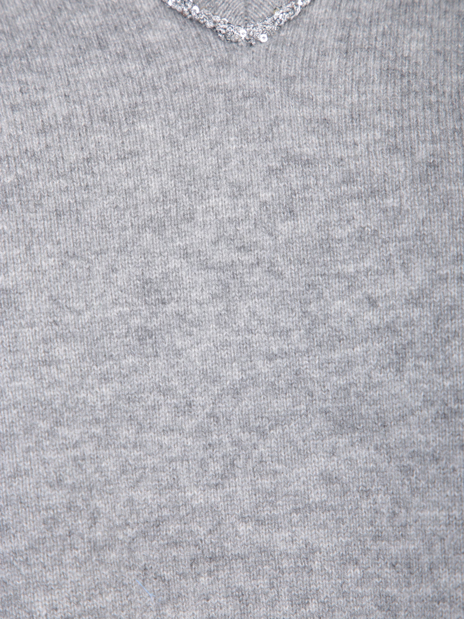 Long sleeve grey cashmere sweater. V-neck with sparkling appliques. Ribbed trims.