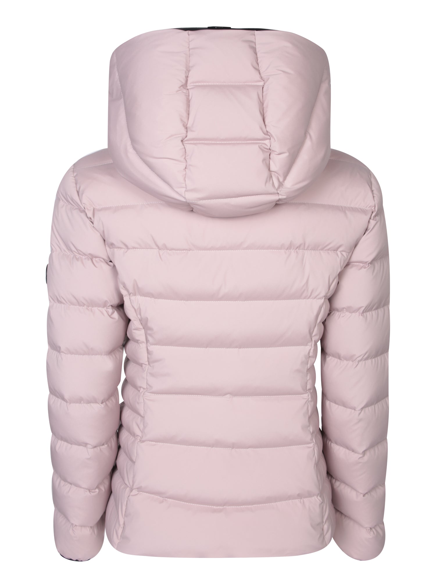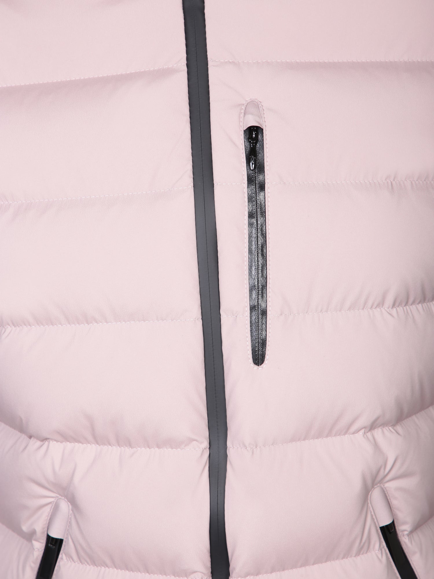 Padded down jacket. Removable hood with shiny interior. Side zip pockets.