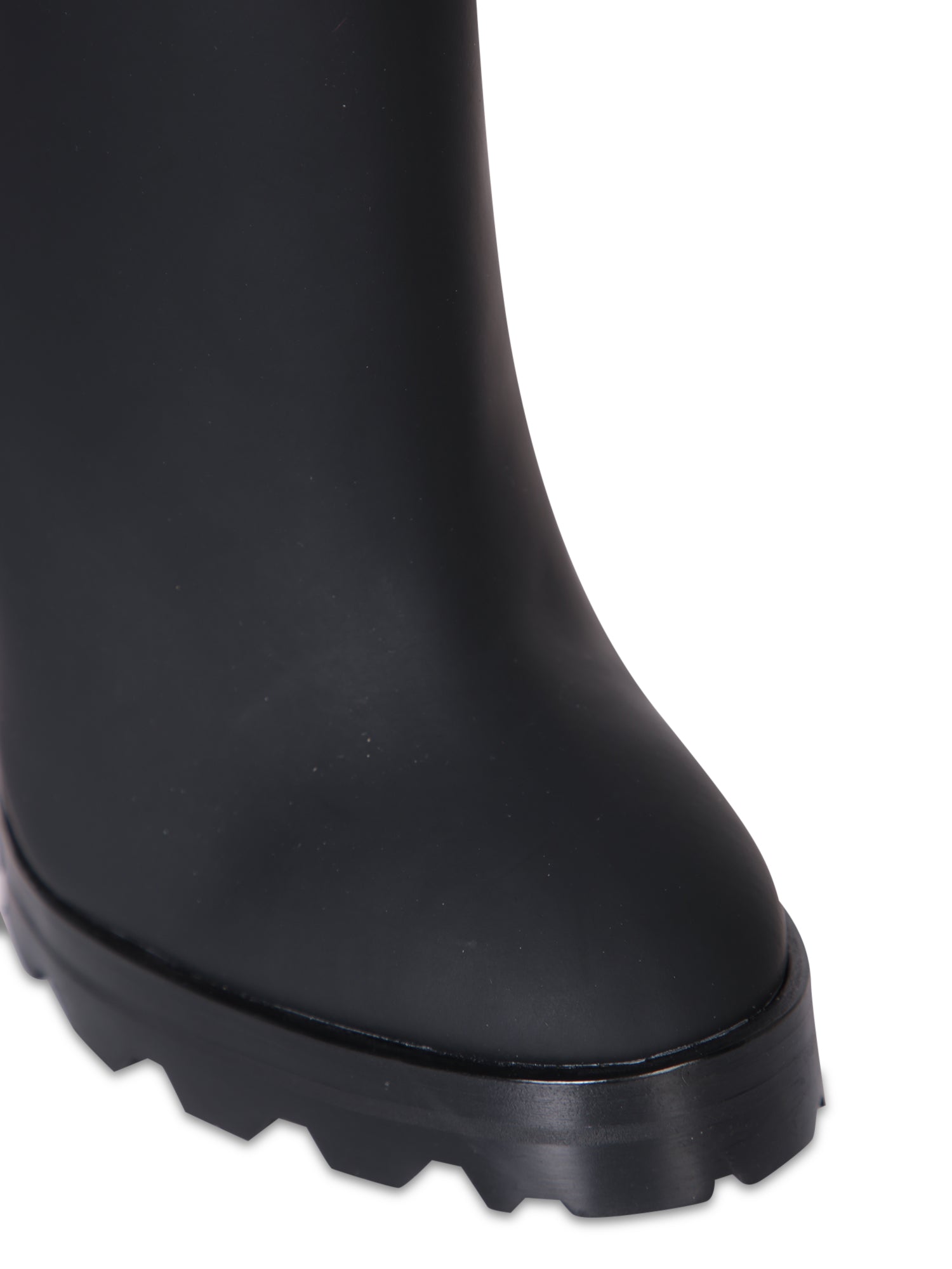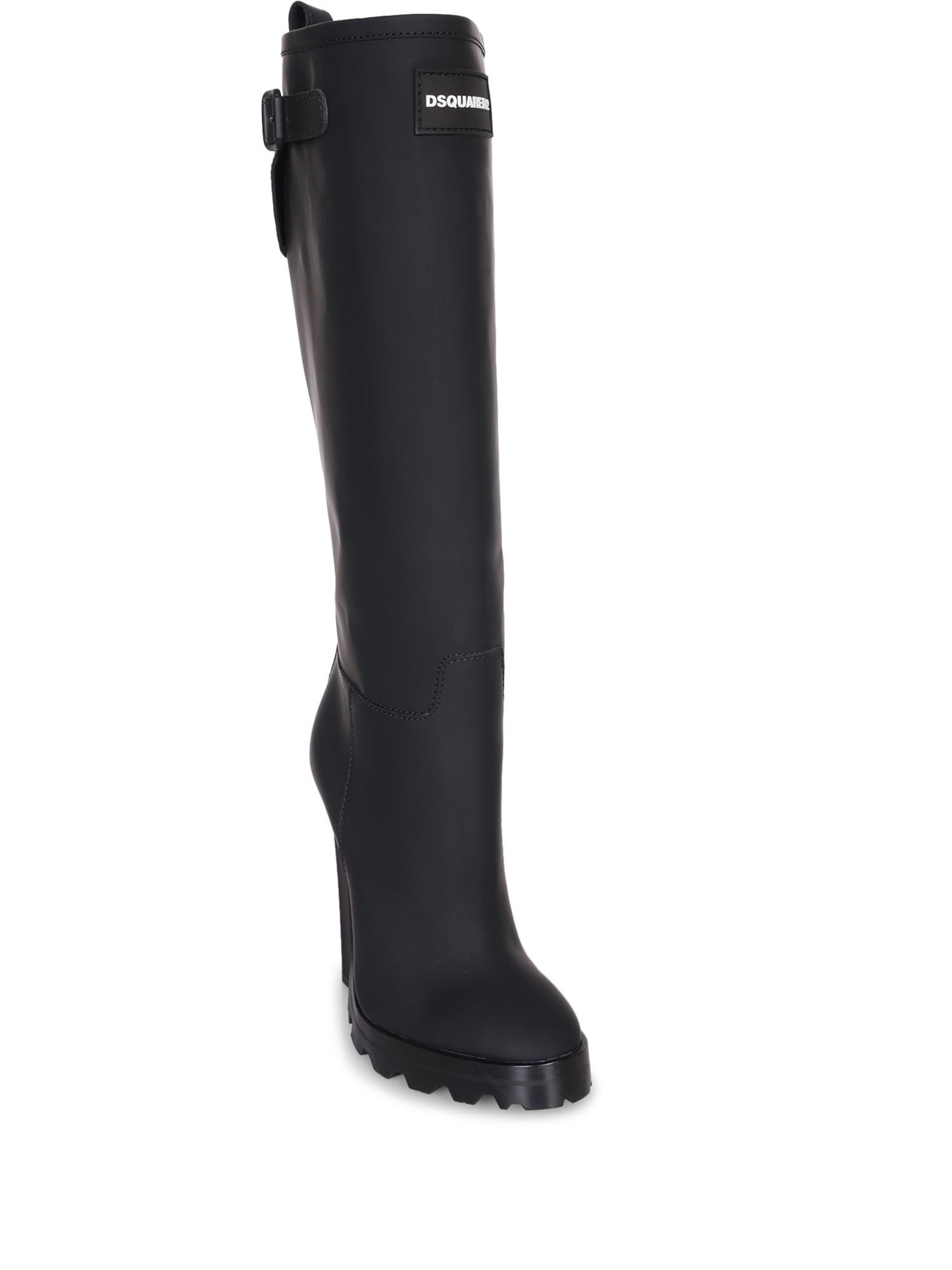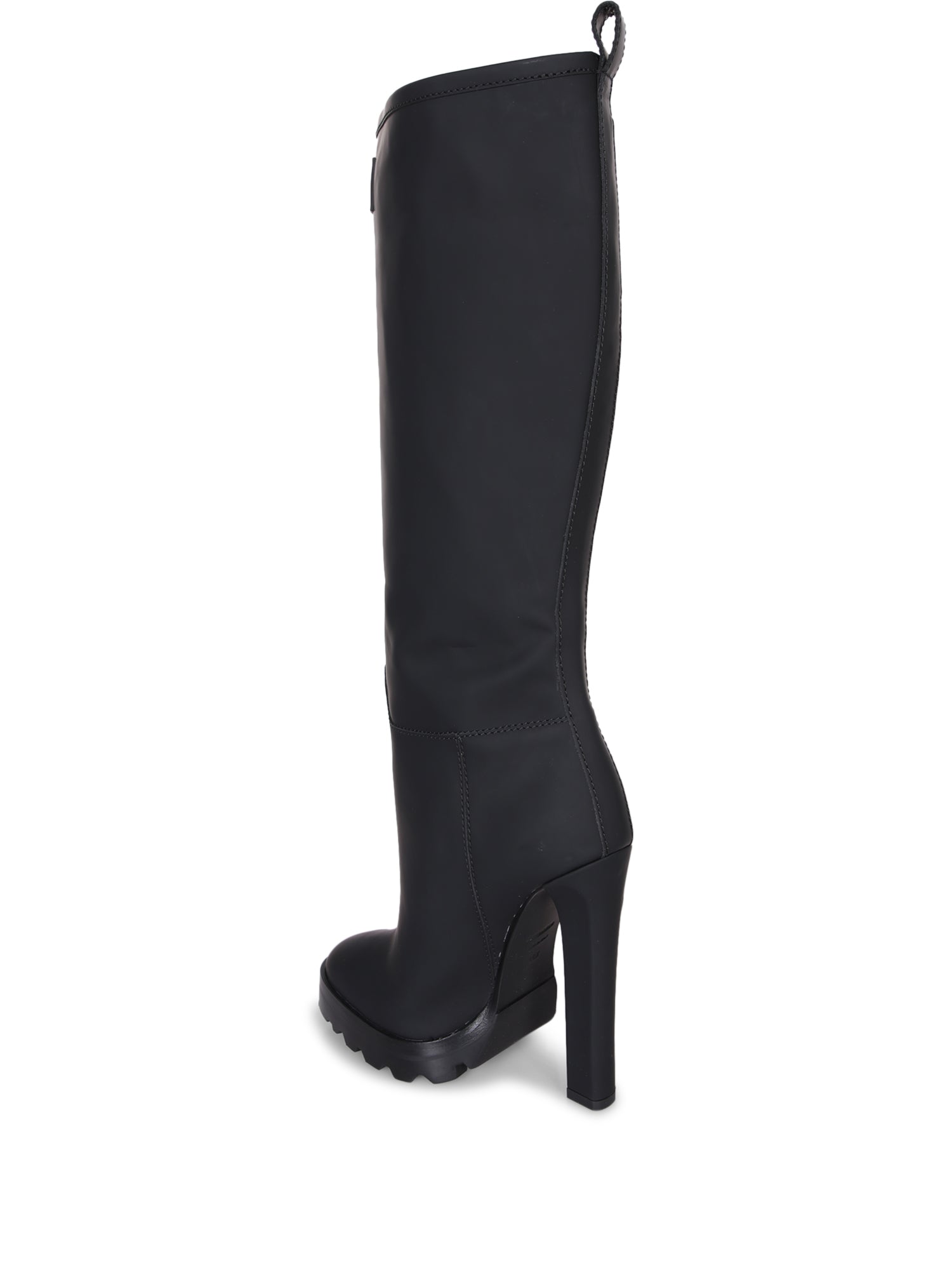 Knee-high boots in polished black rubber. High and sturdy heel, grooved sole for enhanced grip.