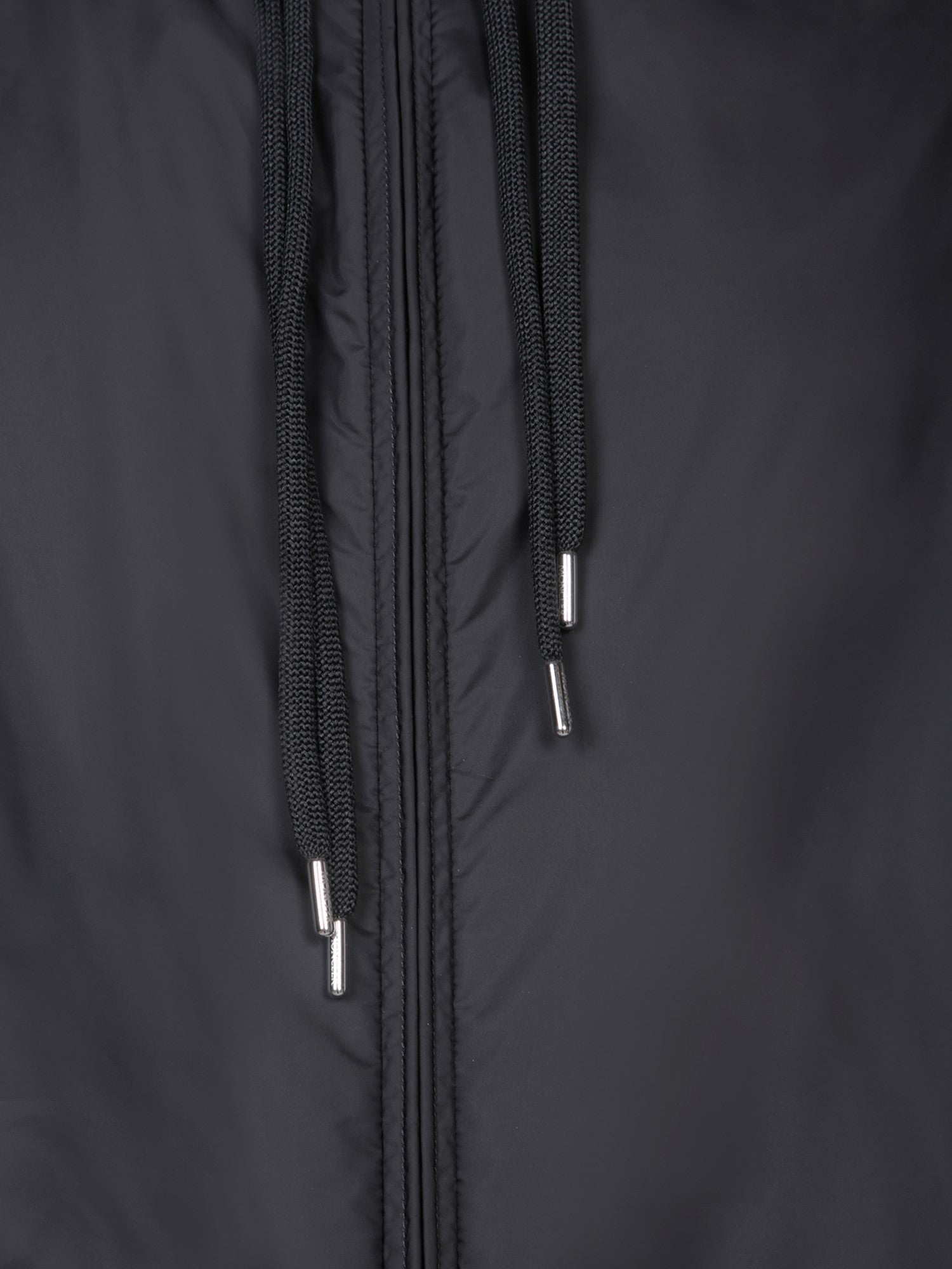 Drawstring hood, front zip closure, side zip pockets, elasticated cuffs.