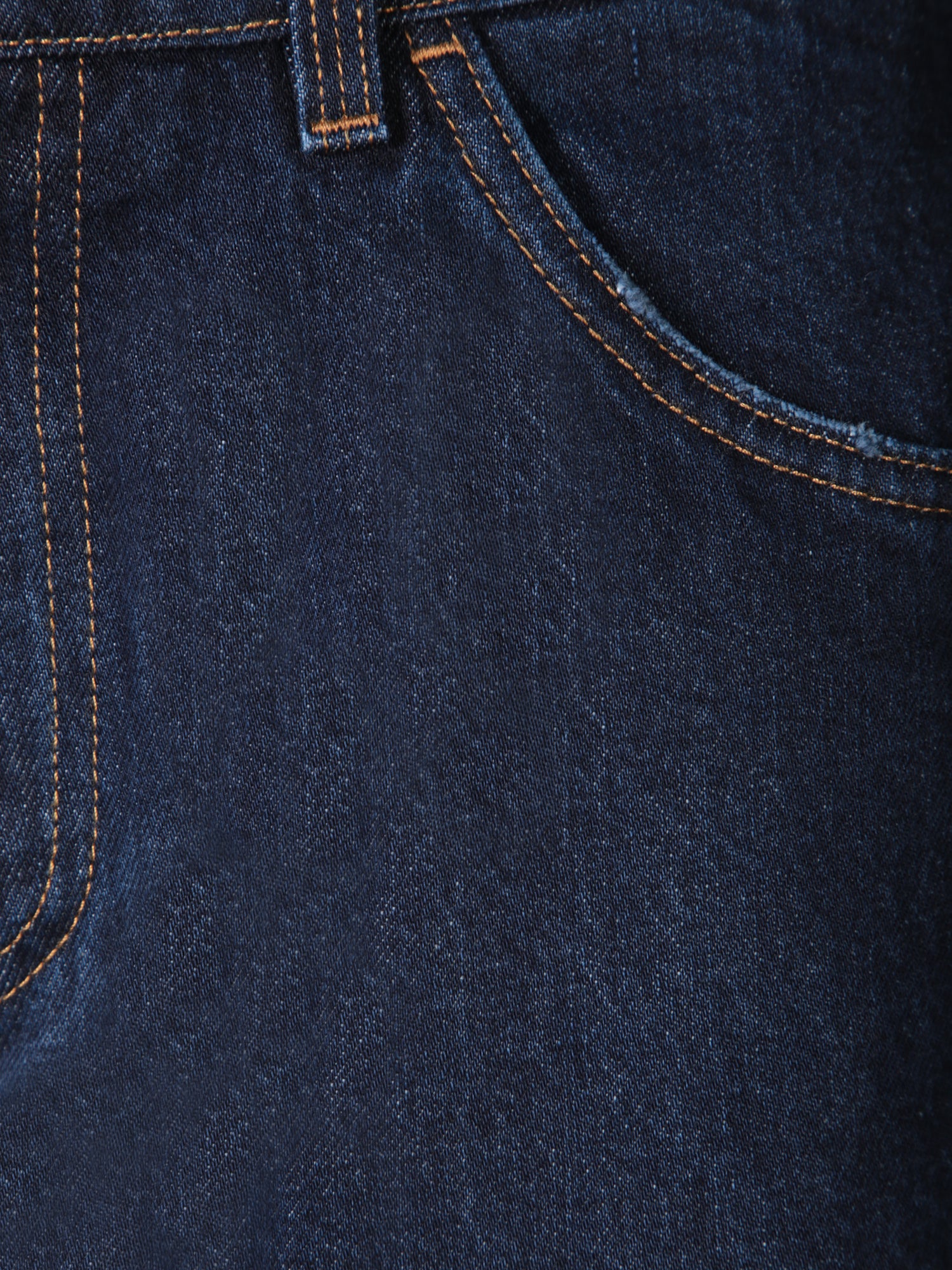 Cotton denim jeans, front and back pockets, brown leather pocket detail.