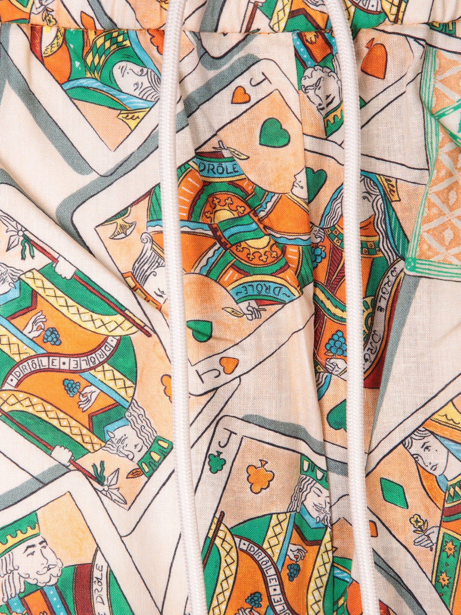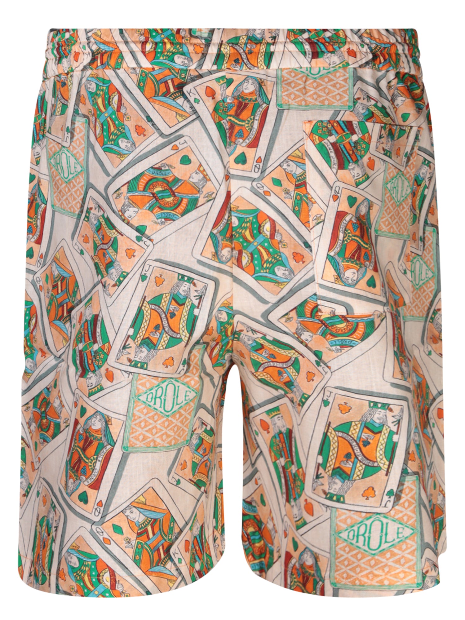 Lightweight fabric bermuda shorts with a multicolor playing card print. Elastic waist with drawstring. Side pockets.