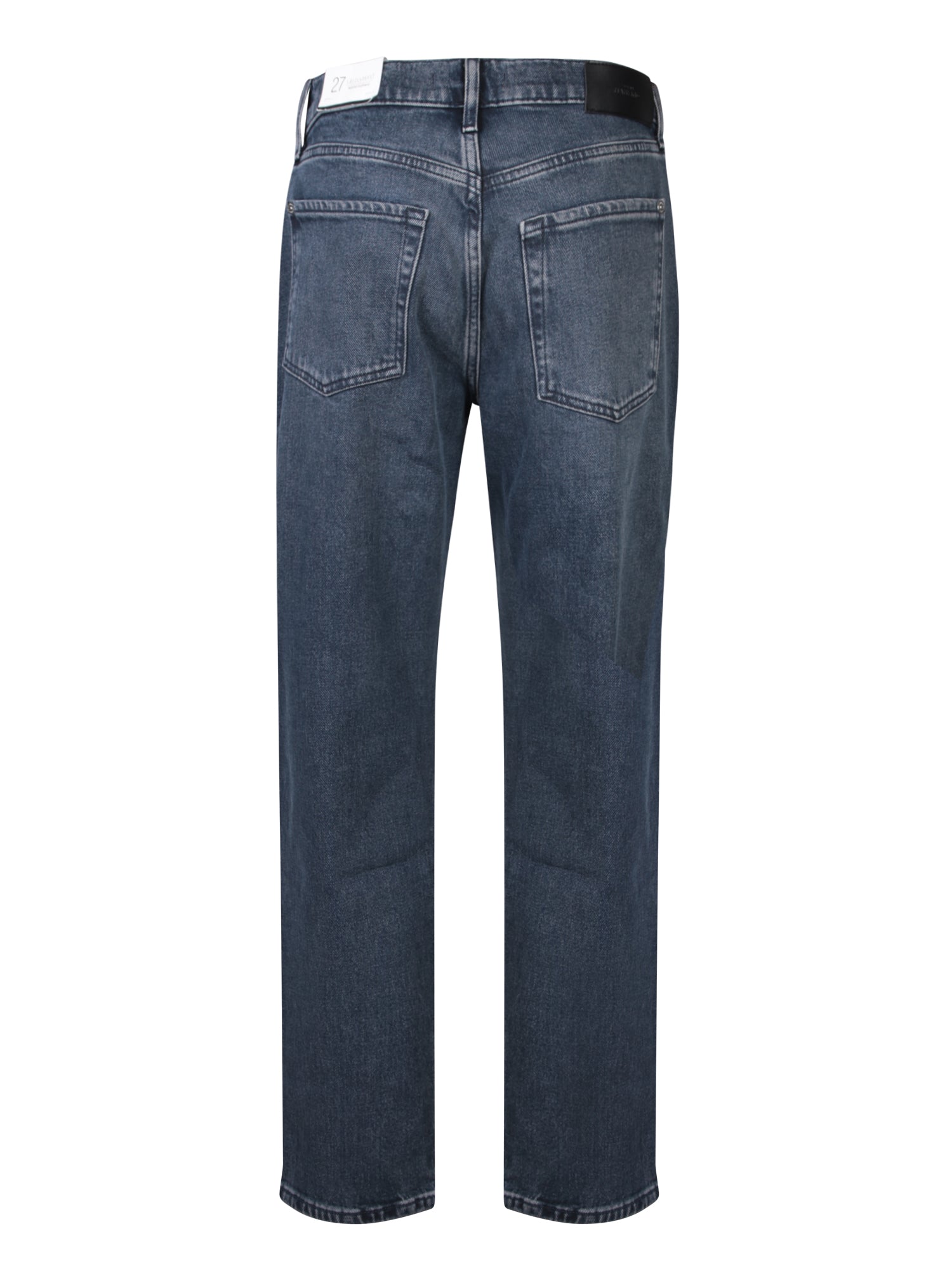 Mid-rise boyfriend jeans with a worn effect and stitched details. Front button and zip closure.