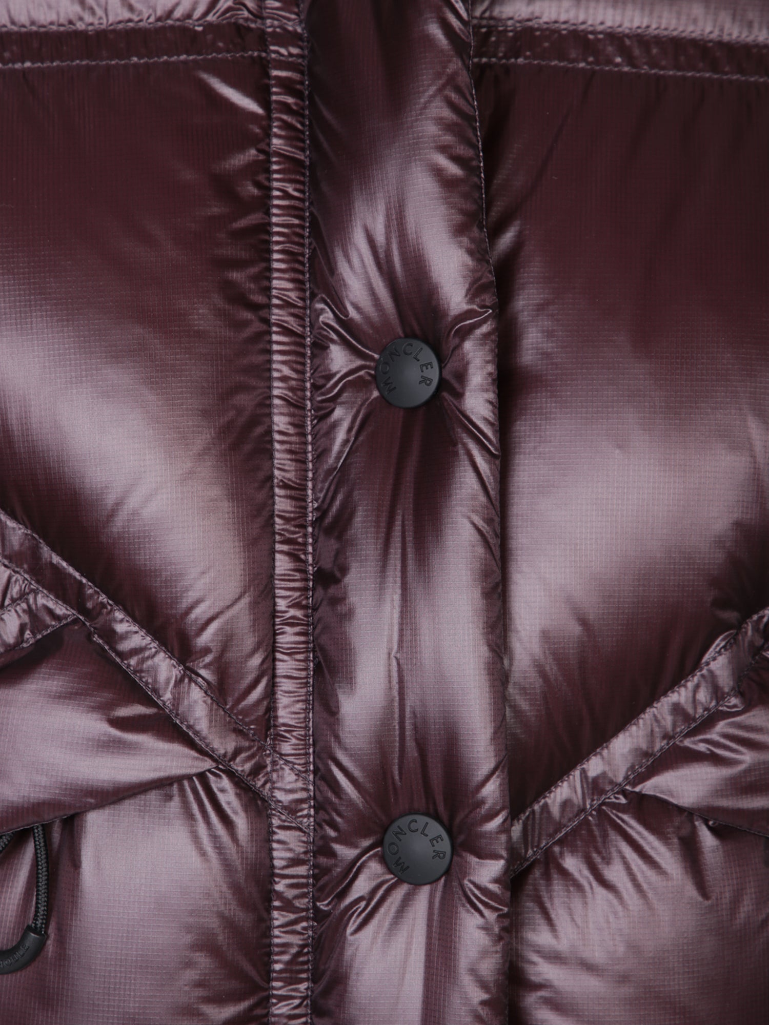 Padded bomber jacket with hood. Button front closure. Flap pockets.