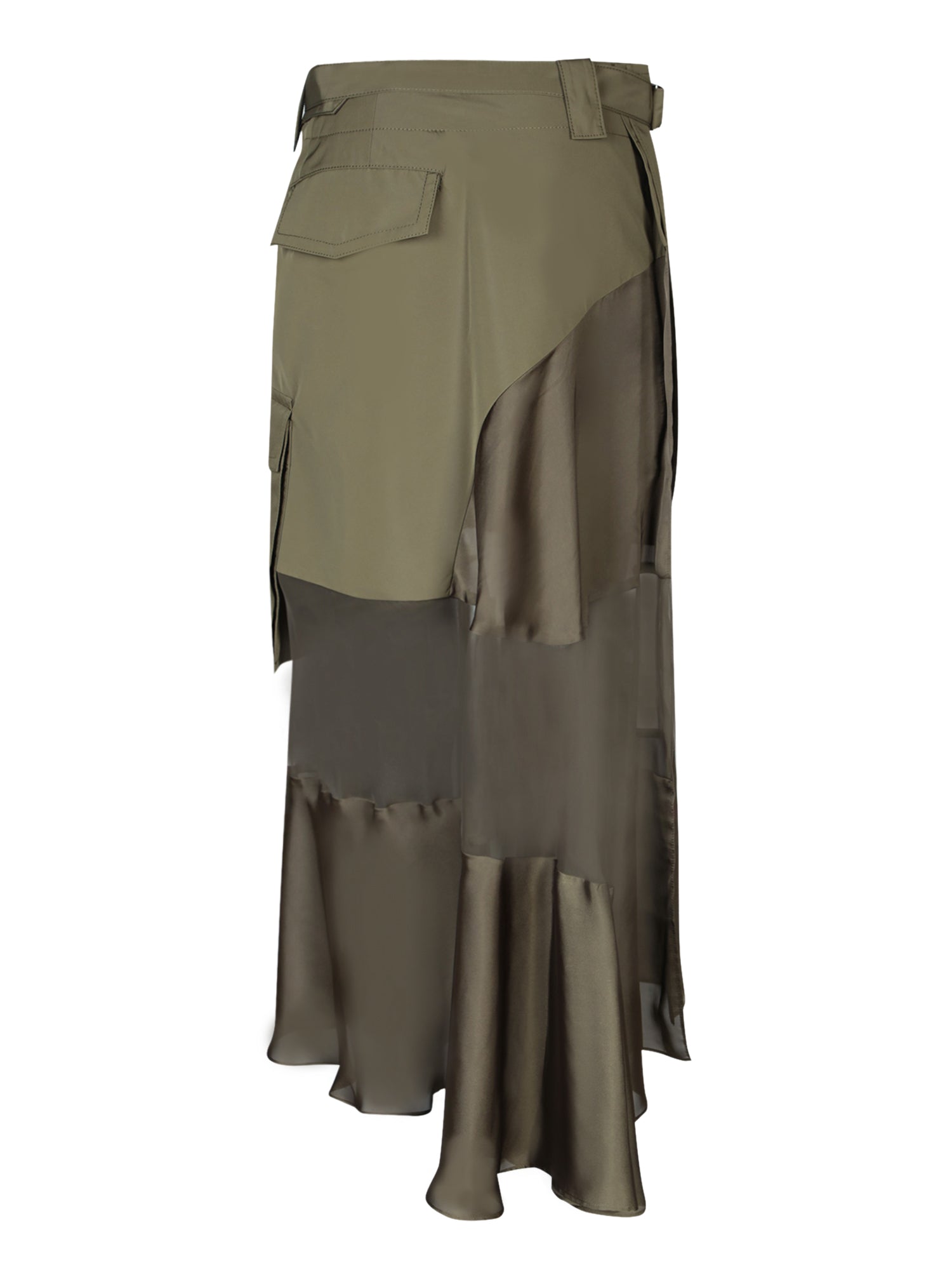Side zip closure waist, flap pocket, paneled design, asymmetrical hem.
