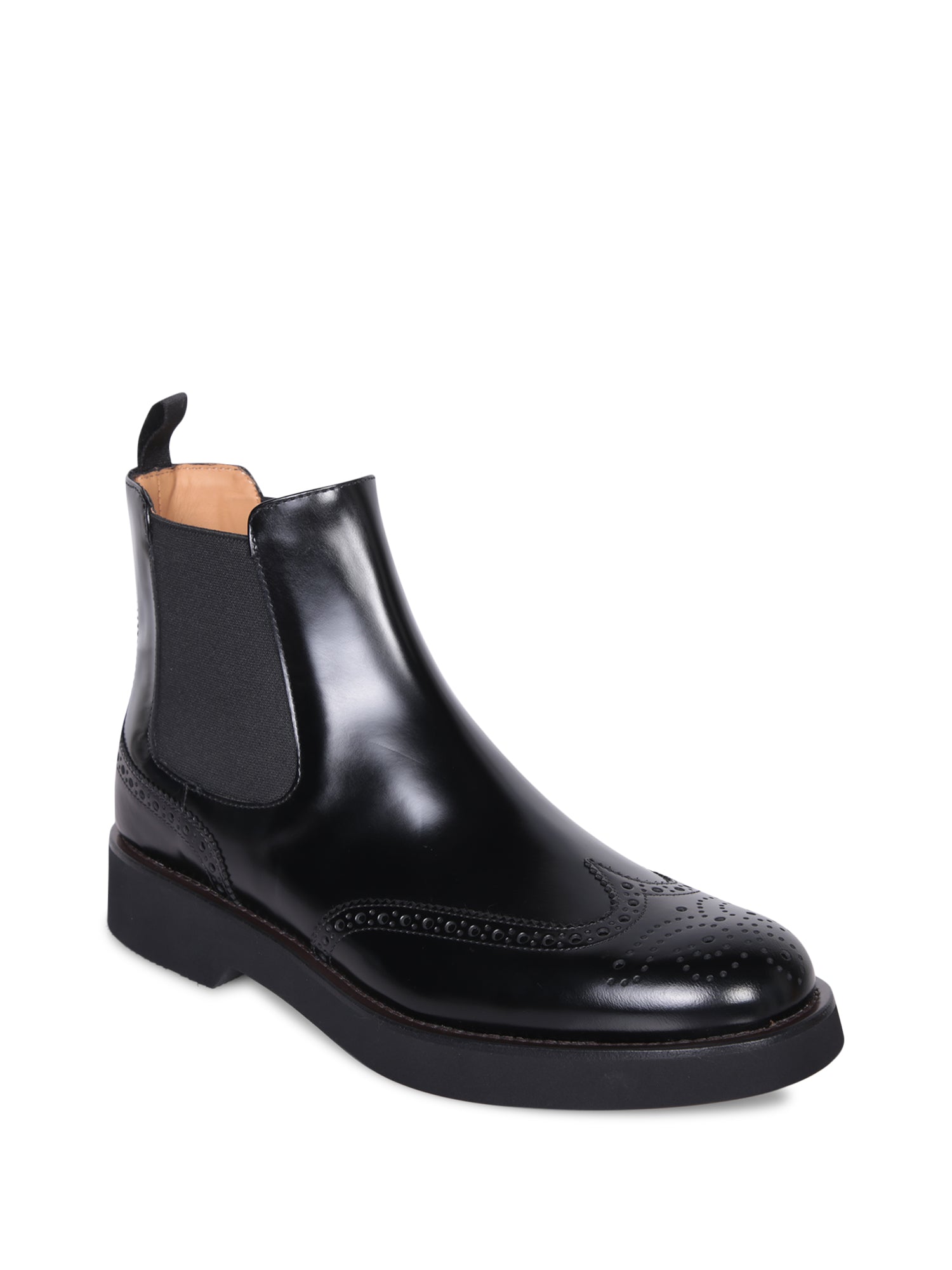 Shiny black leather ankle boots with side elastic panels. Features brogue detailing and a back pull tab.