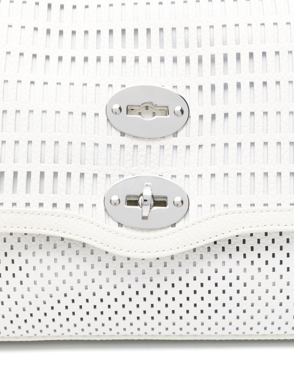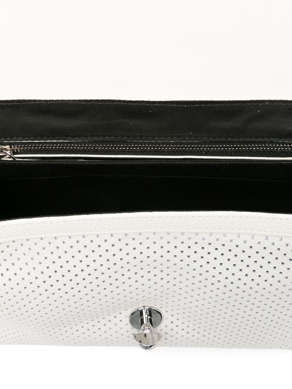 white twist-lock fastening single flat top handle adjustable detachable shoulder strap This piece comes complete with a protective dust bag.