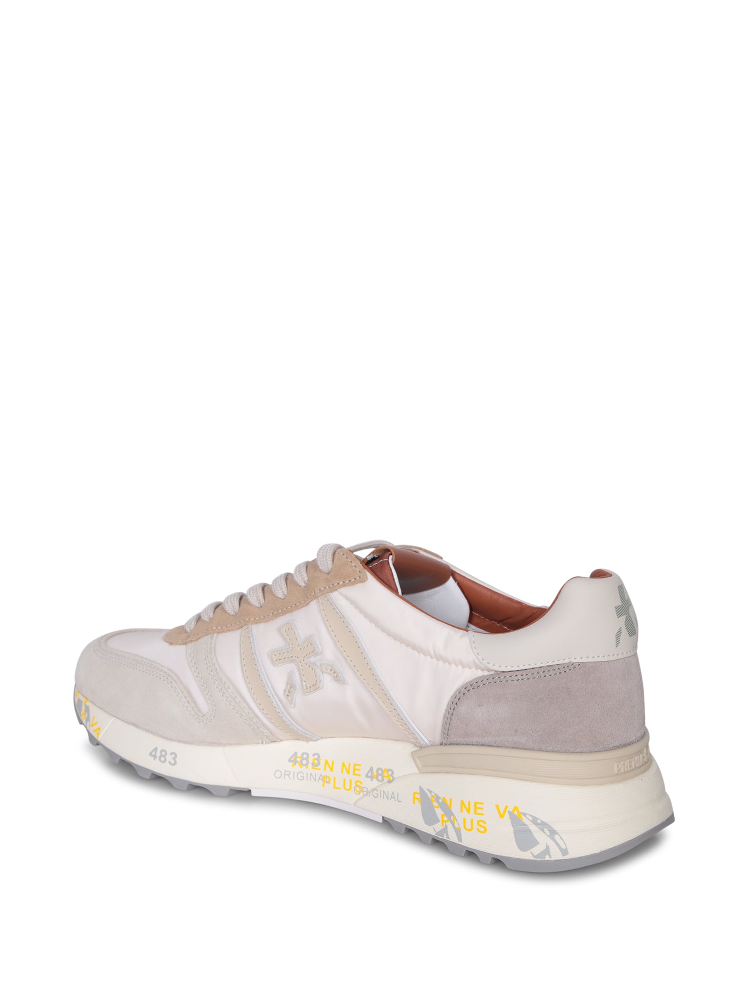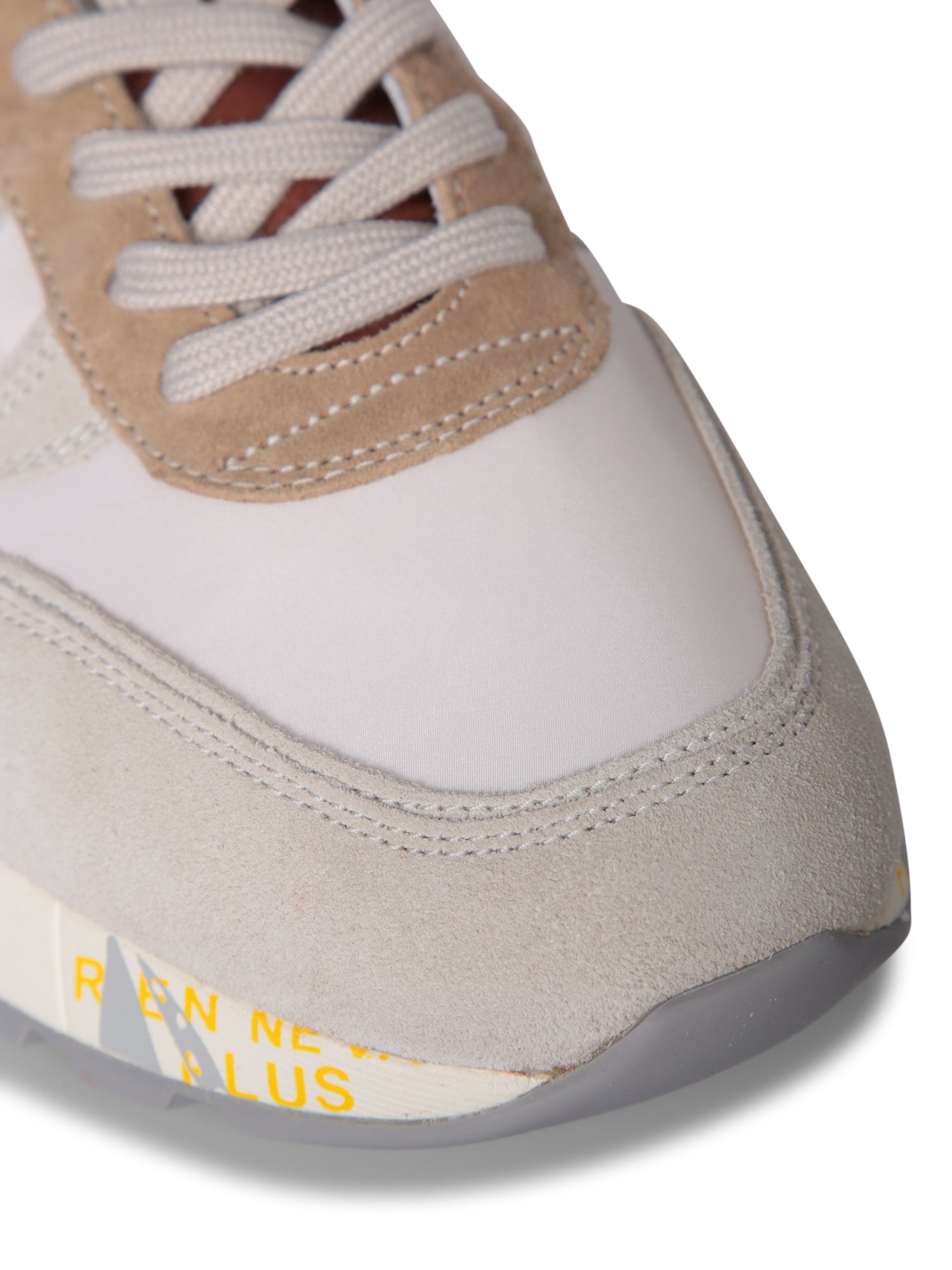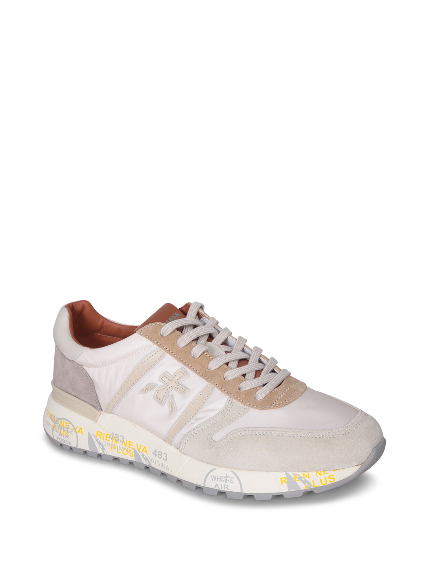 Beige leather and suede sneakers with white mesh details. Rubber sole, lace-up closure.