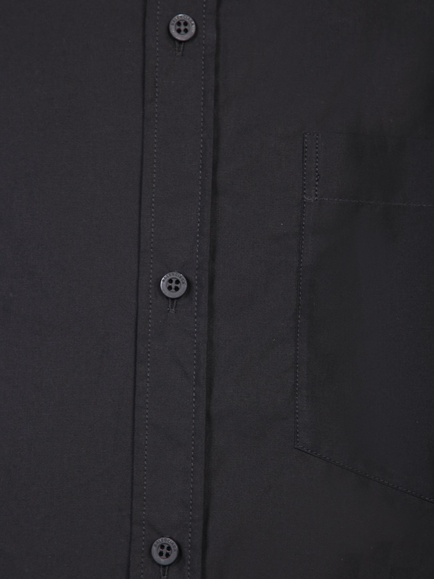 Black short-sleeve poplin shirt. Classic collar with front button closure. Single chest pocket.
