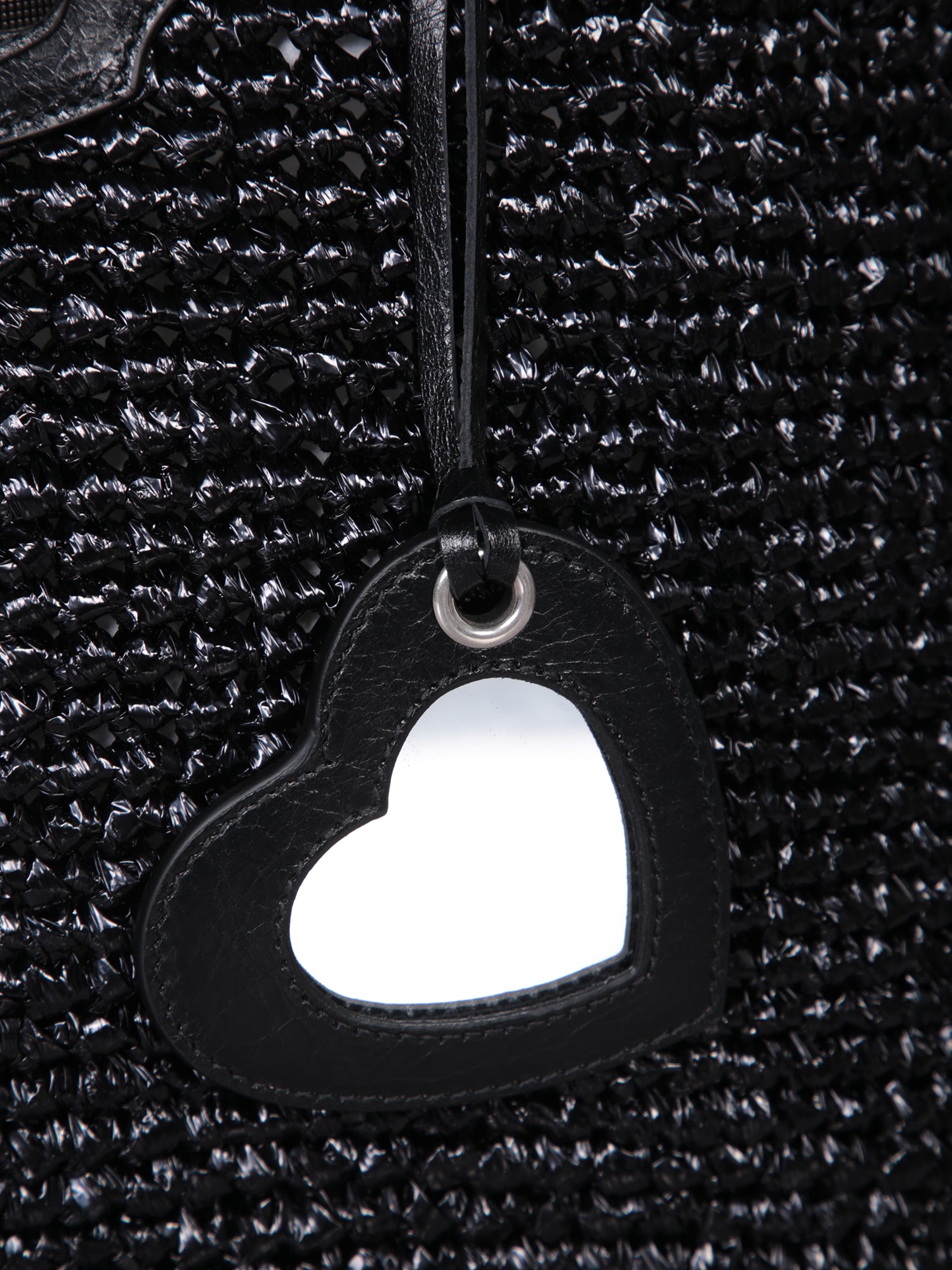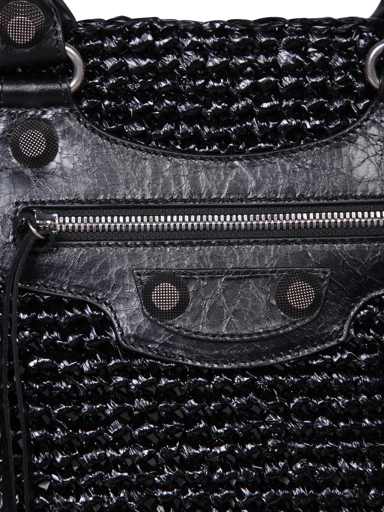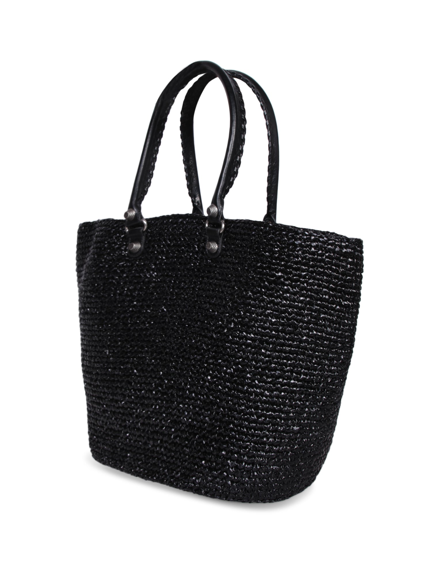 Spacious bag in woven fabric. Features leather handles and metal details.
