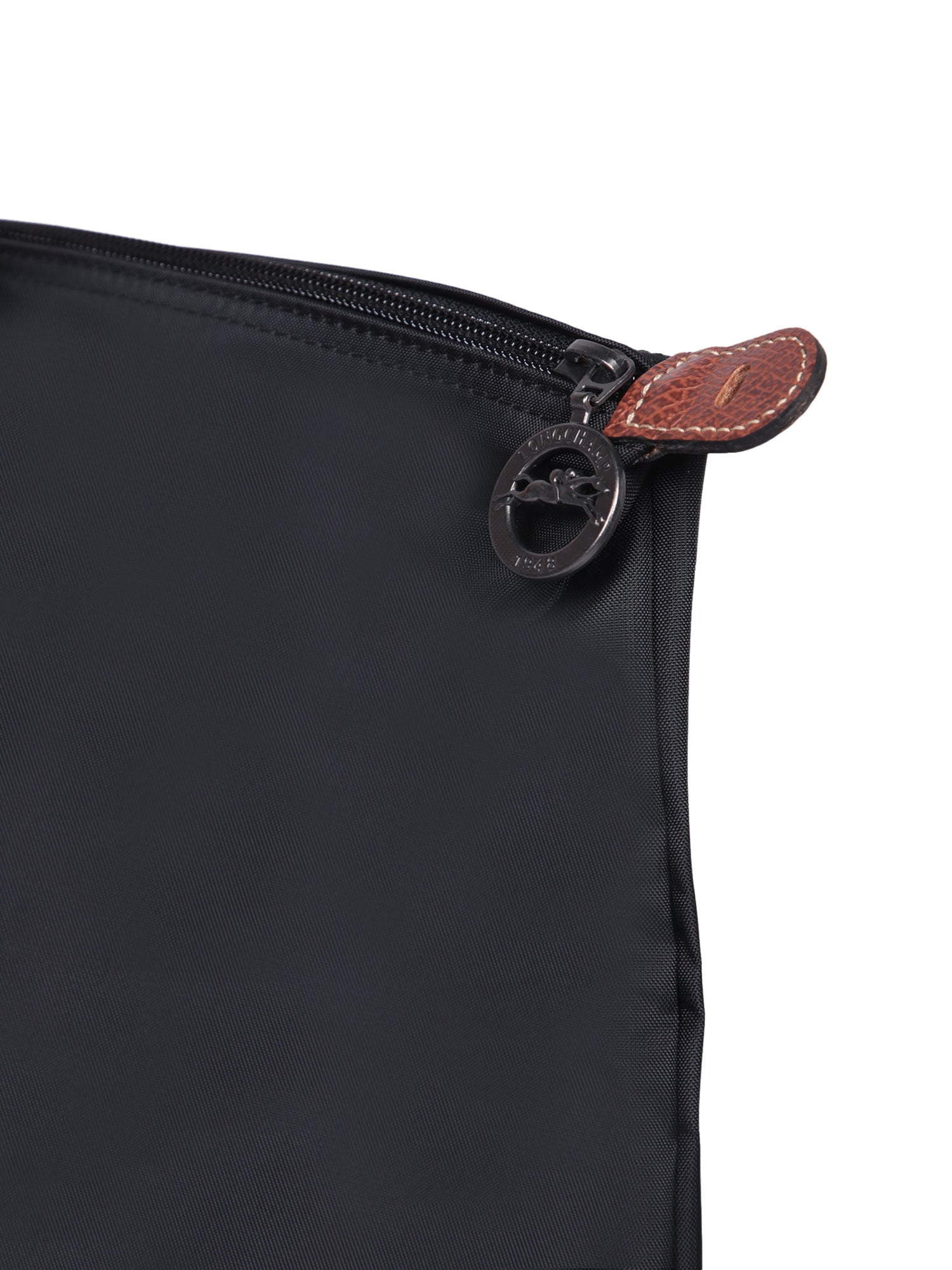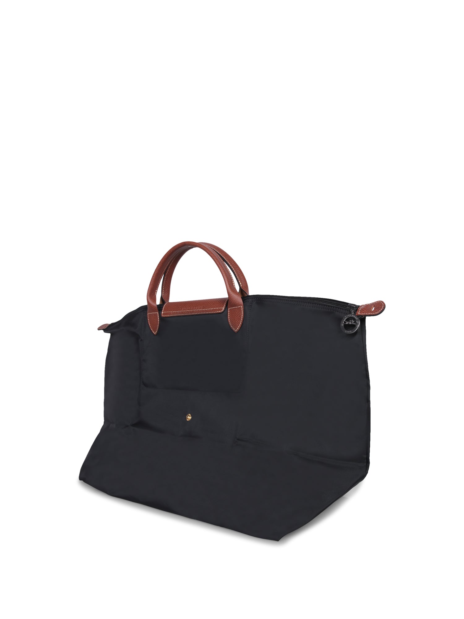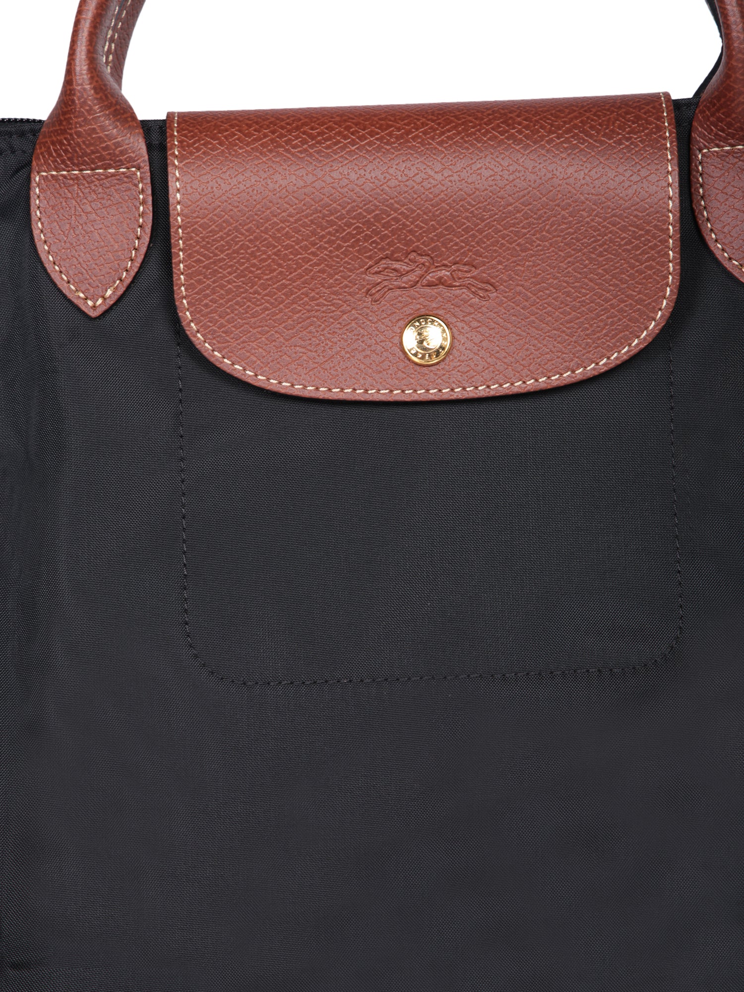 Lightweight and durable material. Brown leather handles and details. Top zip closure and snap button.