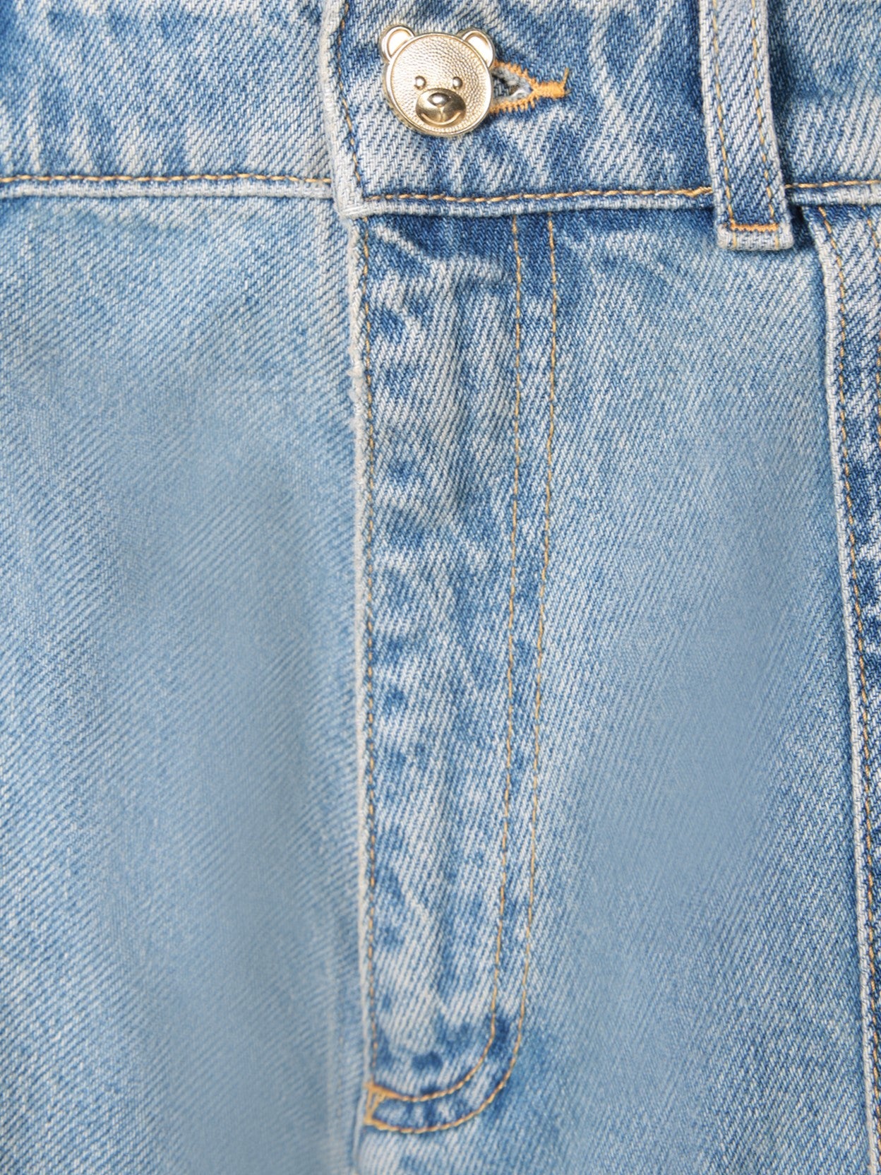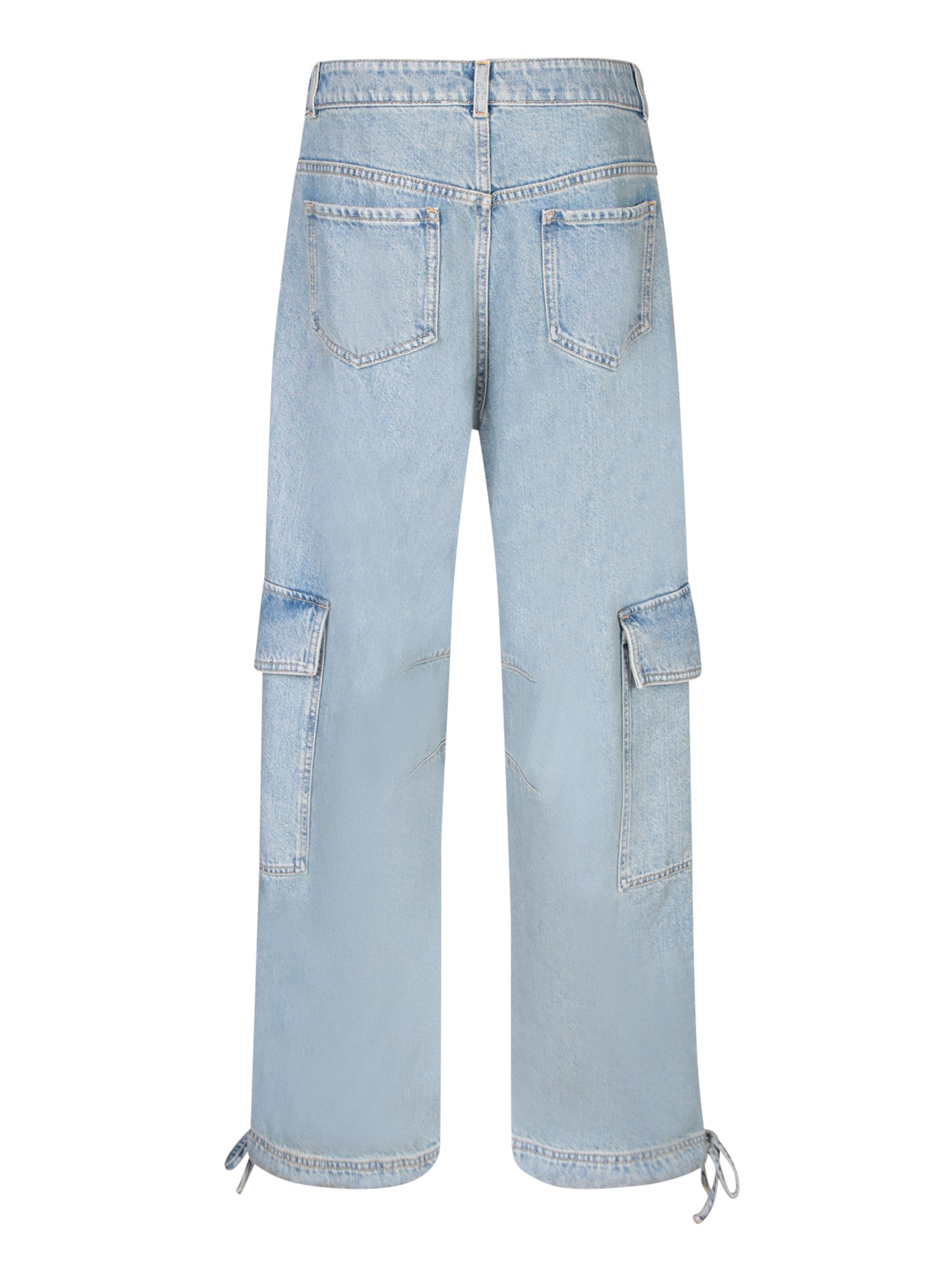 Light blue denim jeans featuring cargo pockets. Button front closure. Adjustable drawstring details at ankles.