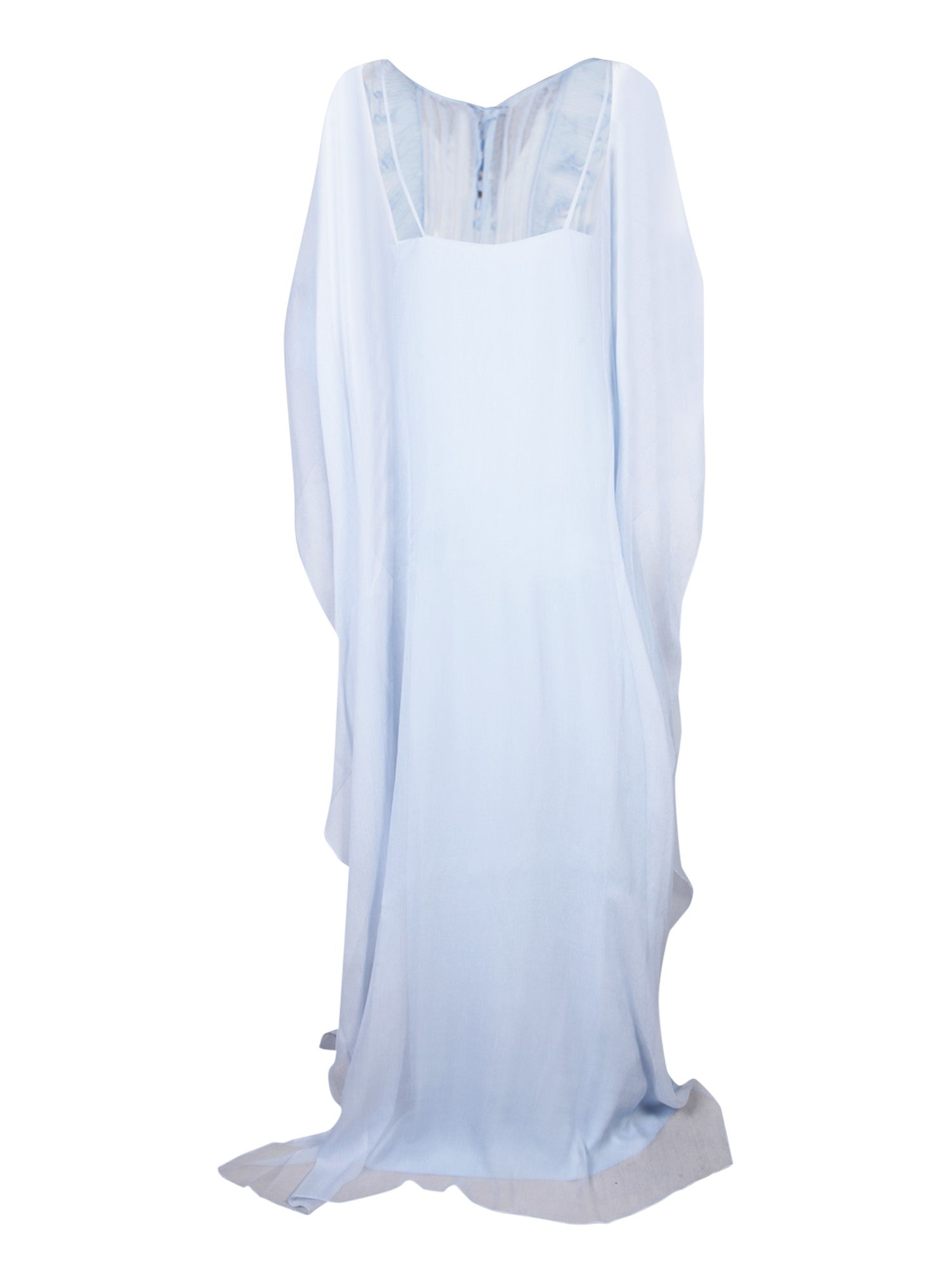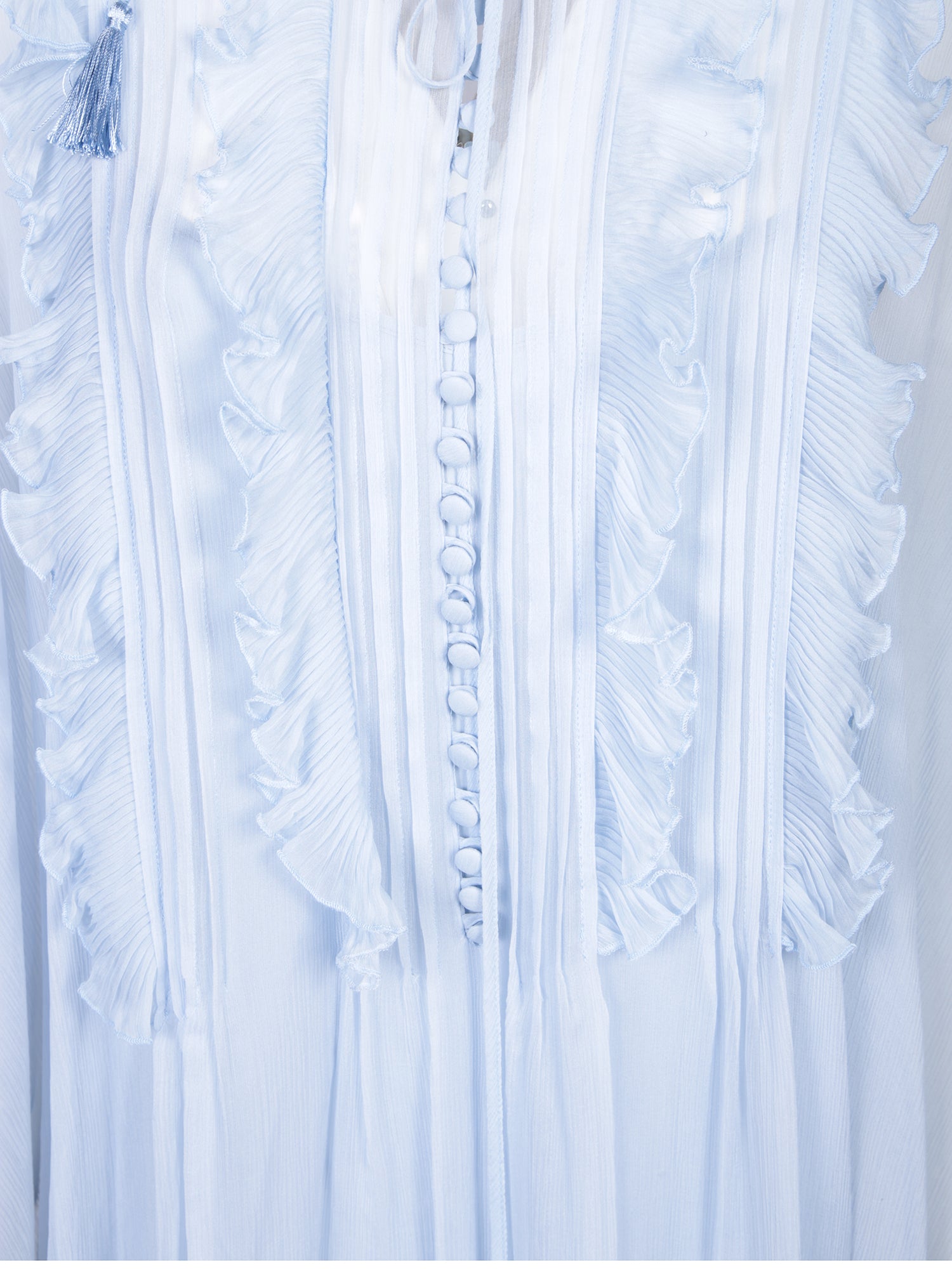 Lightweight organza kaftan with ruffle details and solid color finish. Wide sleeves and neckline with decorative laces.