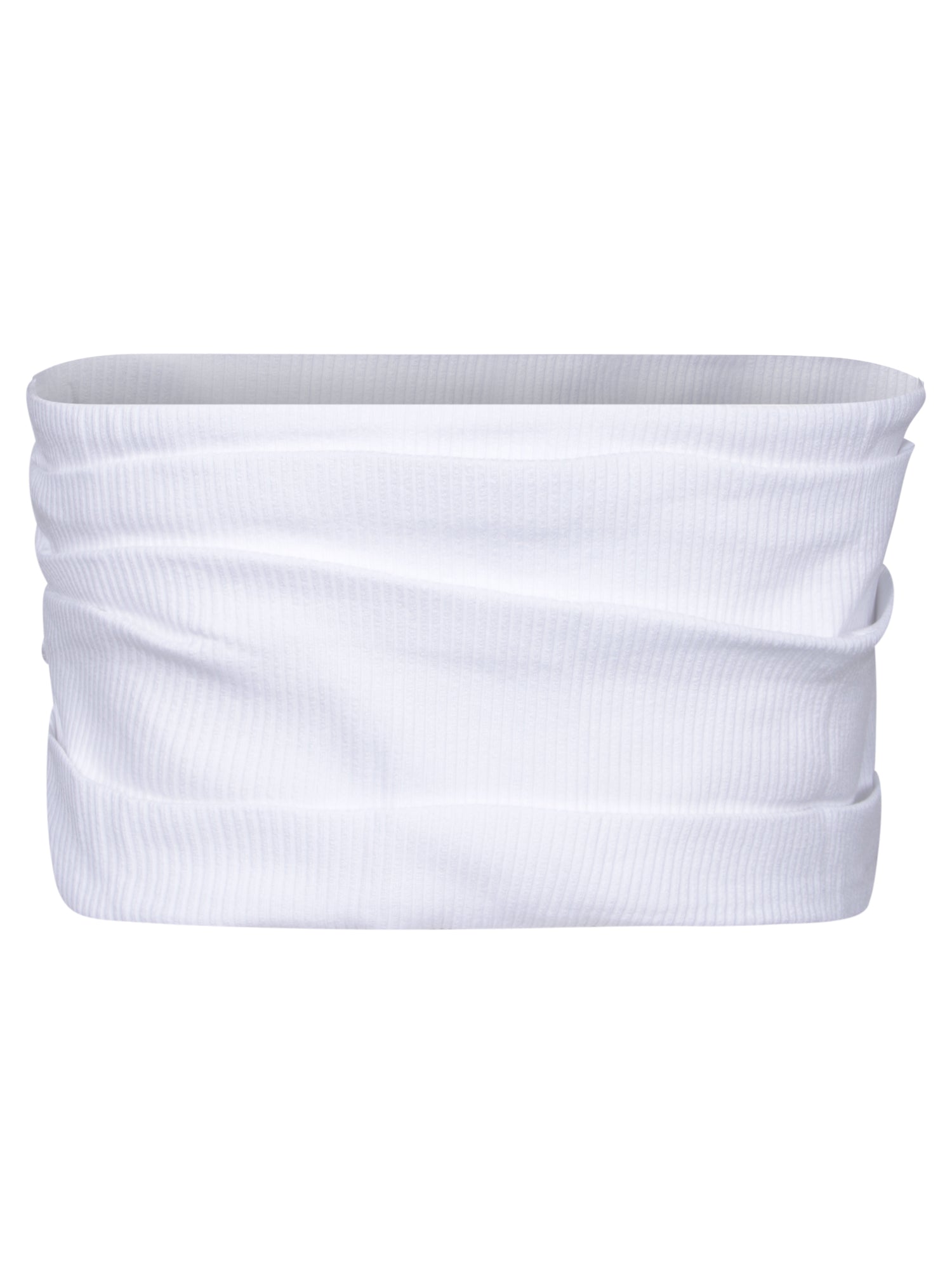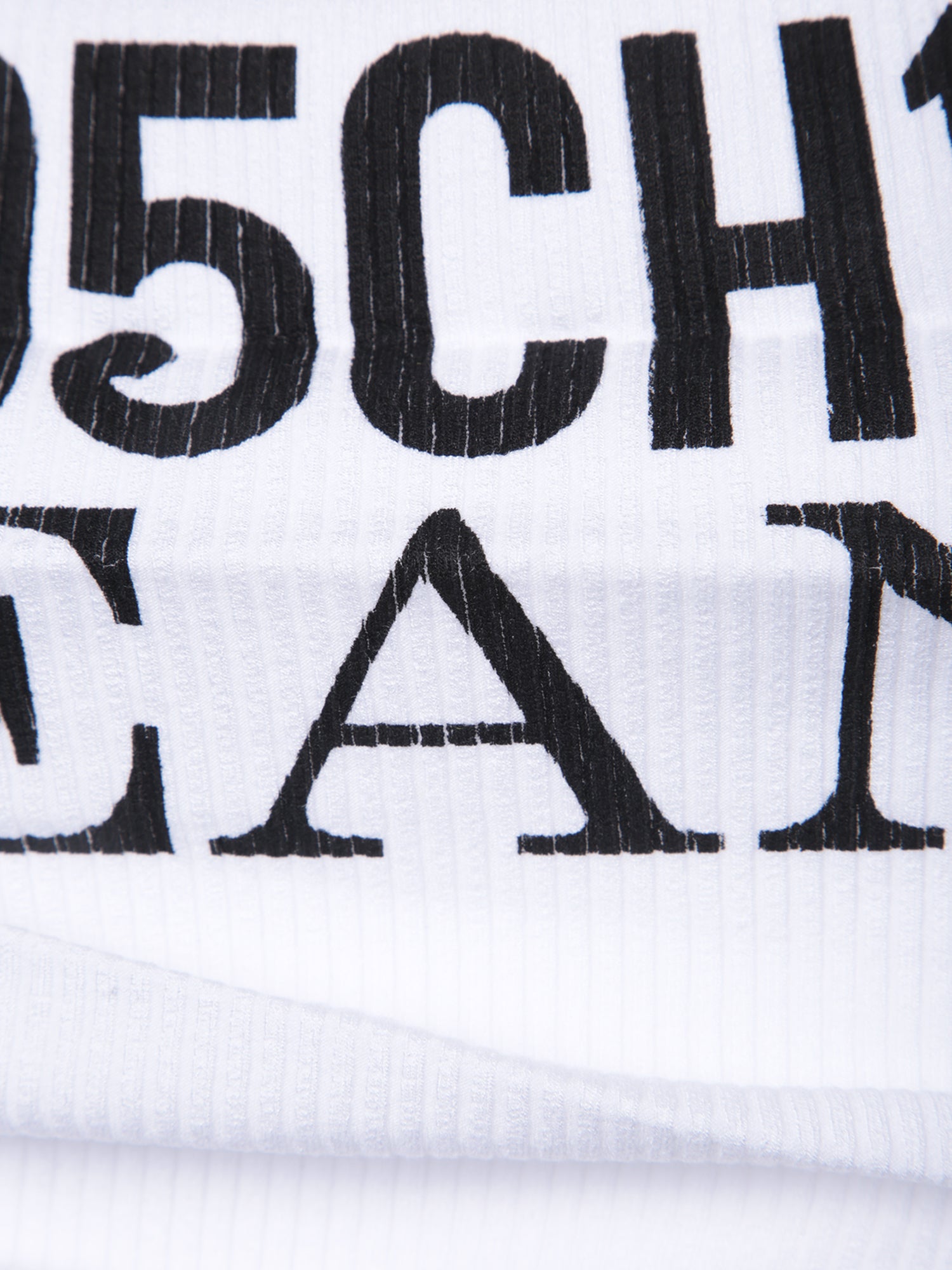 Stretch fabric bandeau top. Features black printed Moschino logo.