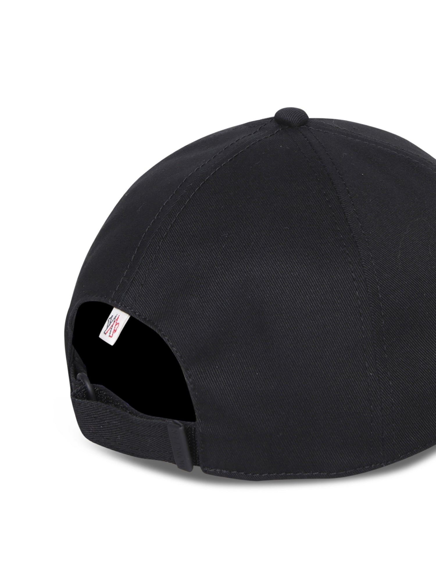 Black technical fabric baseball cap with white and red embroidered logo. Curved visor. Adjustable closure.