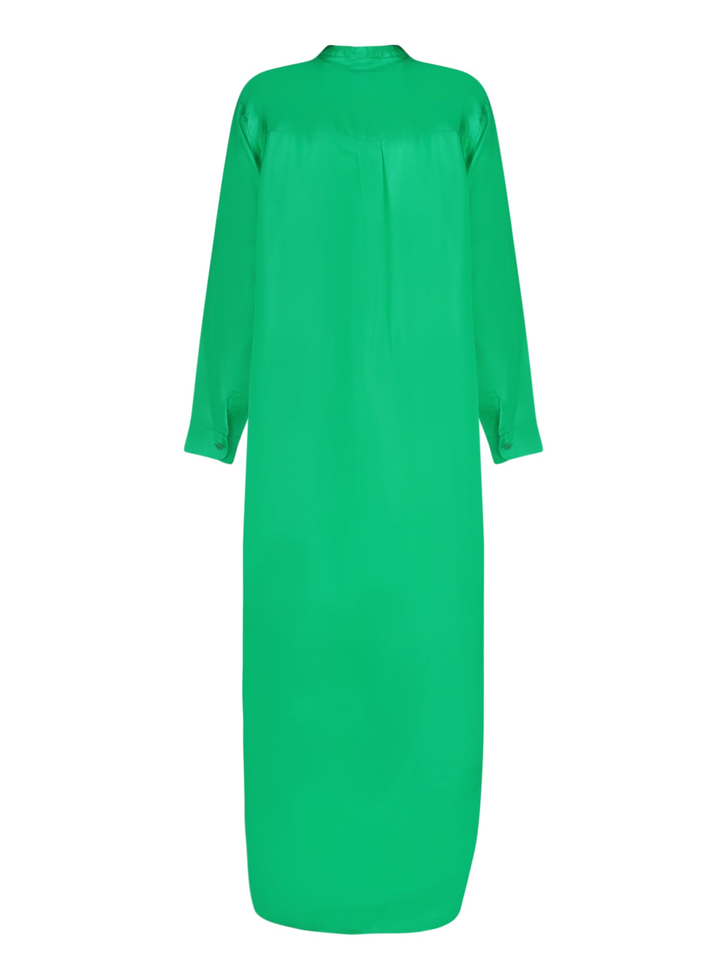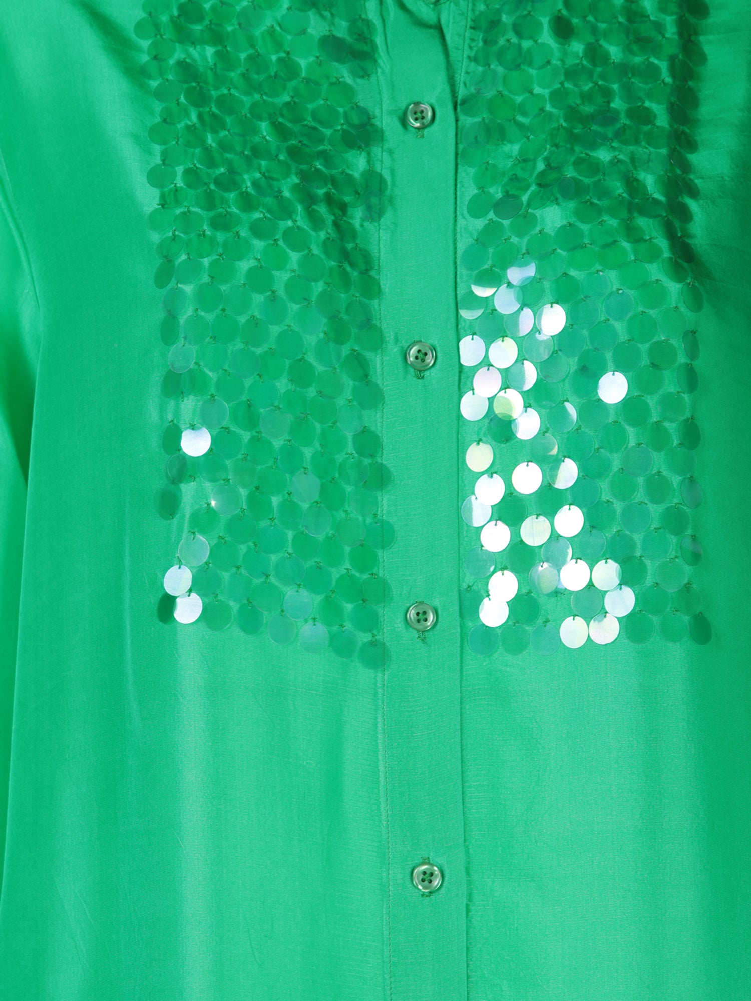 This elegant green dress by P.A.R.O.S.H. features a charming silk surface enhanced with a panel of green sequins on the chest, offering a touch of delicate shimmer. The simple, flowing silhouette culminates in a full-length hidden button closure.