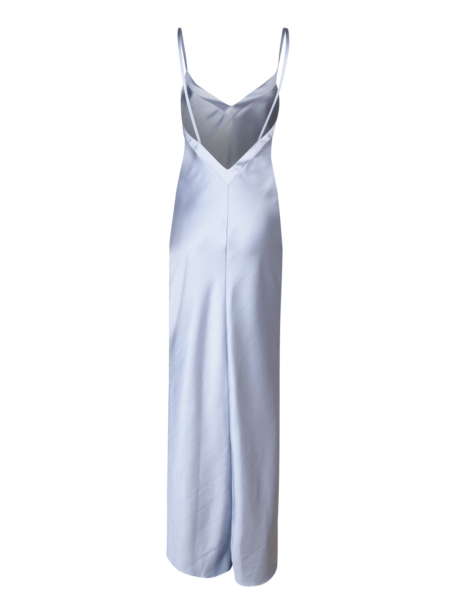 Fluid fit, adjustable thin straps, mid-calf length. Solid shiny satin color.
