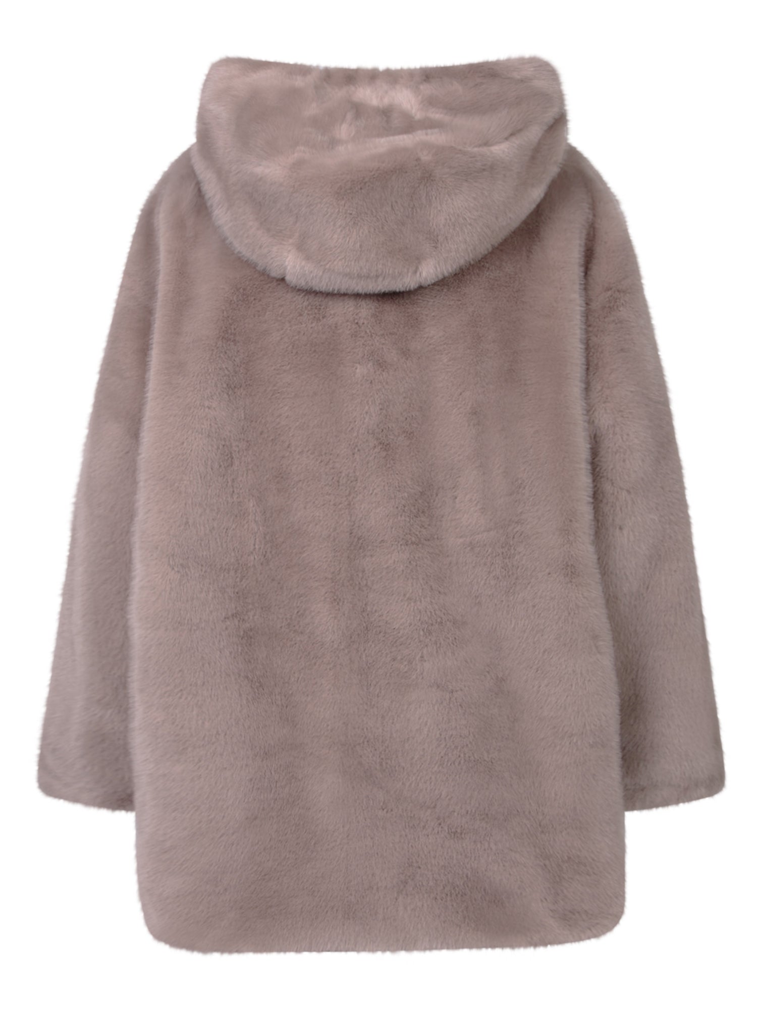 Long faux fur parka. Front zip closure. Integrated hood.
