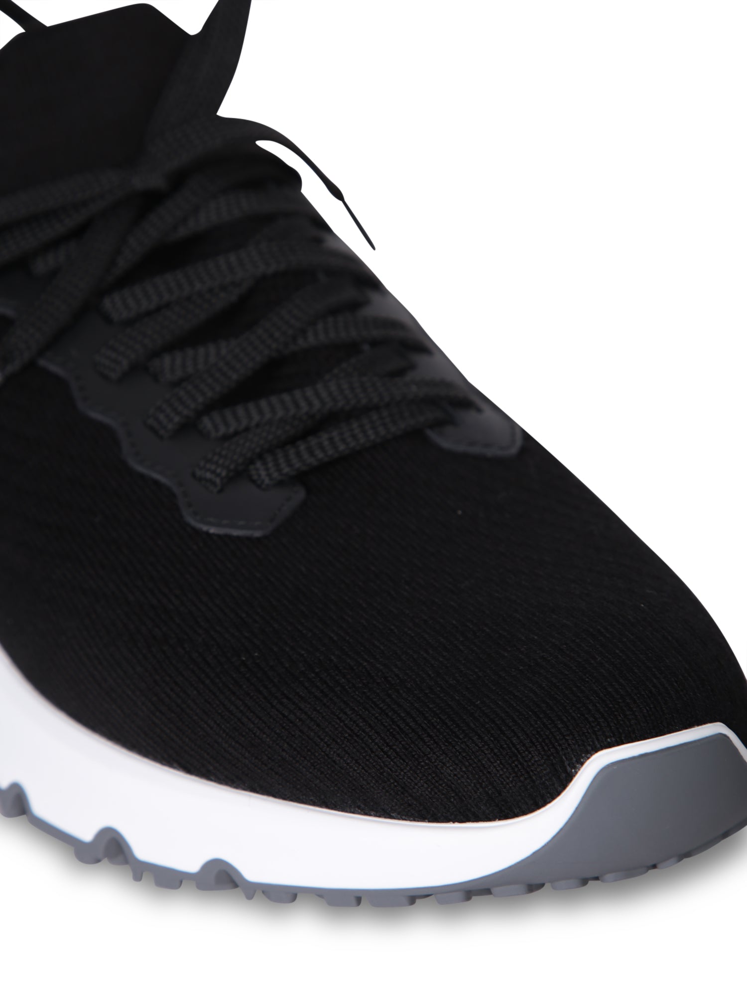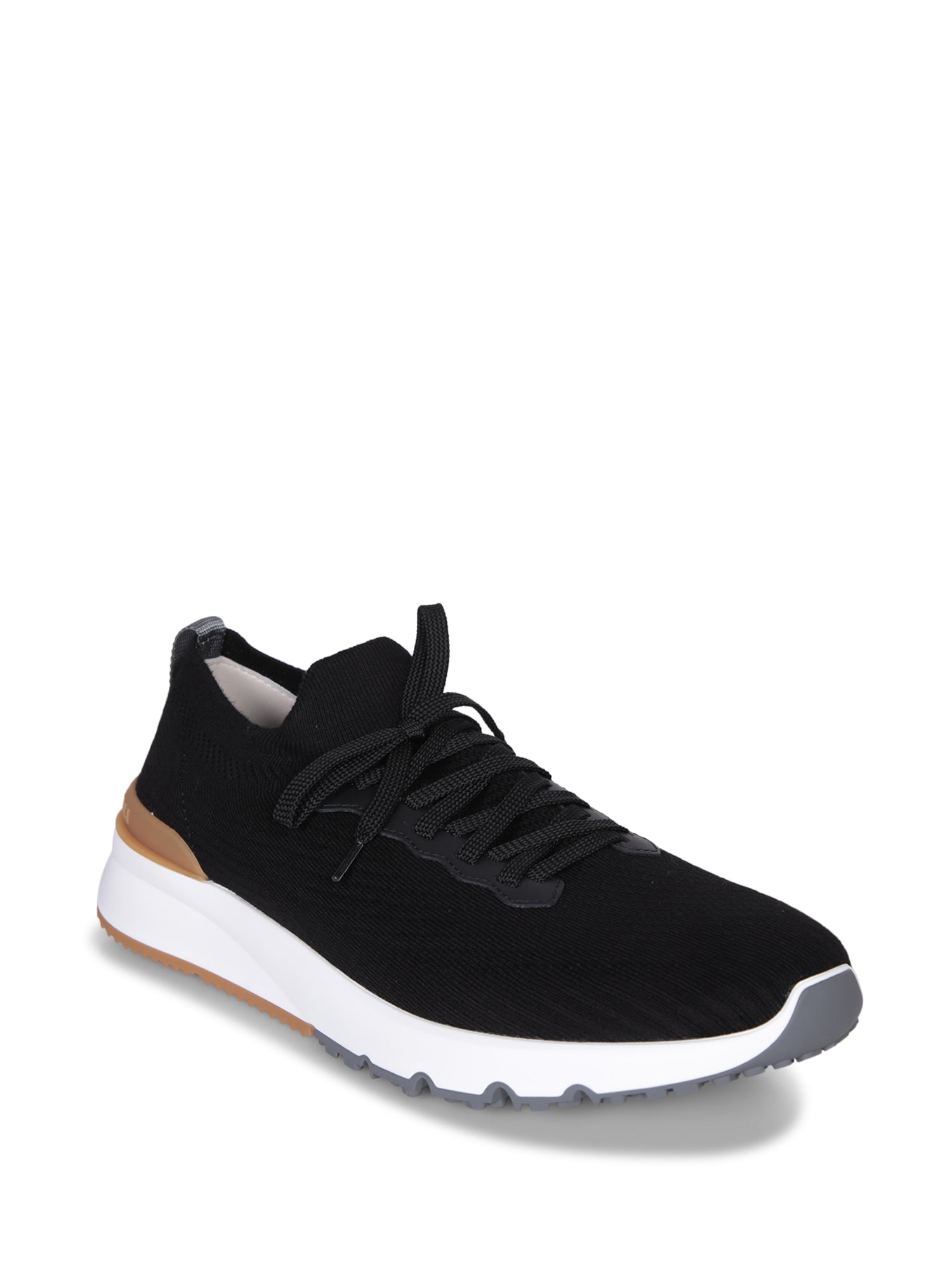 Black knit upper. White midsole with caramel insert. Non-slip rubber sole.
