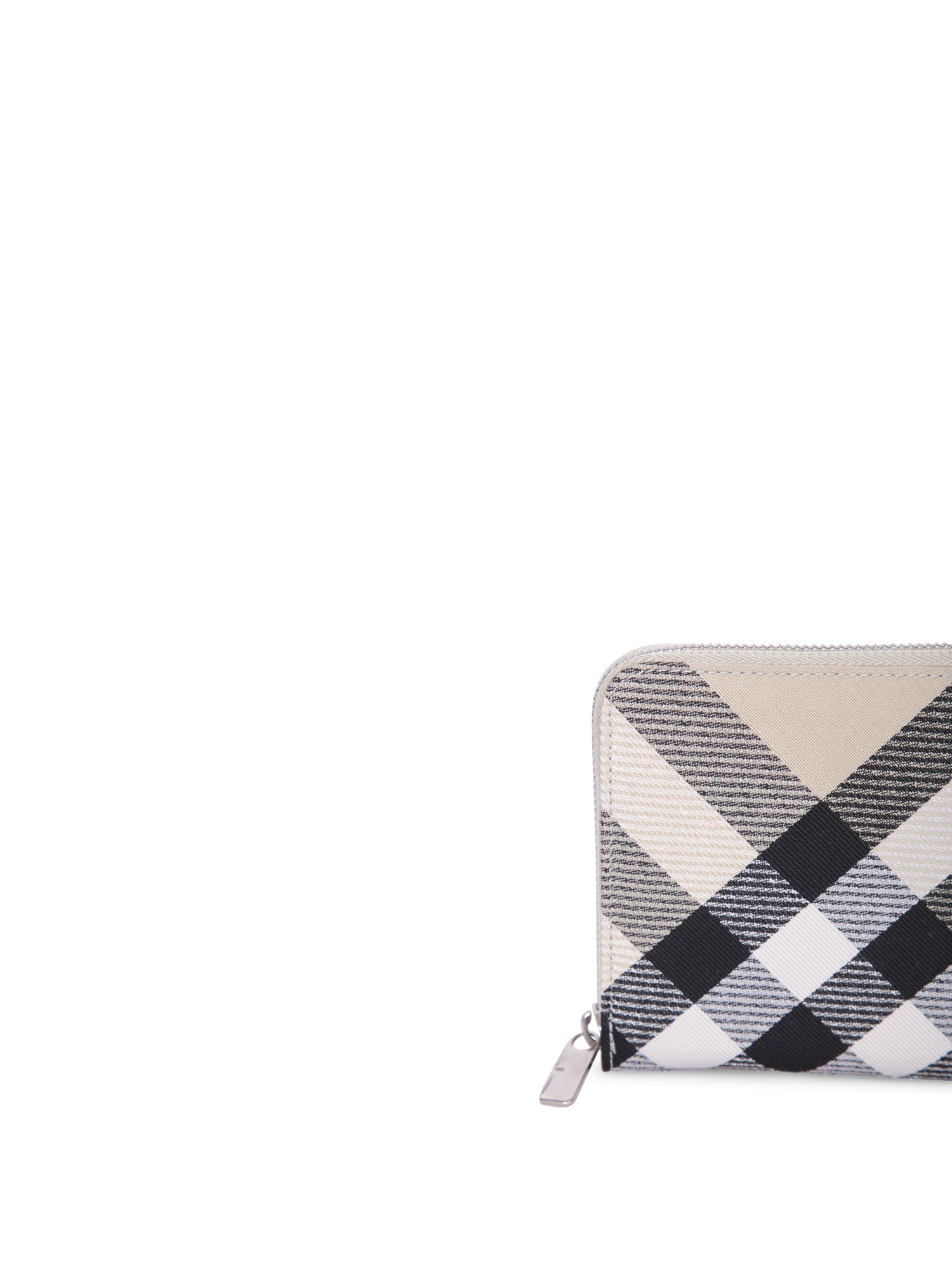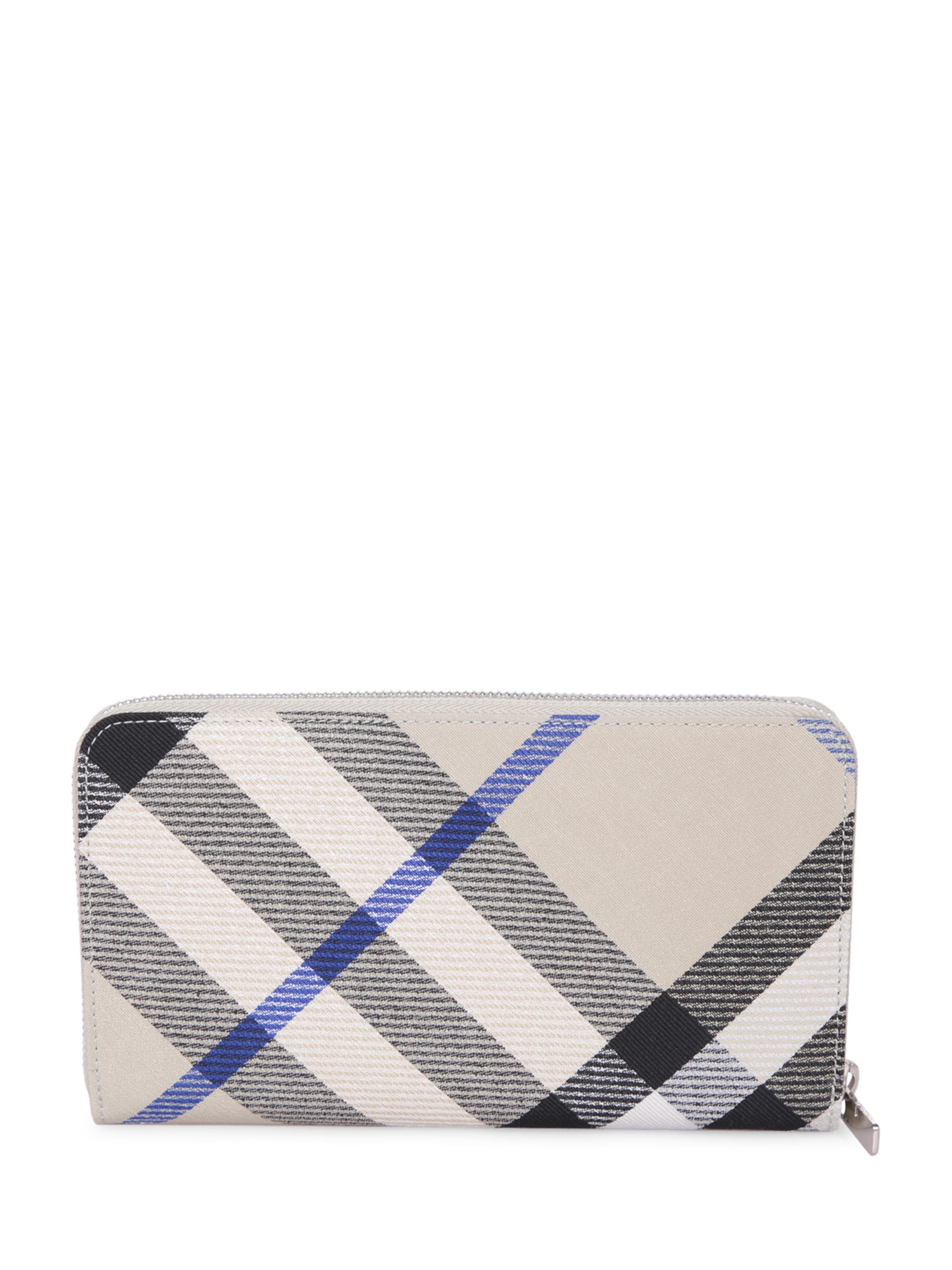 Long zip closure wallet. Check pattern in shades of grey, black, and ivory with blue details.