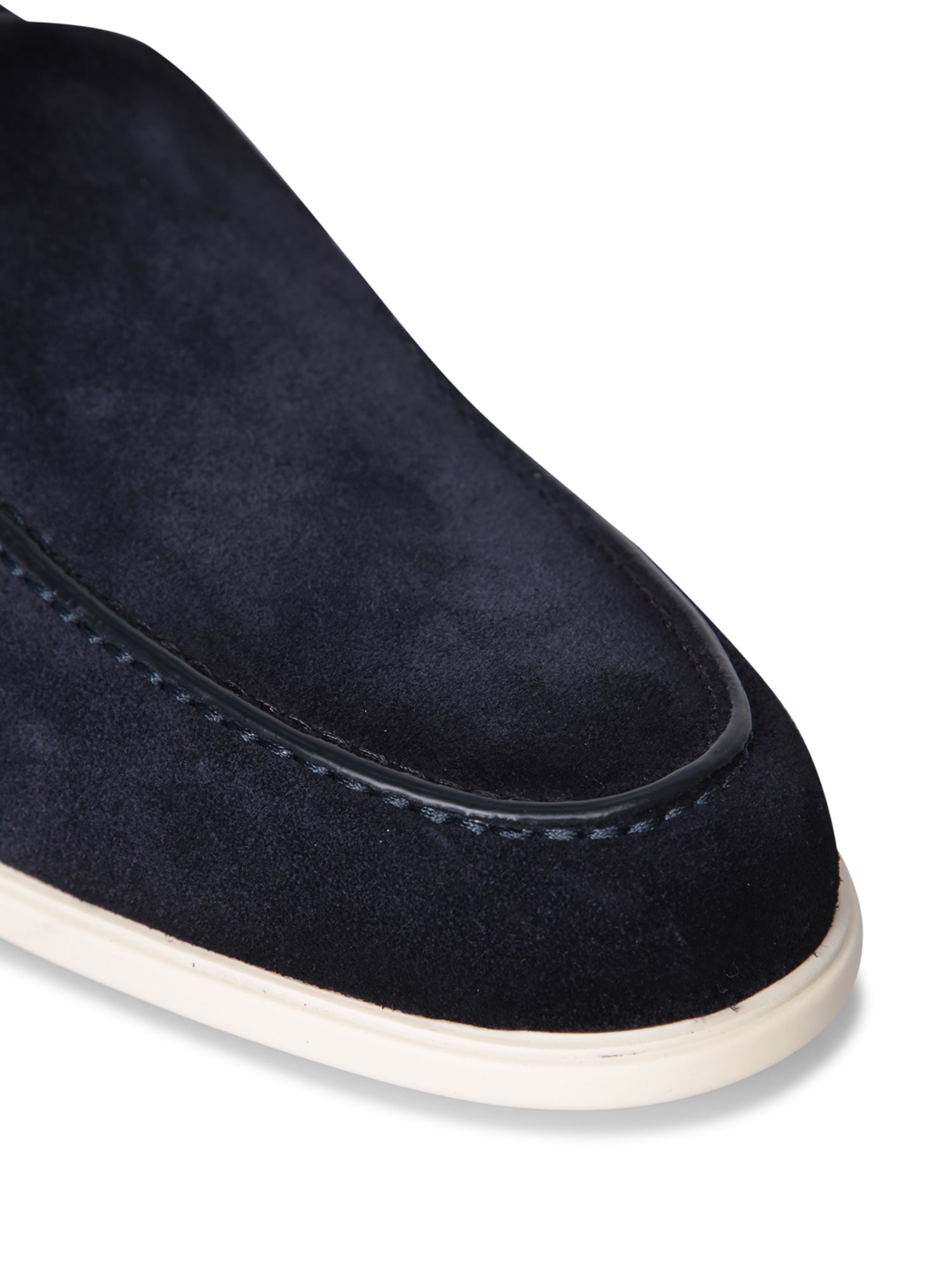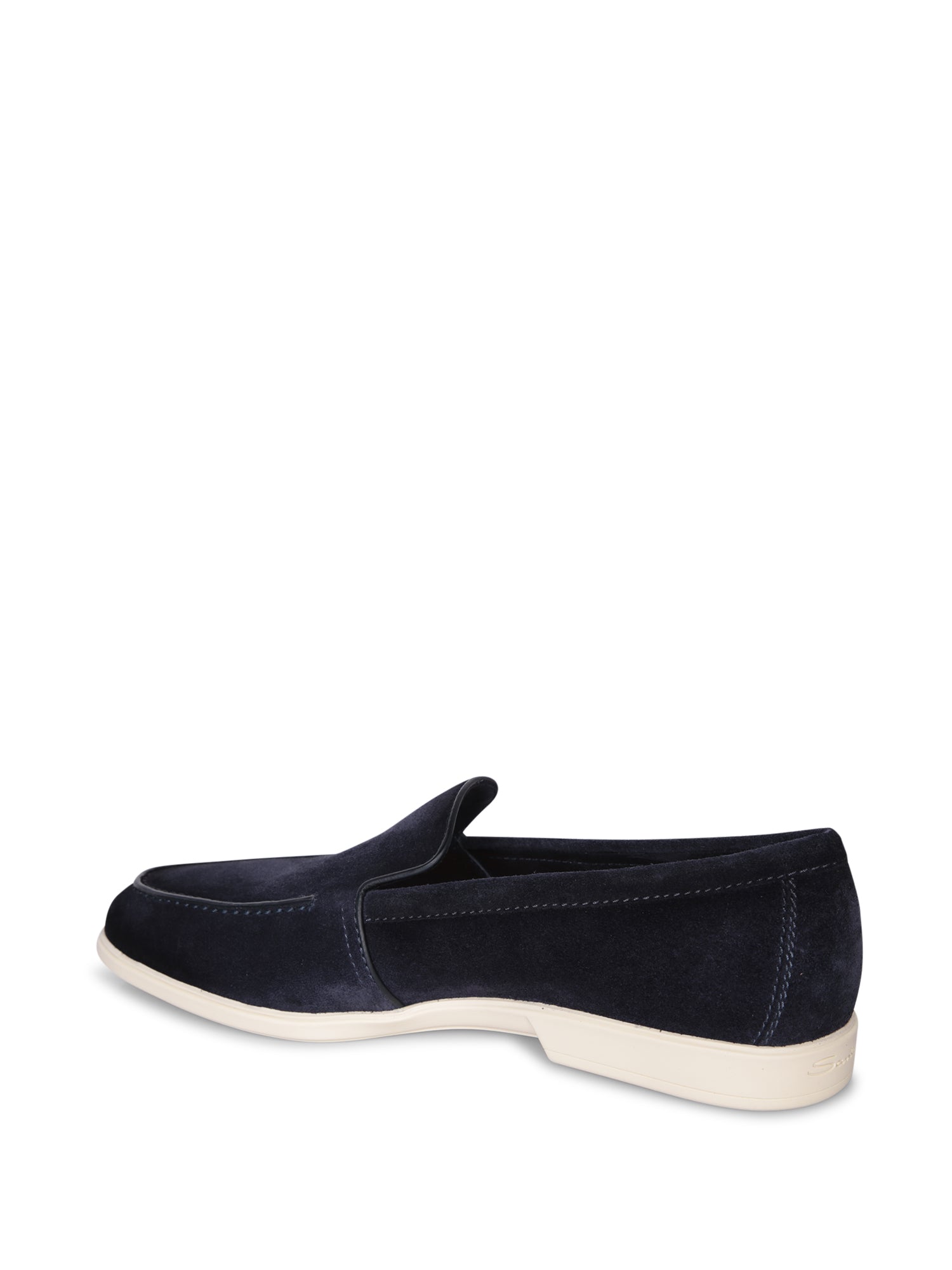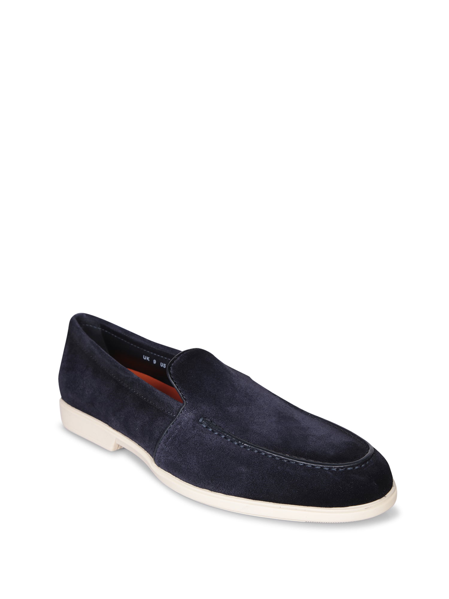 Blue suede loafer with white rubber sole. Slip-on design without laces. Features visible stitching.