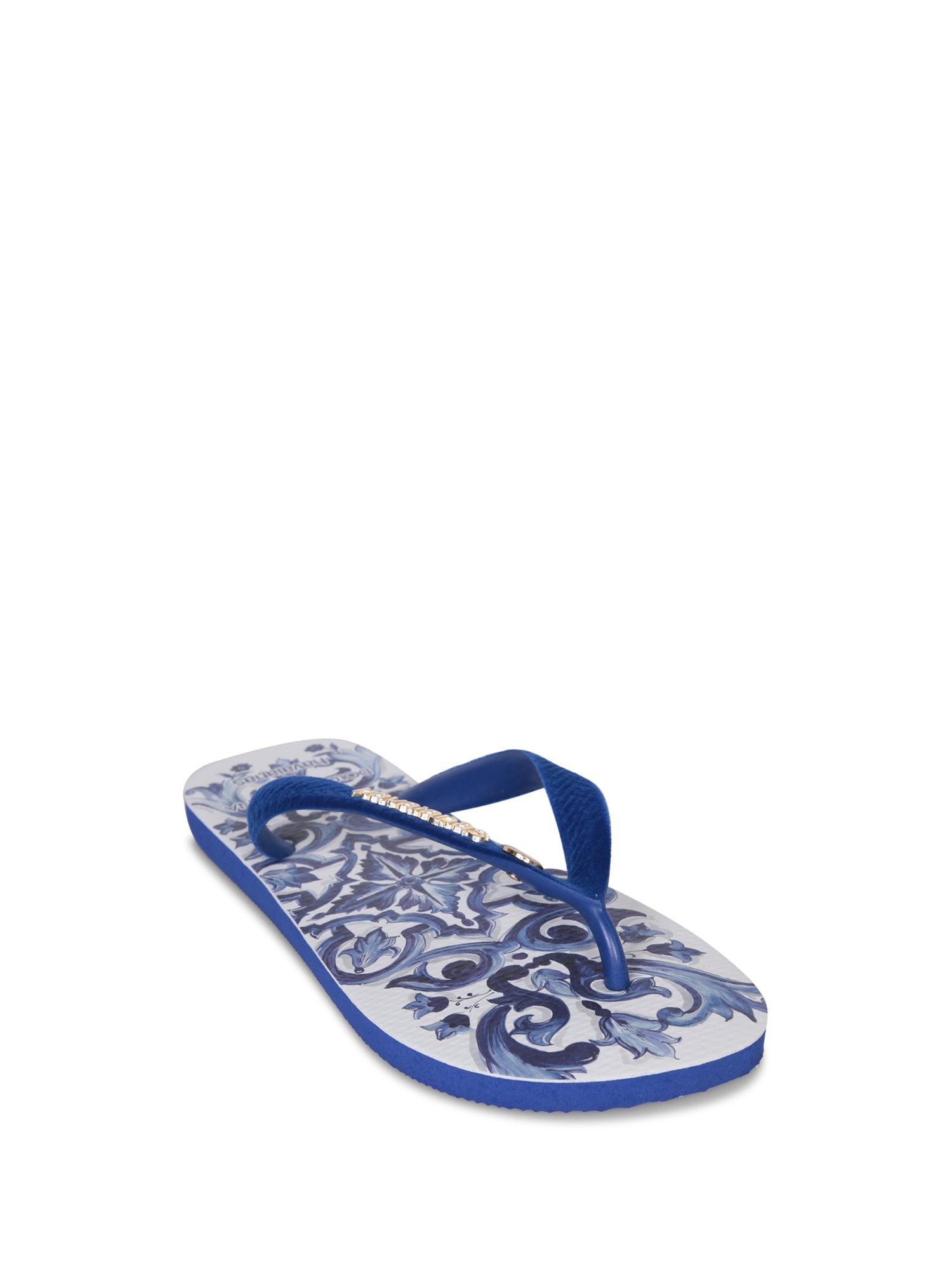 Rubber flip-flops, Mediterranean print design, logo detail on the strap.