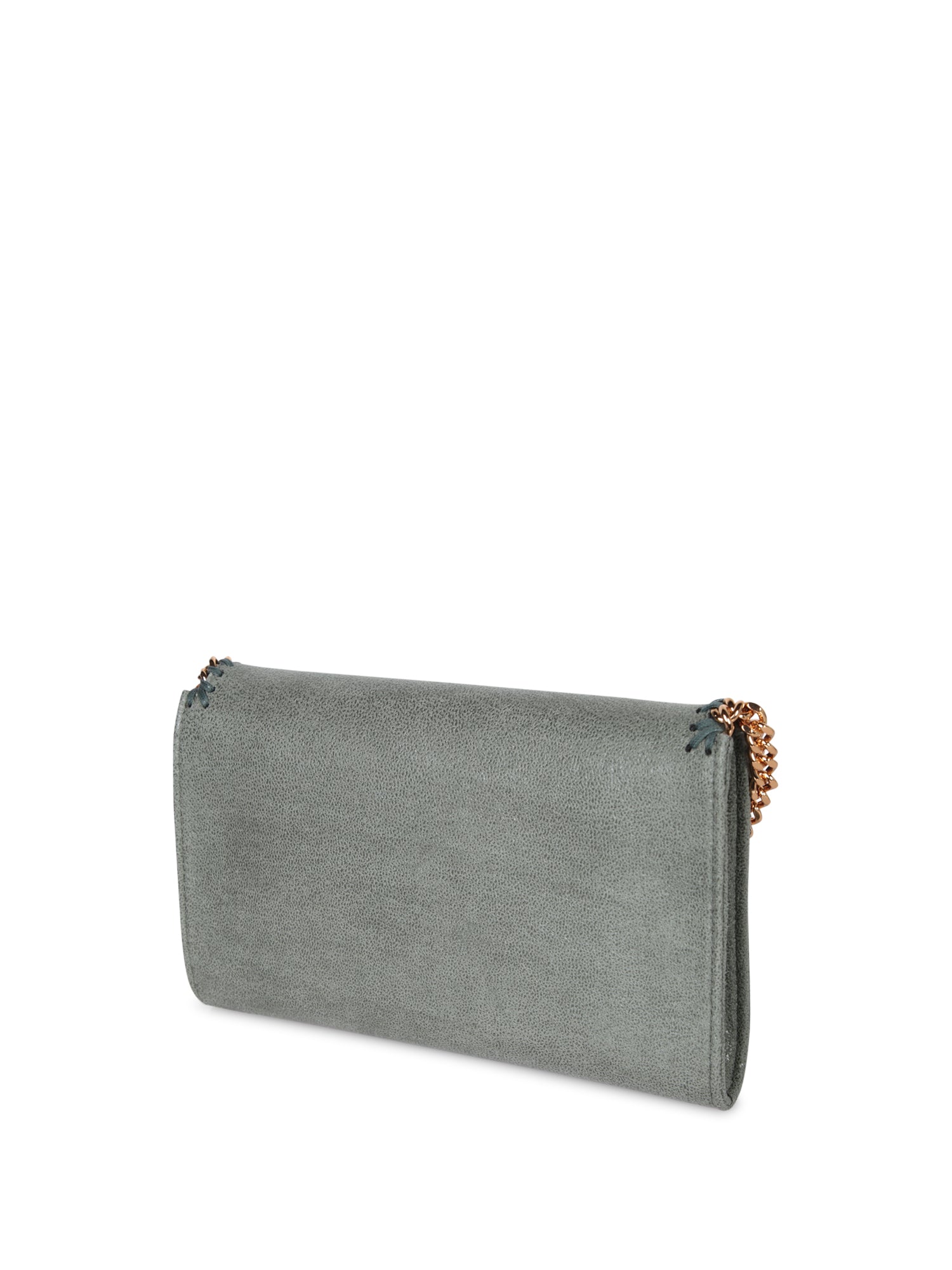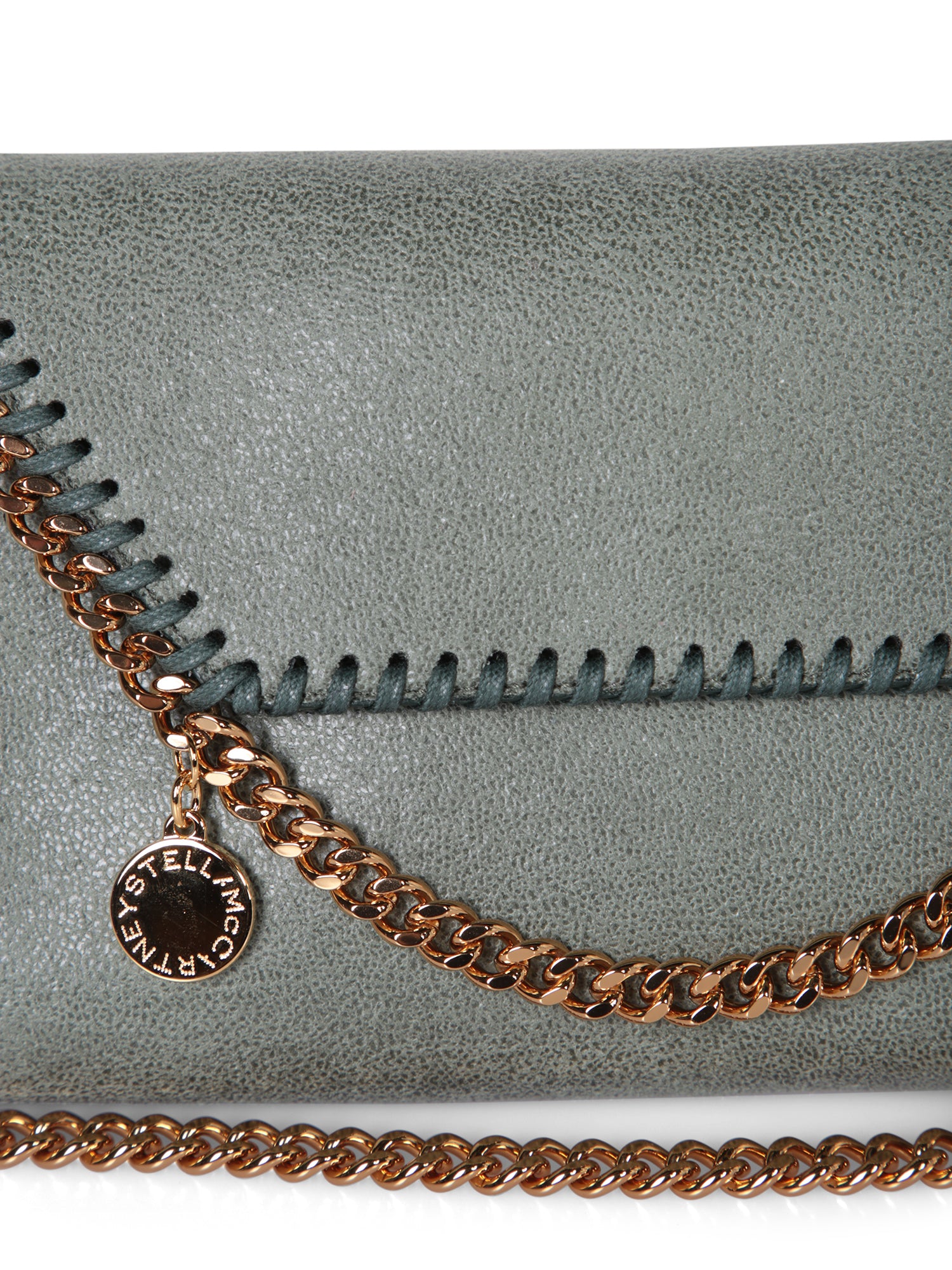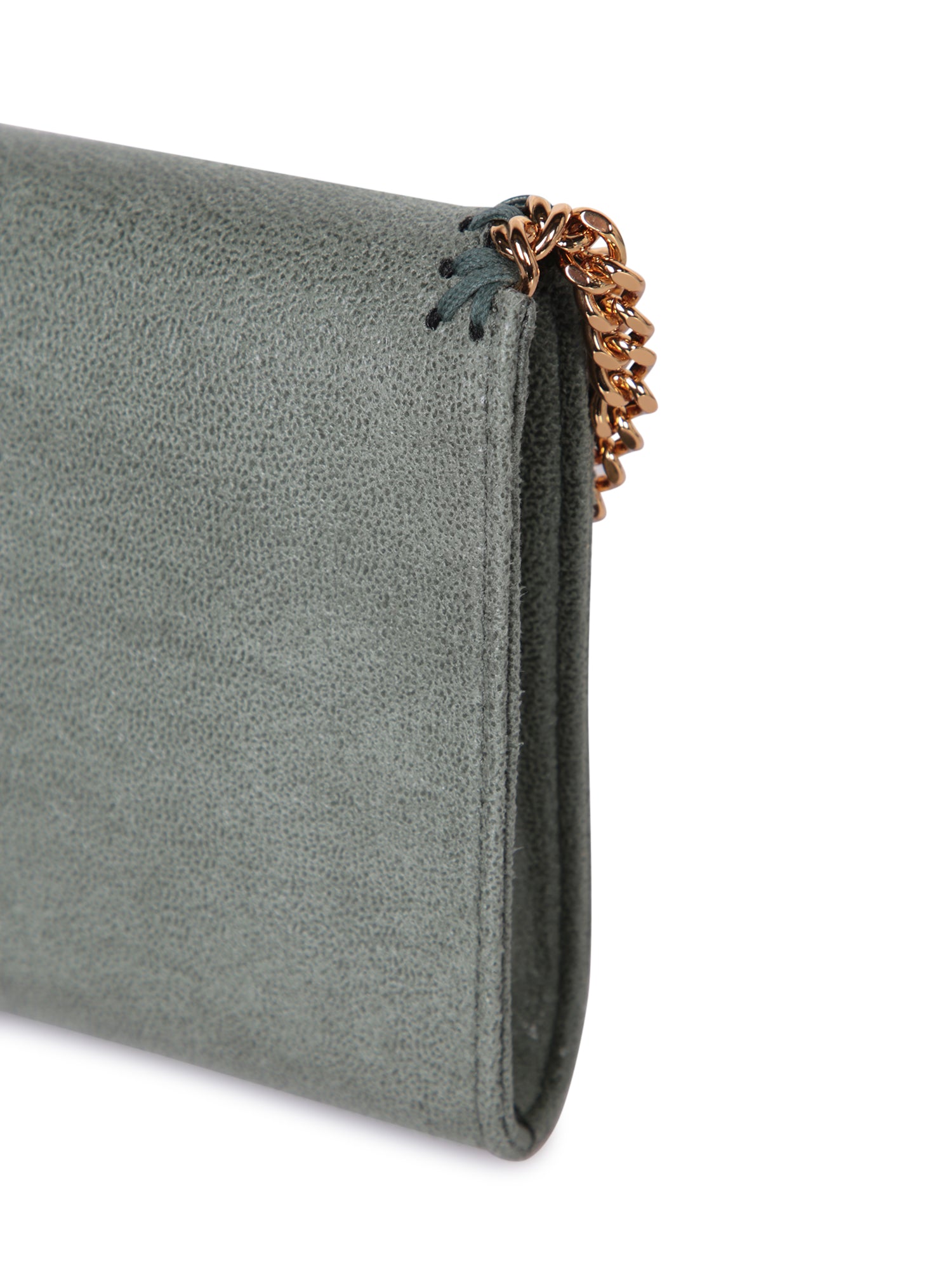 Copper-colored chain shoulder strap. Flap closure with contrasting profile. Synthetic leather texture.