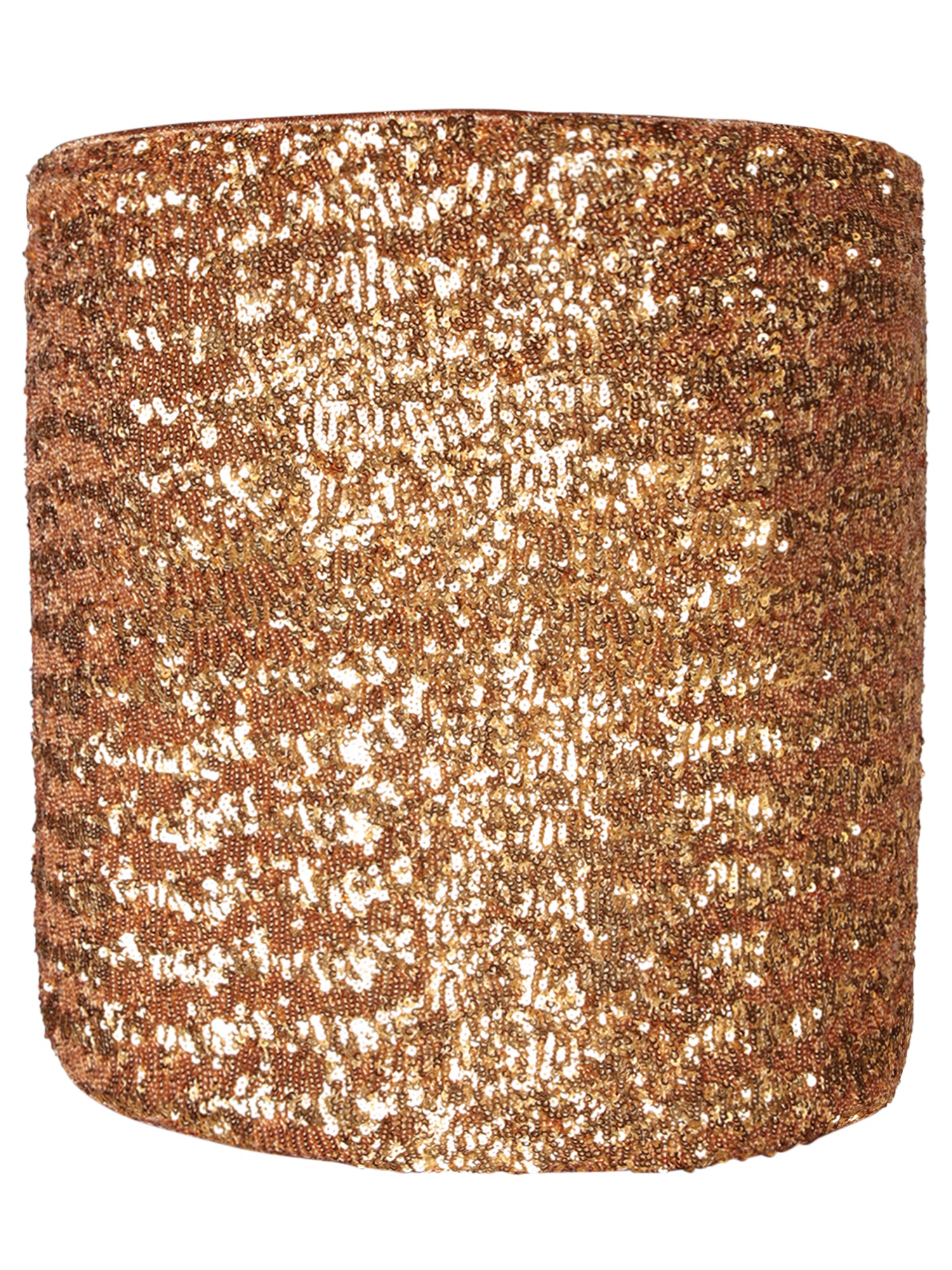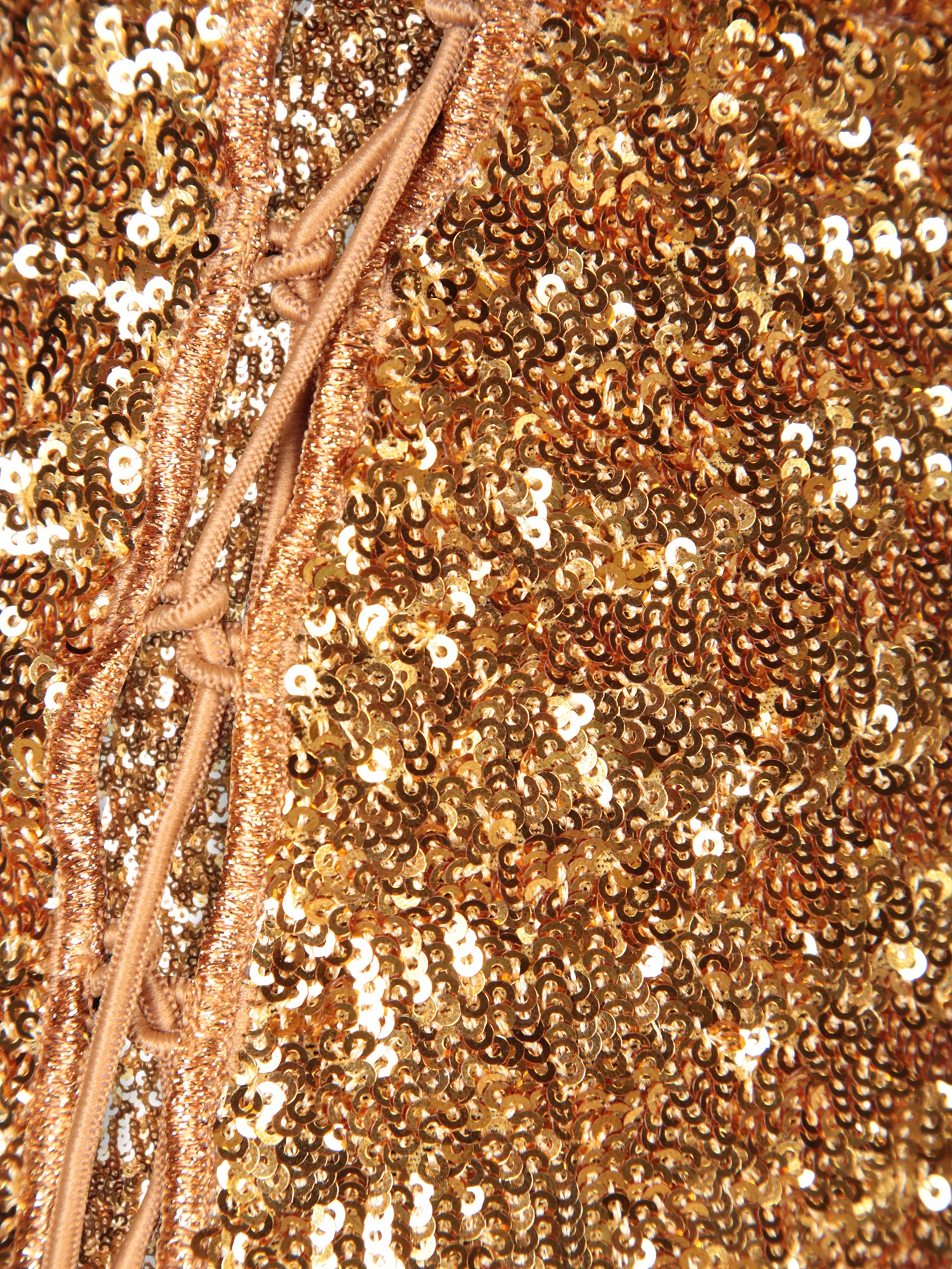 Wraparound design. Side tie closure. Completely covered in golden sequins.