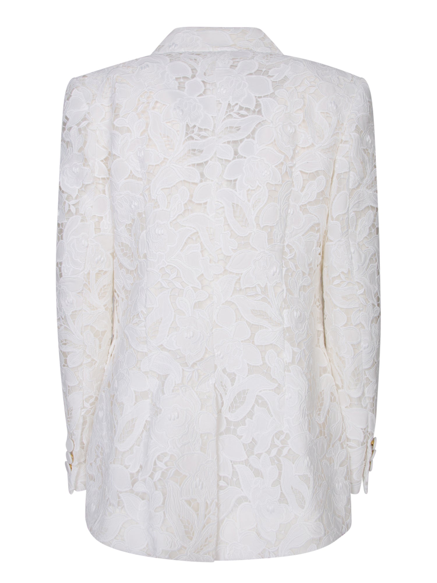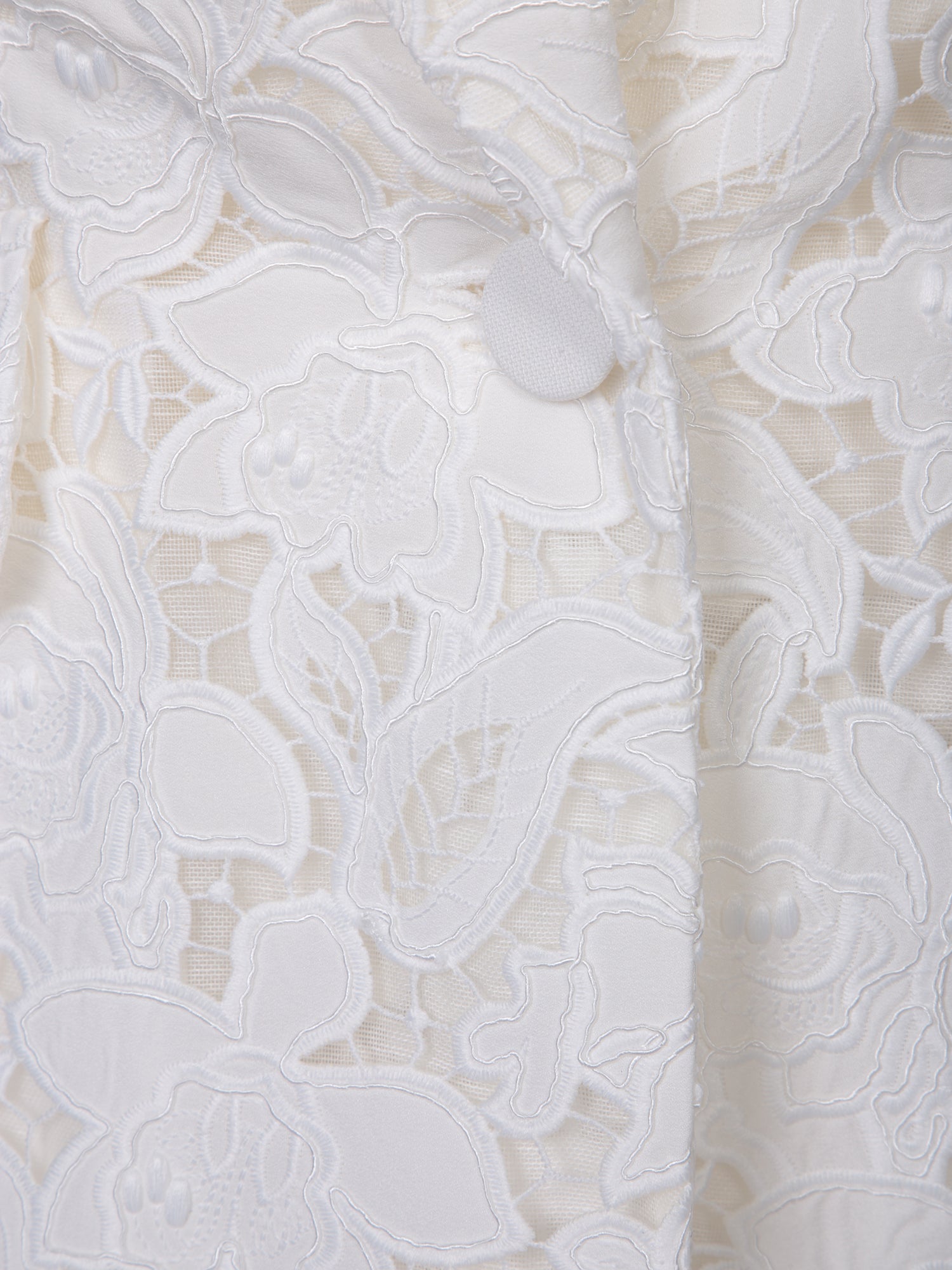 Elegant lace jacket with long sleeves, flap pockets, and button closure. Silk-lined interior.