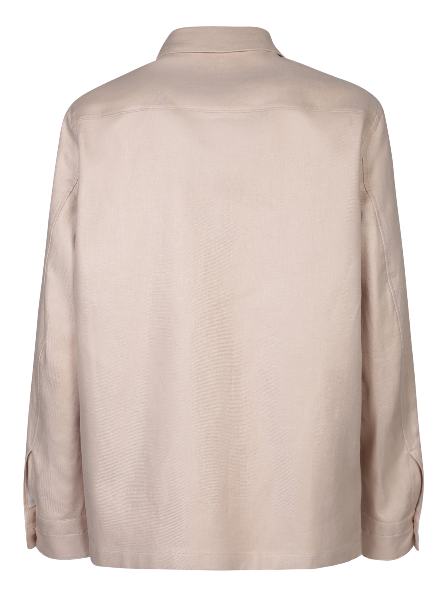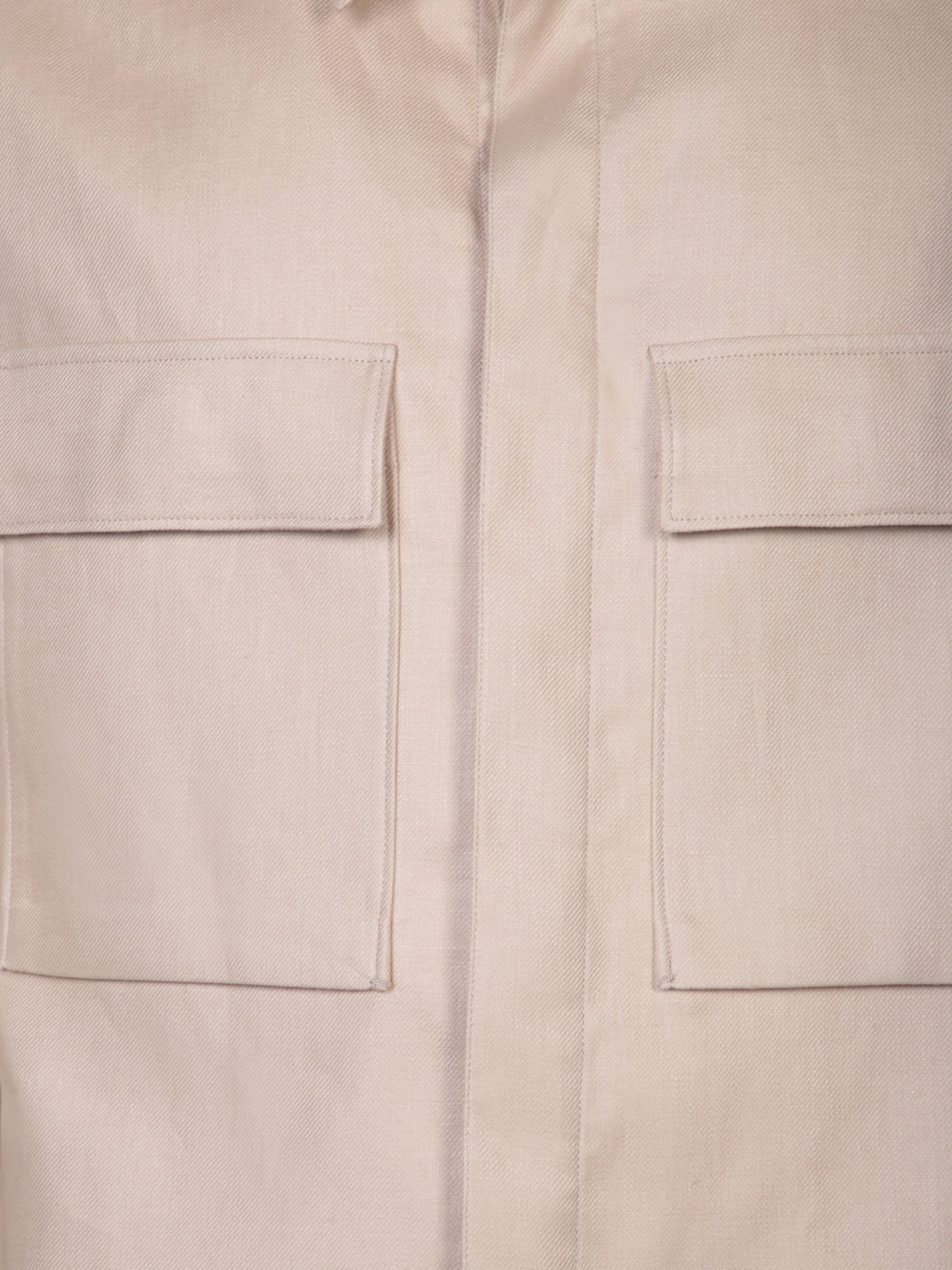 Classic collar, front button closure, long sleeves, two flap chest pockets, straight hem.