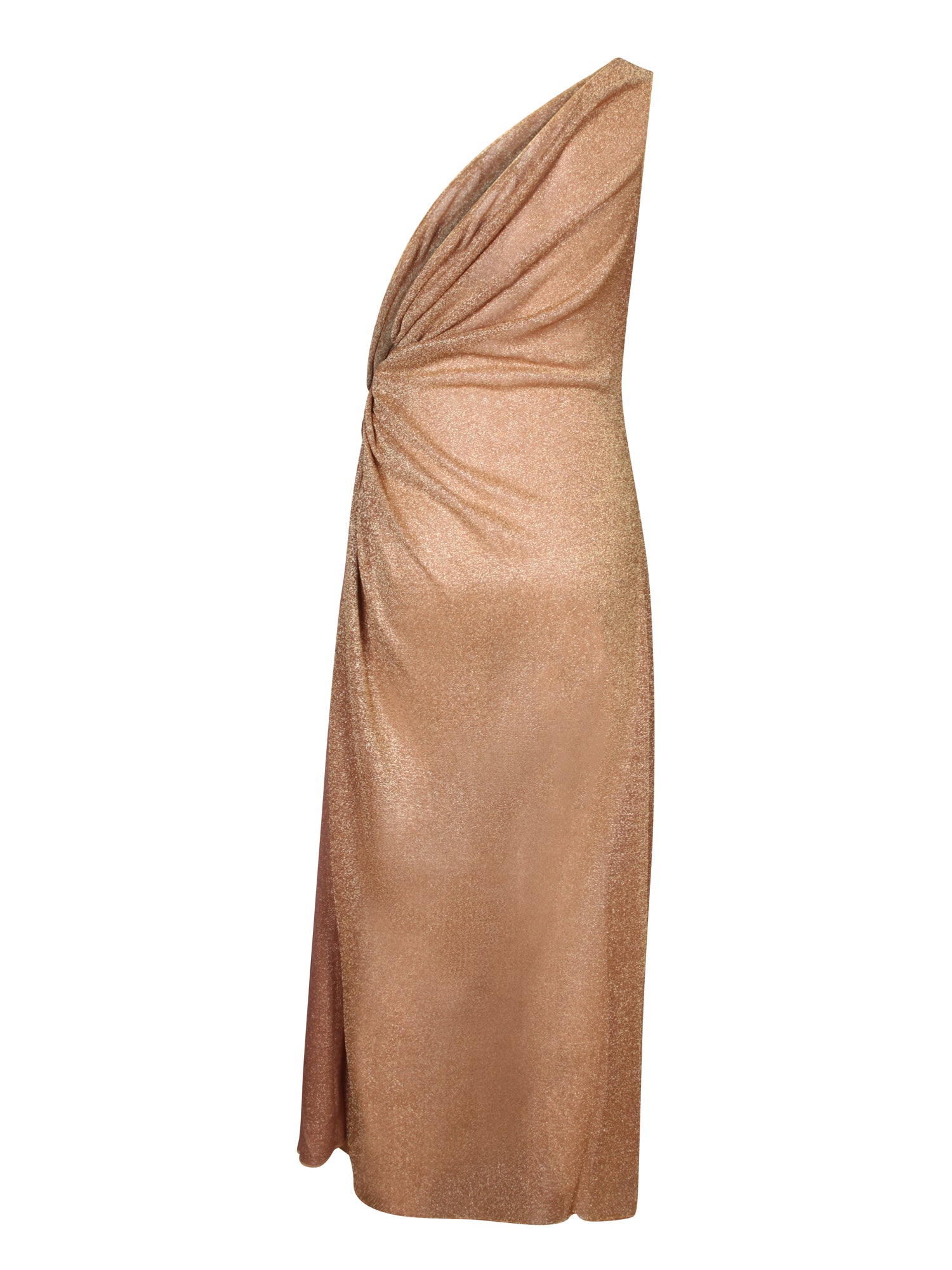 Elegant one-shoulder dress in lurex fabric. Knot detail on the shoulder and asymmetrical cut.