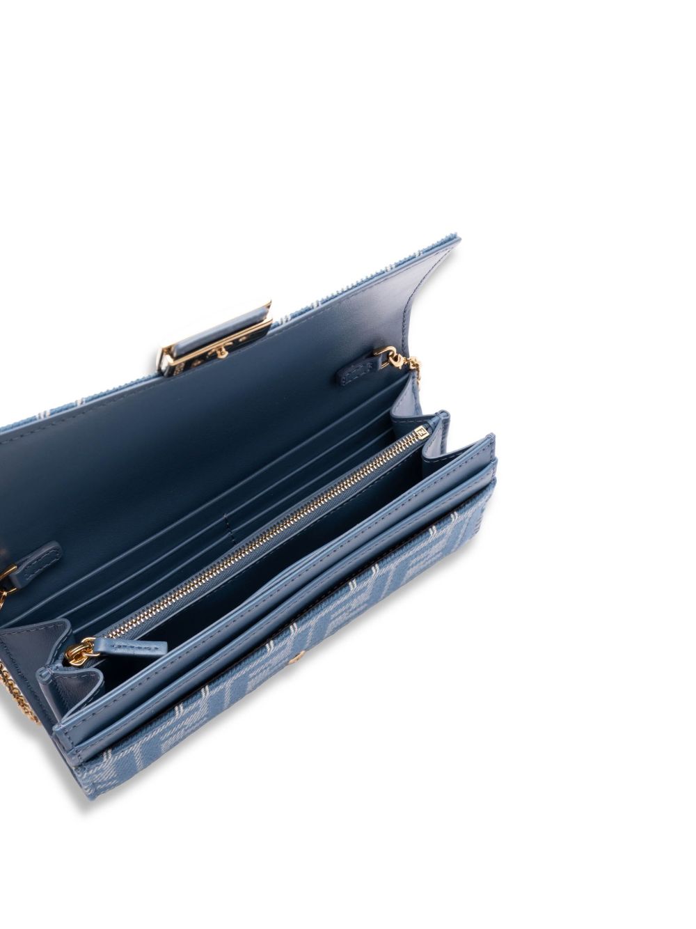 Baguette continental wallet with geometric flap, FF closure and removable thin chain shoulder strap. Interior equipped as a wallet, with 2 gusseted compartments, zip pocket, 2 flat pockets and 10 card slots. Made of denim-effect FF jacquard in shades of blue. Gold-finish metal accessories.