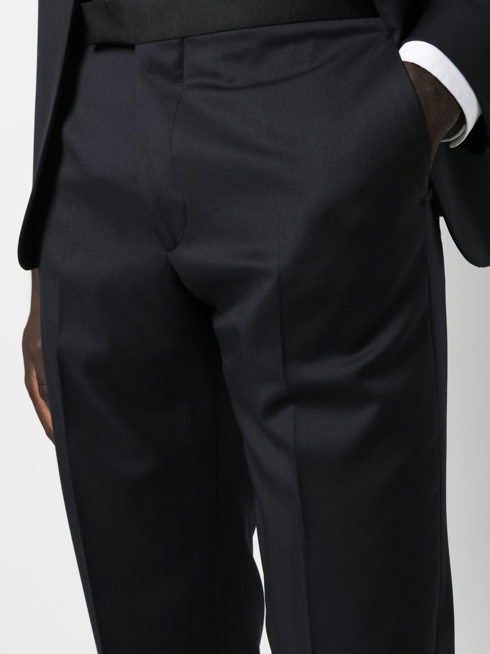 Navy blue, black, virgin wool, tailored design, peak lapels, front button closure, front welt pocket, long sleeves, buttoned hems, central back vent, straight hem, pressed pleat, hidden front closure, side bellows pockets and straight cut.