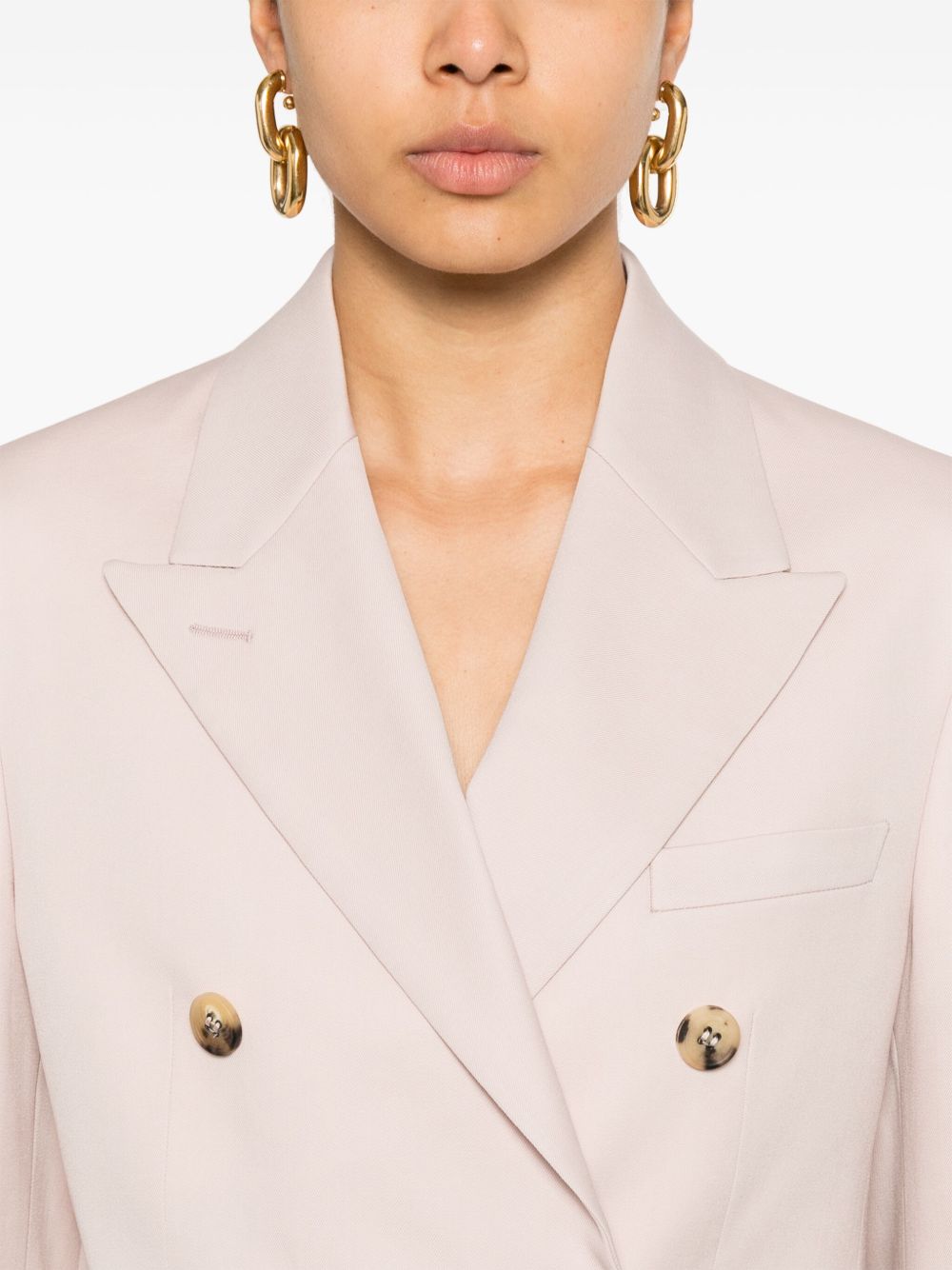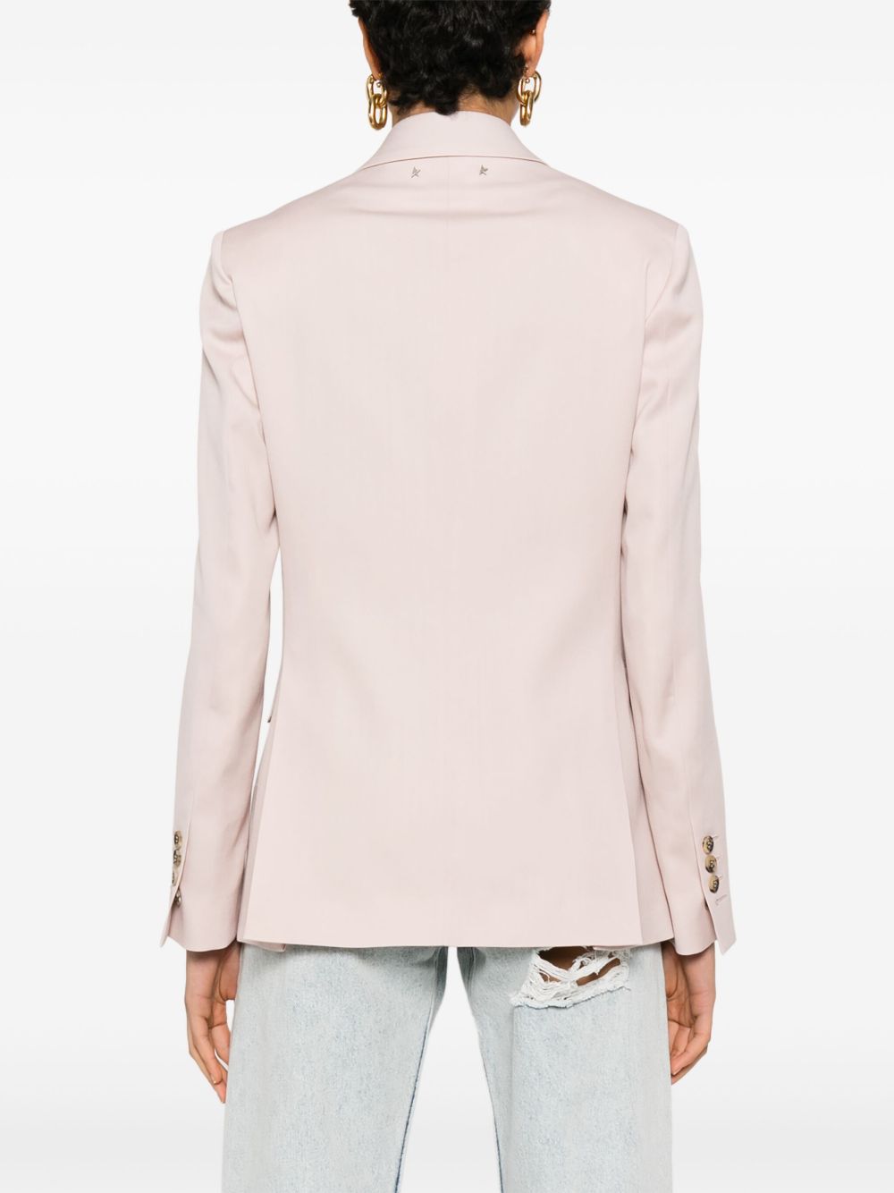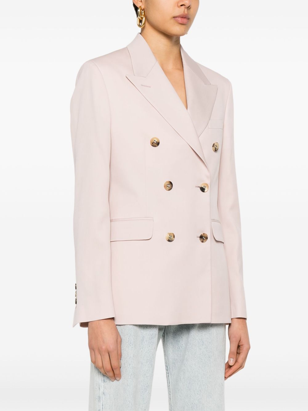 light pink double-breasted button fastening jetted chest pocket two front flap pockets English rear vents