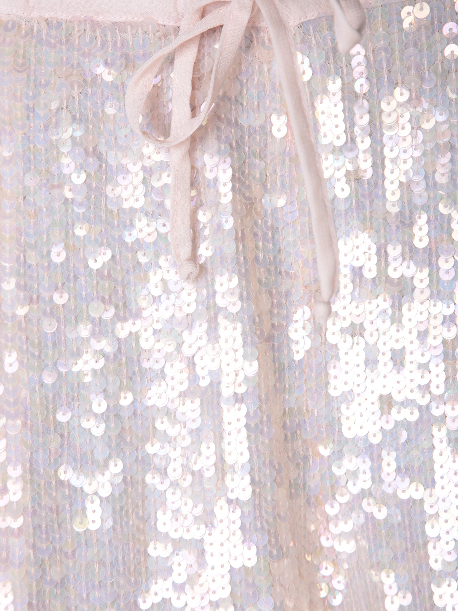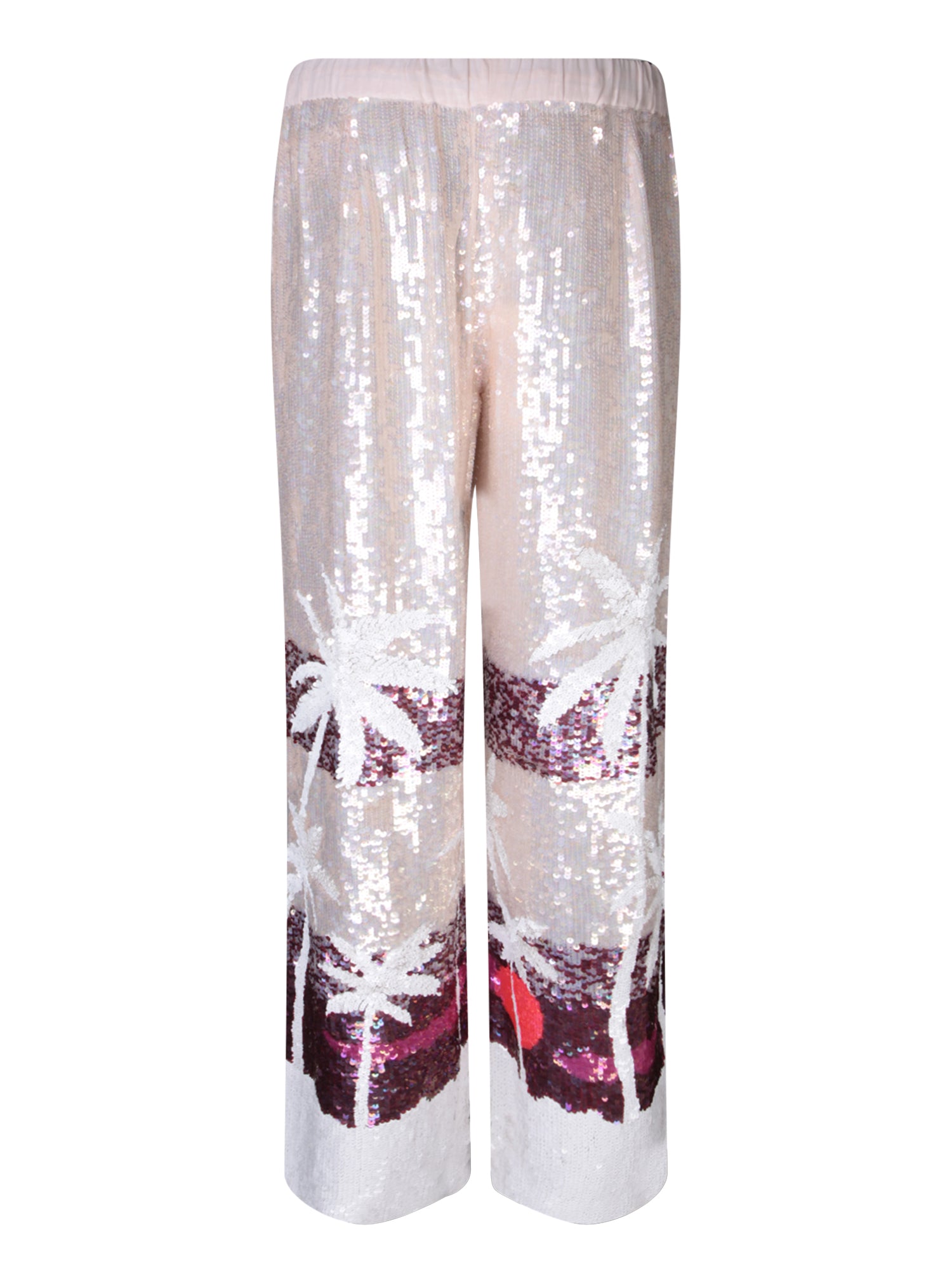 These elegant PAROSH Pink Bubble Trousers feature a luxurious fabric fully adorned with sequins creating a lively tropical pattern. The wide-leg cut and high waist provide both comfort and style for special occasions.
