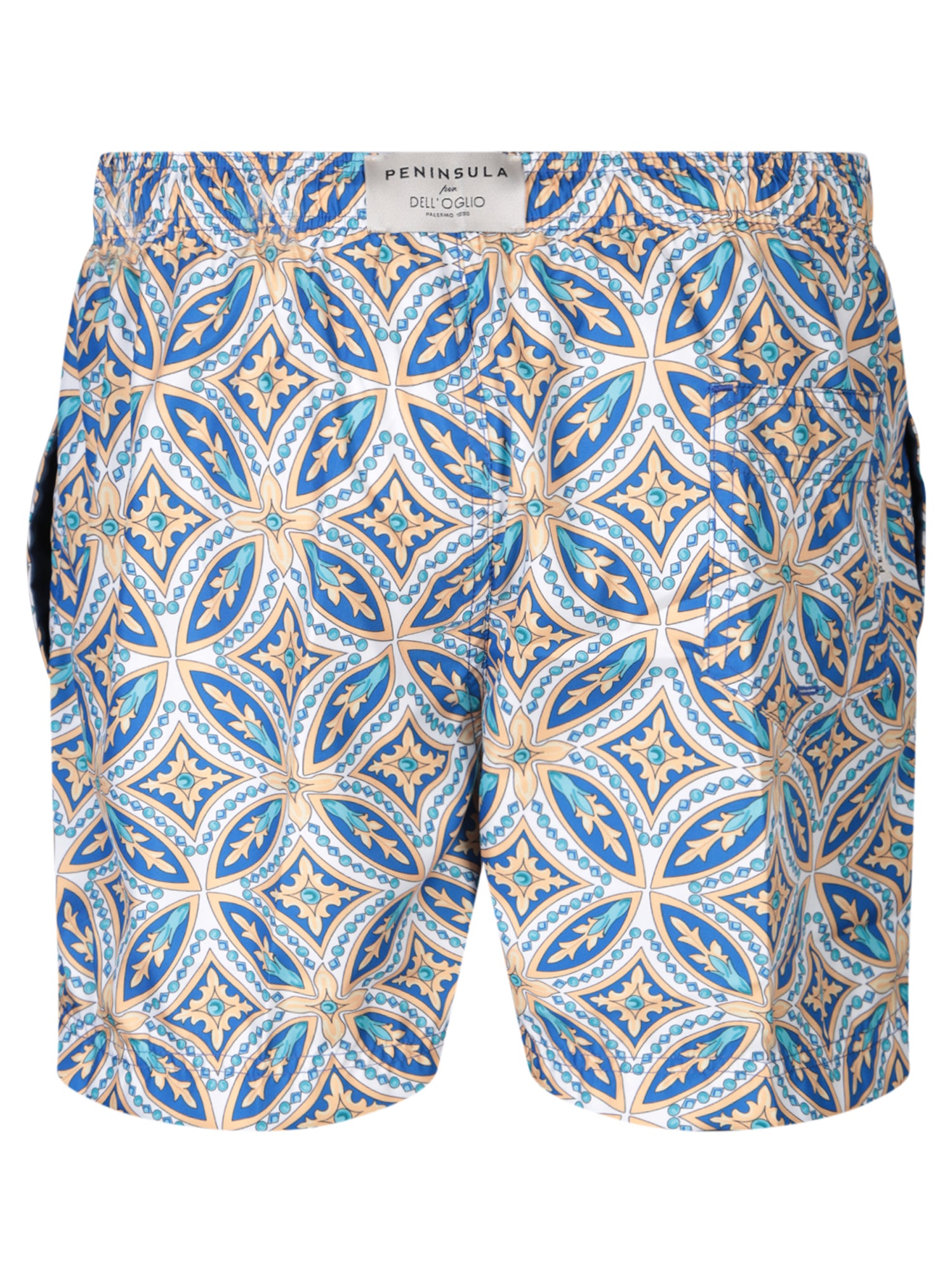 Patterned boxer swim shorts with an elastic waistband and drawstring. Lightweight and comfortable fabric. Side pockets.