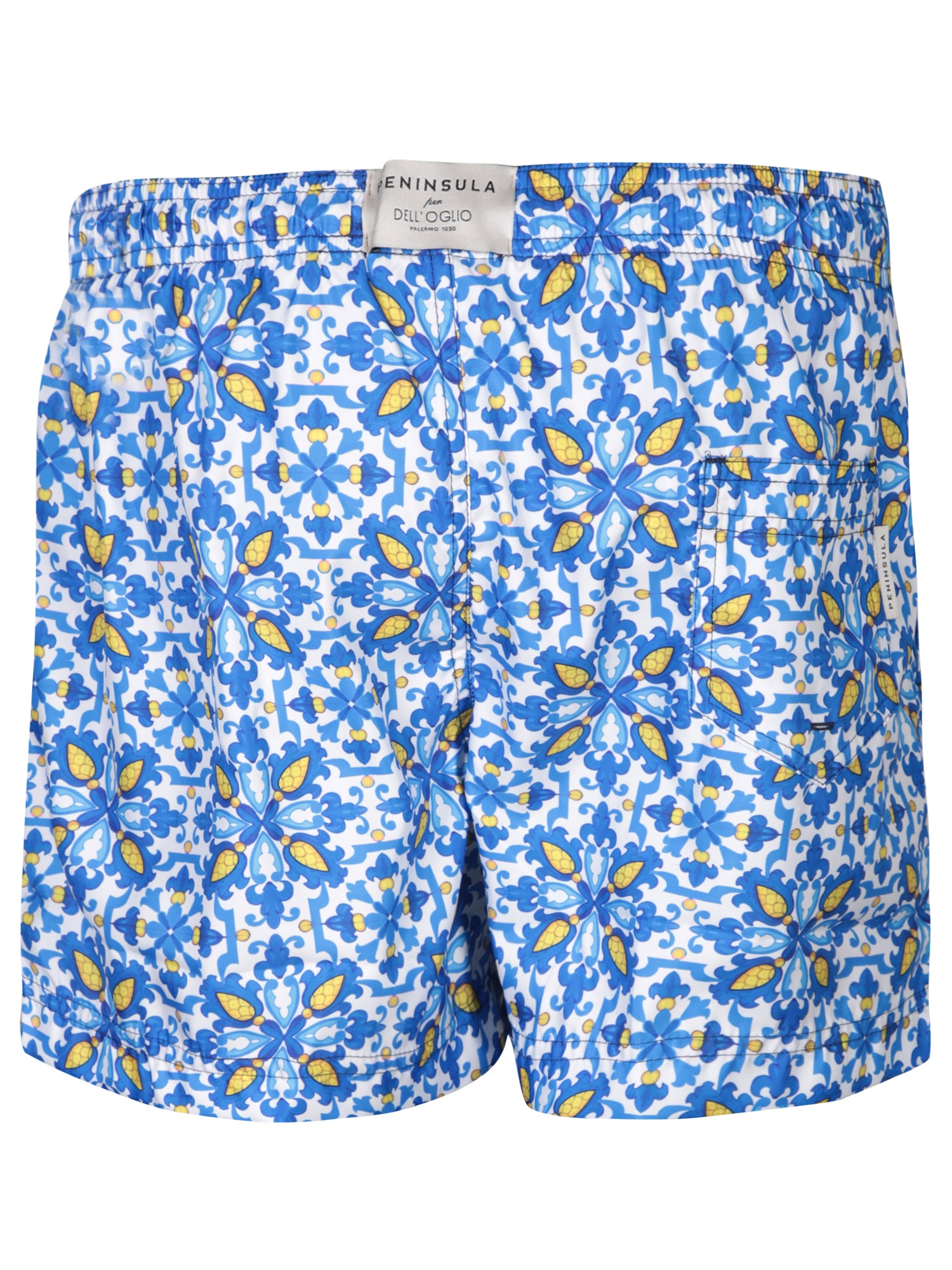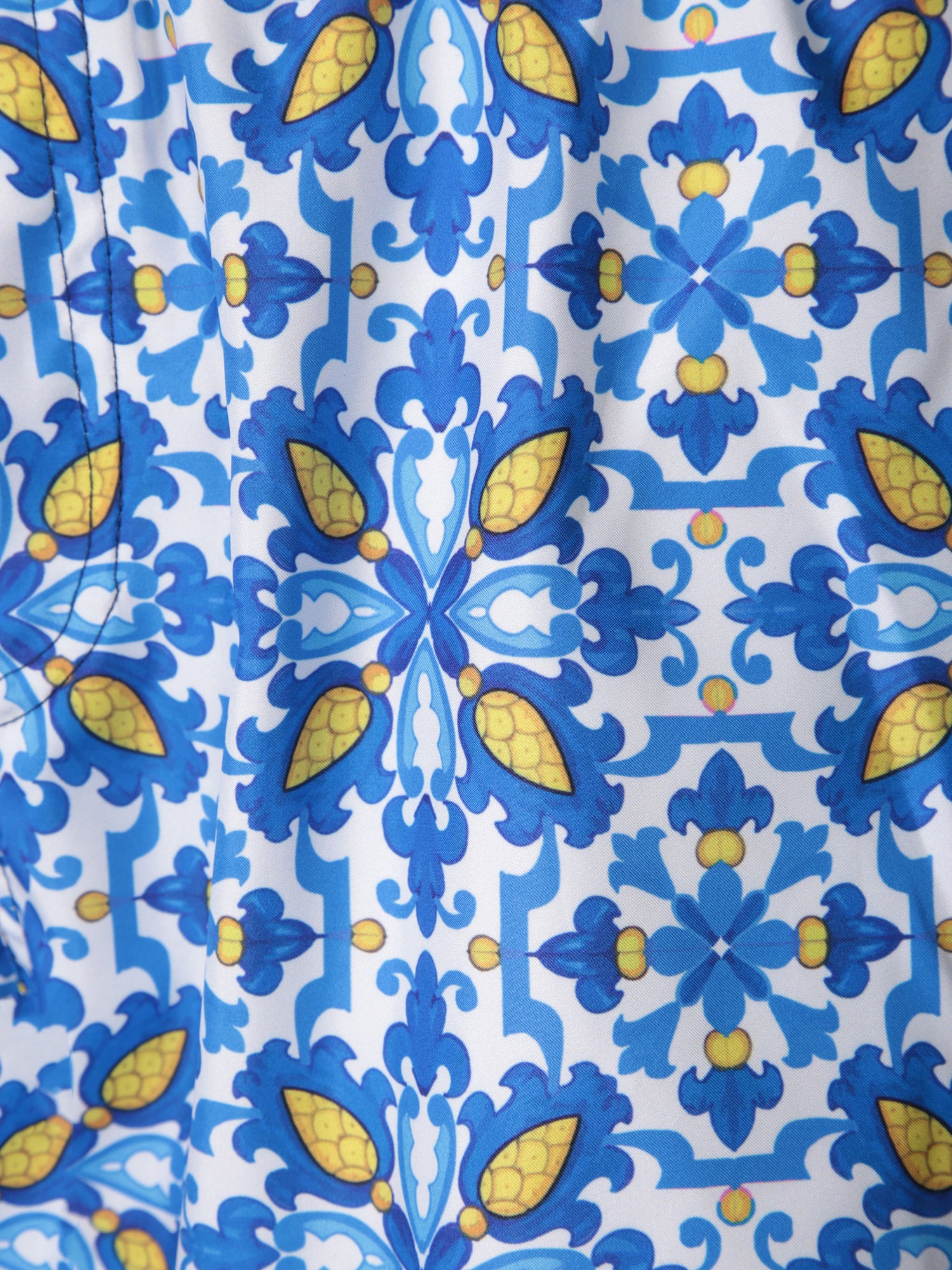 Boxer-style swimwear, lightweight and quick-dry fabric, adjustable waist drawstring, back pocket.