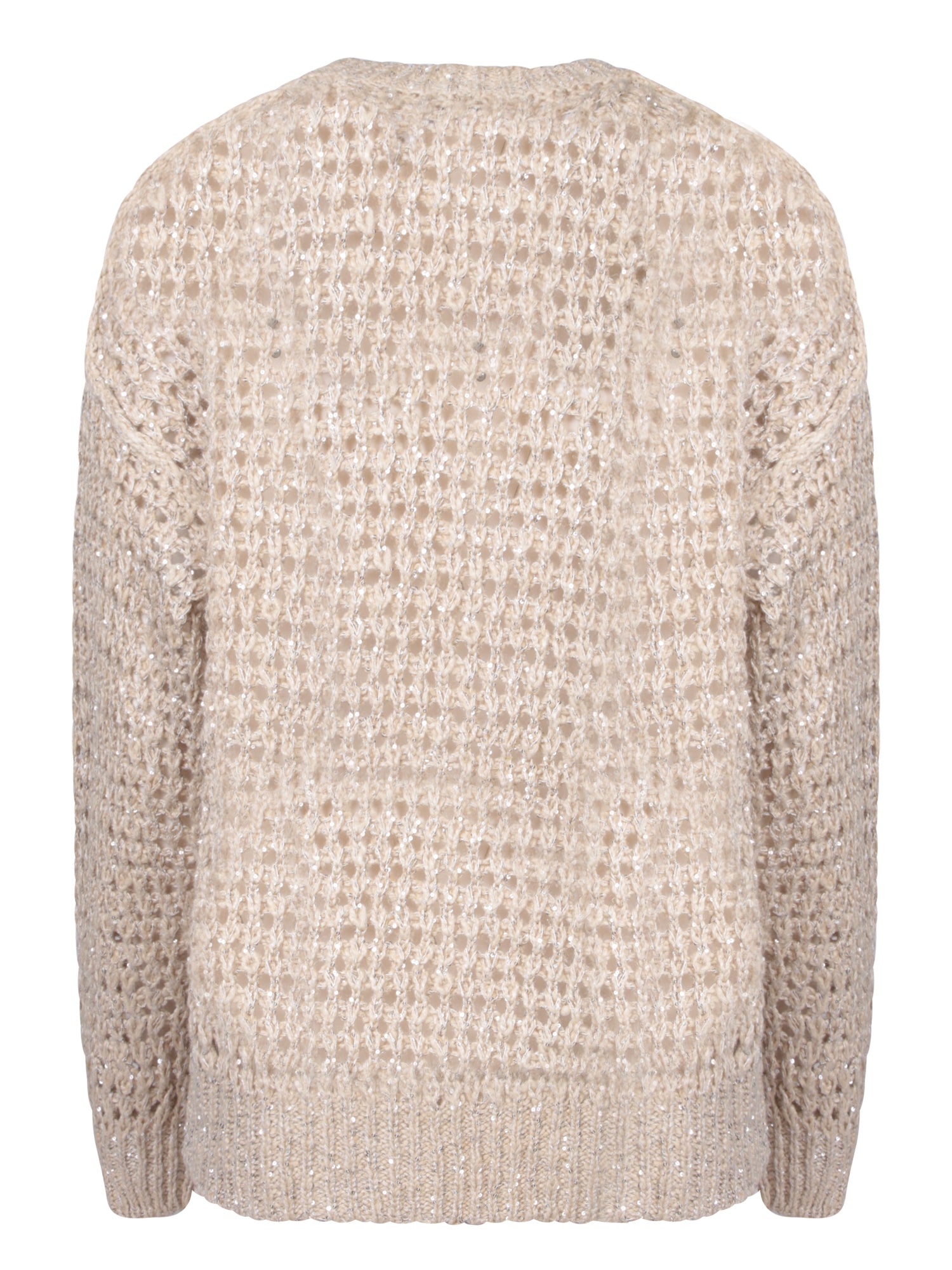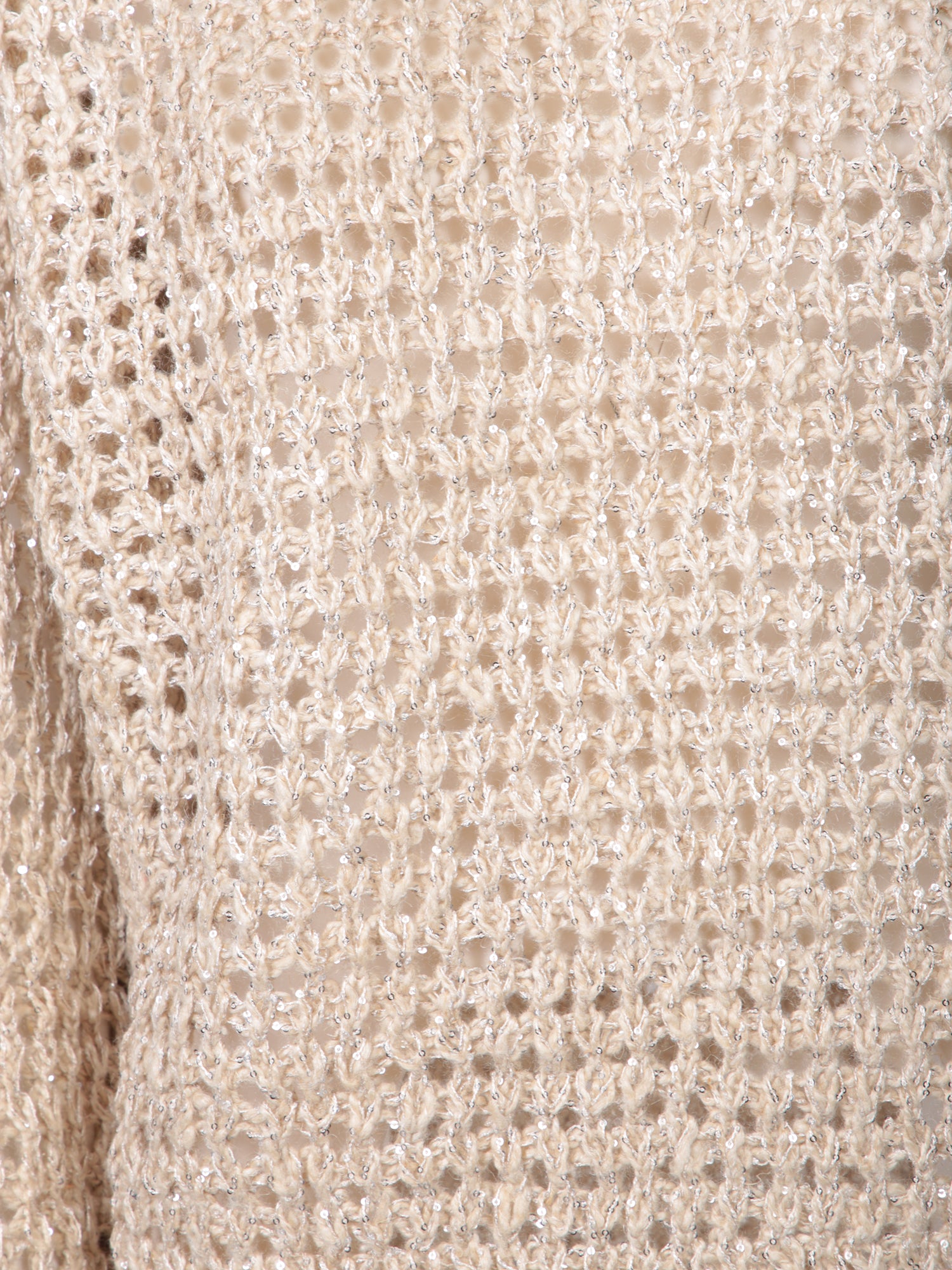 Open weave crew neck sweater. Ribbed trim. Lightweight and breathable silk and linen fabric.