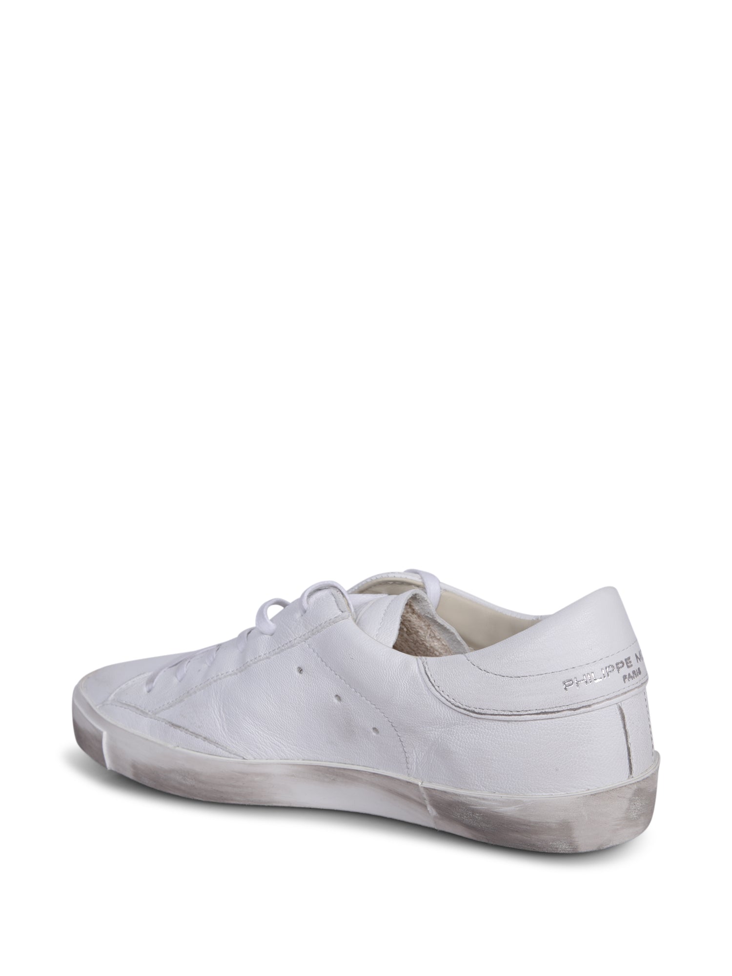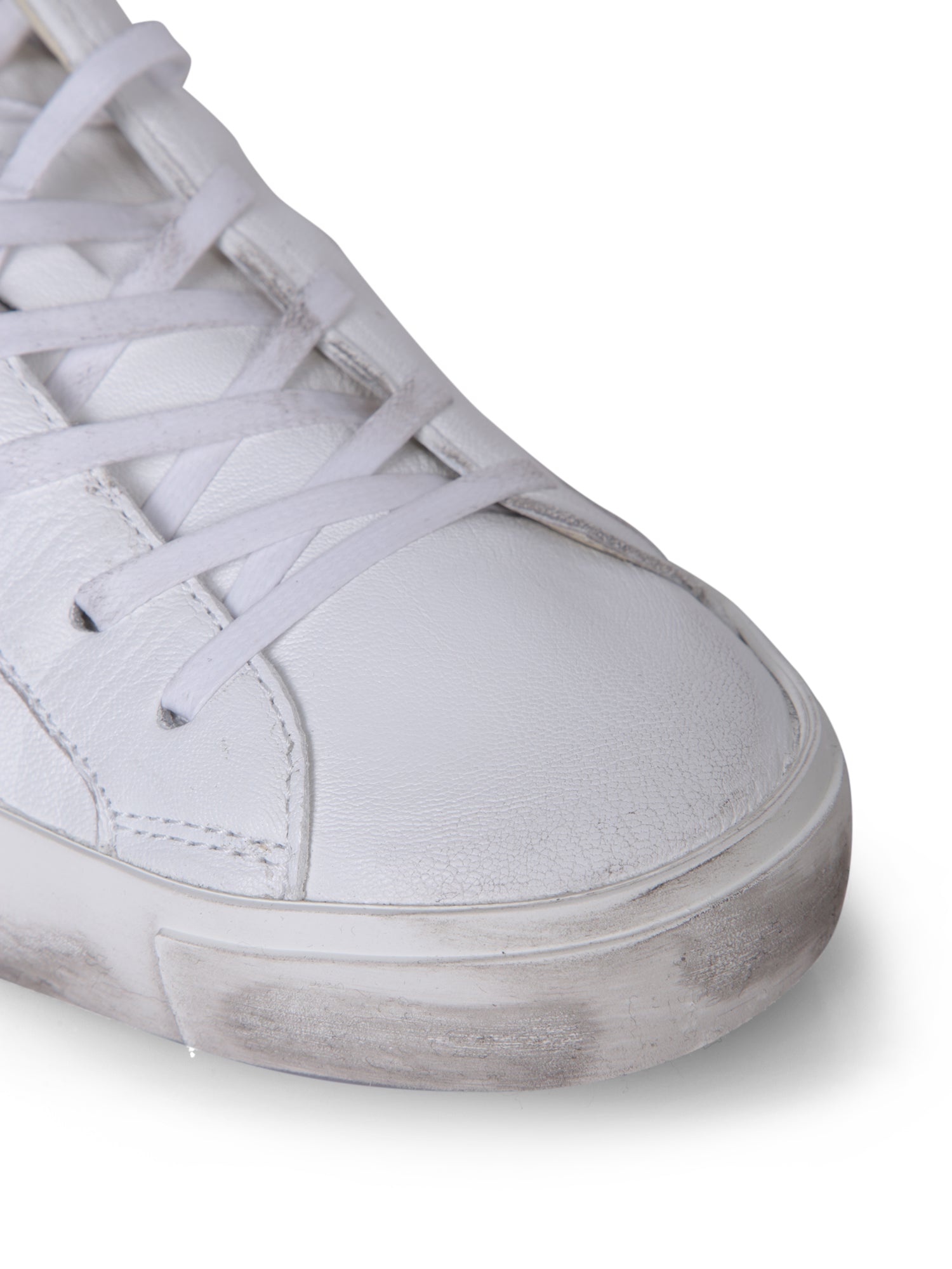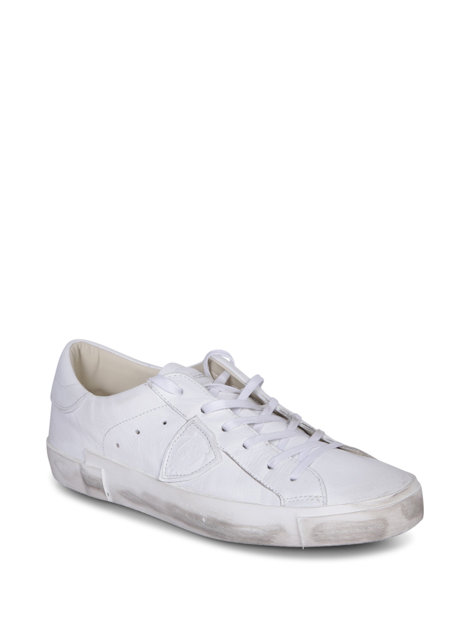 Low-top leather sneakers, white color. Vintage effect. Lace-up fastening. Subtle side logo.