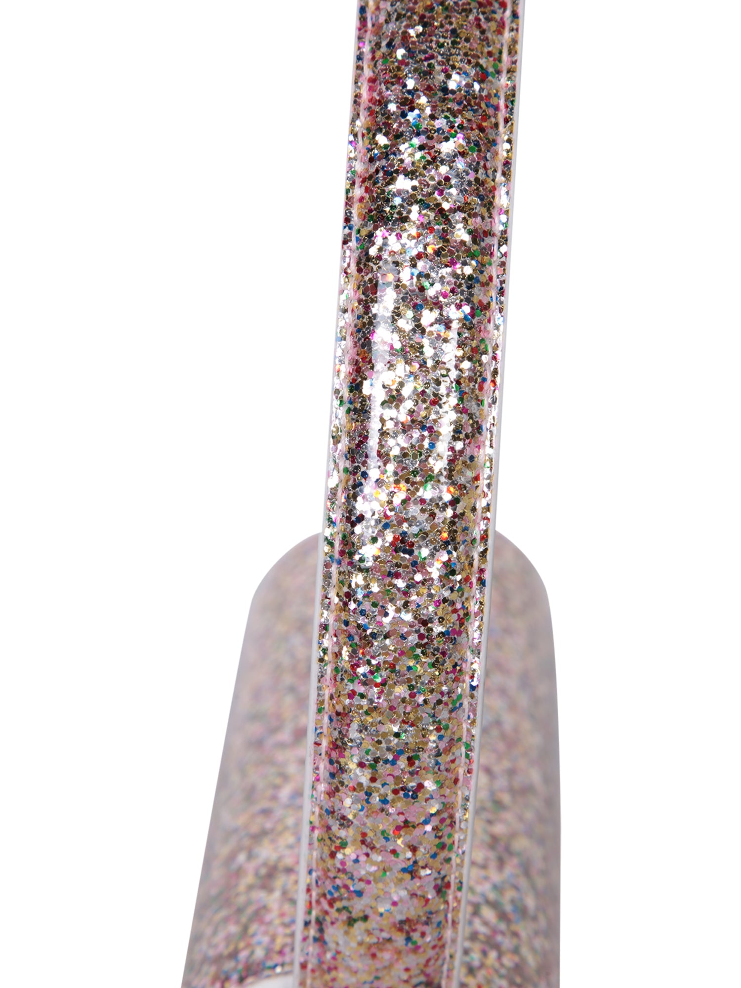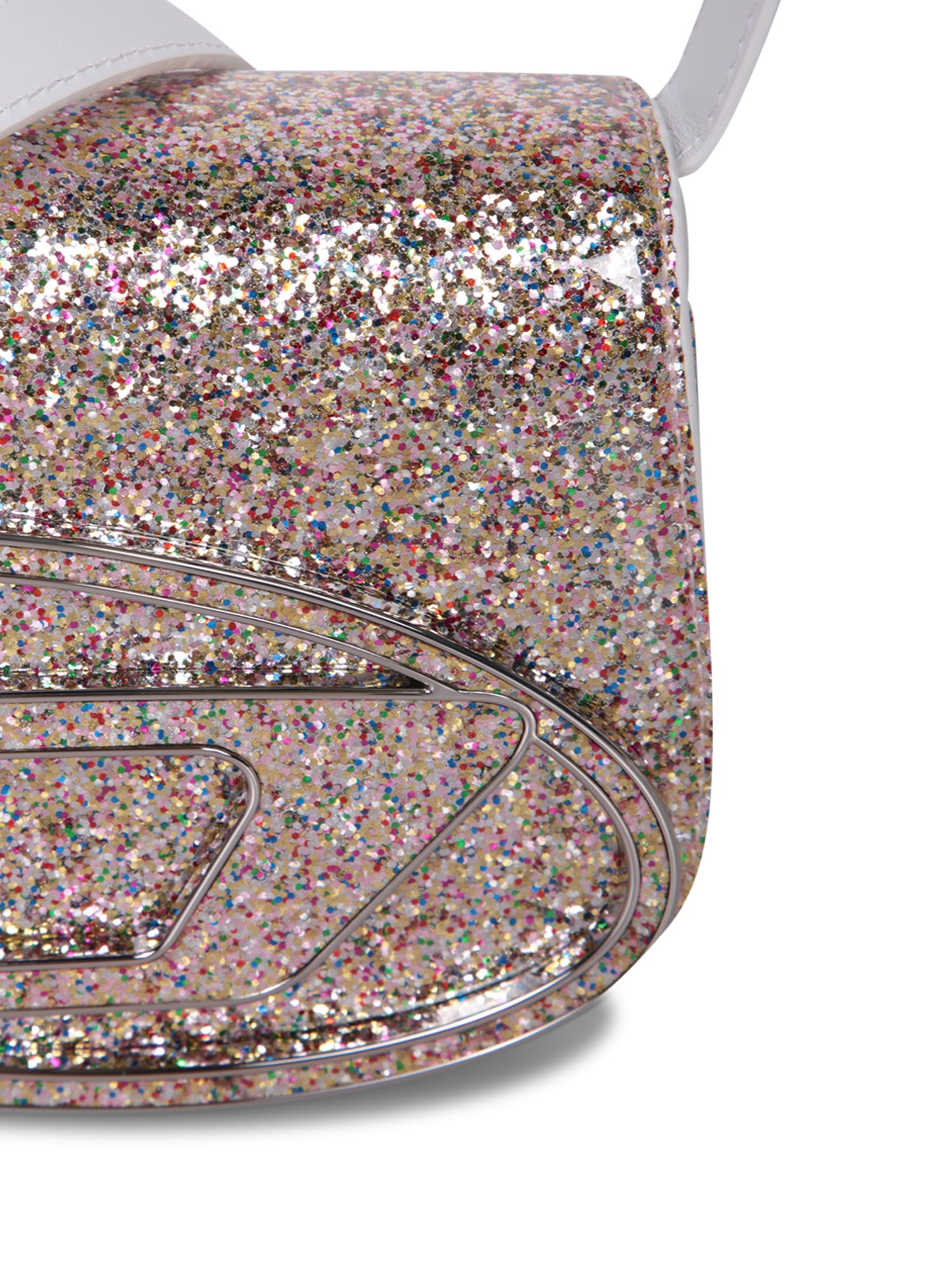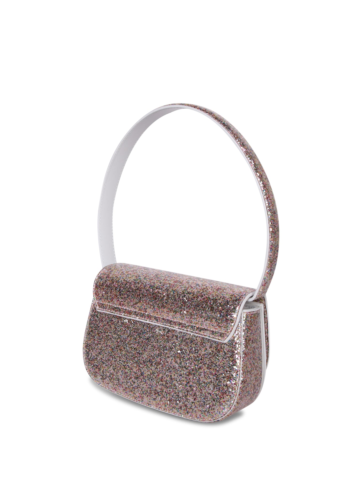 Hand bag with white strap. Multicolored glitter coating. Diesel logo details on the front flap.