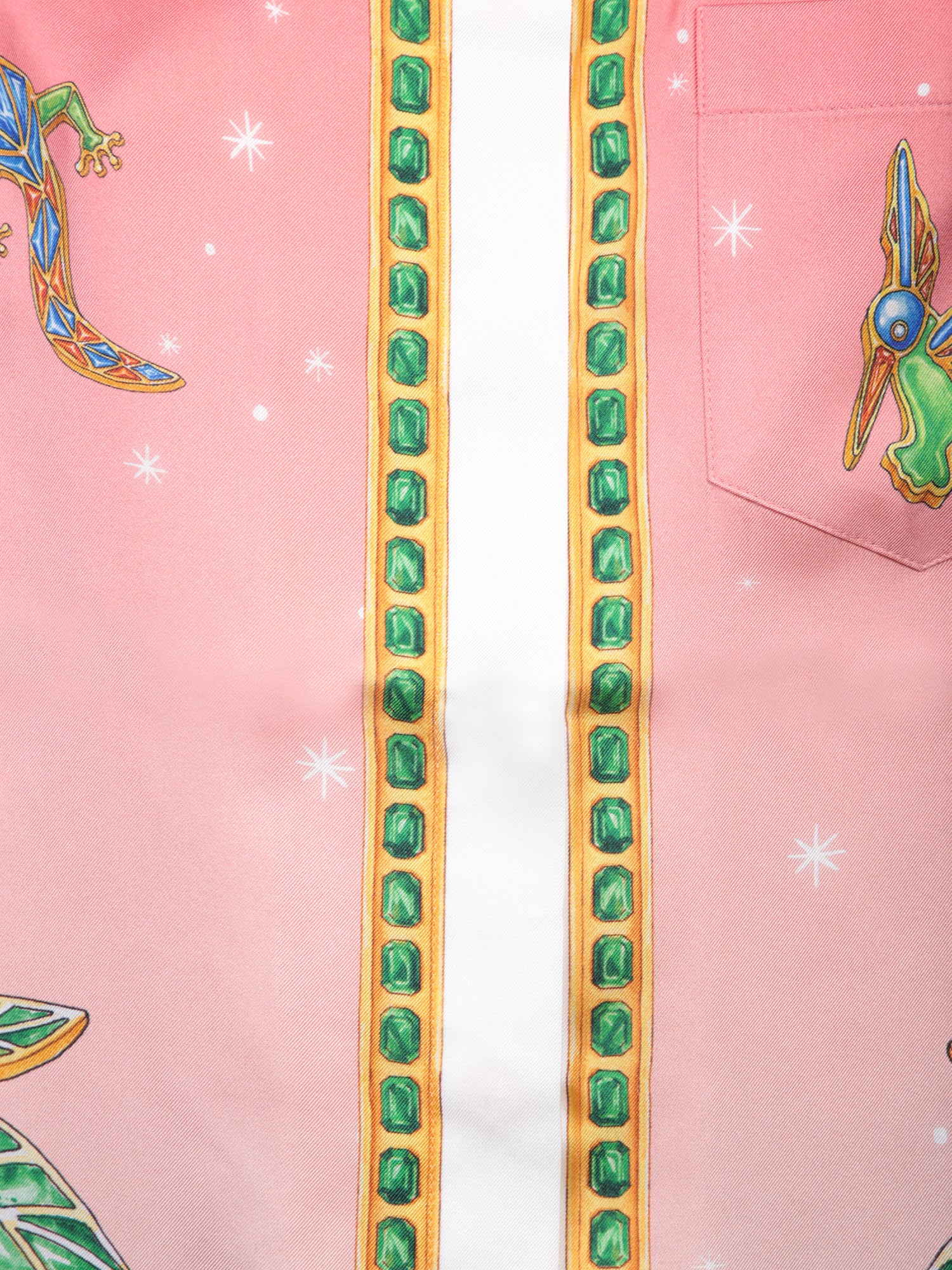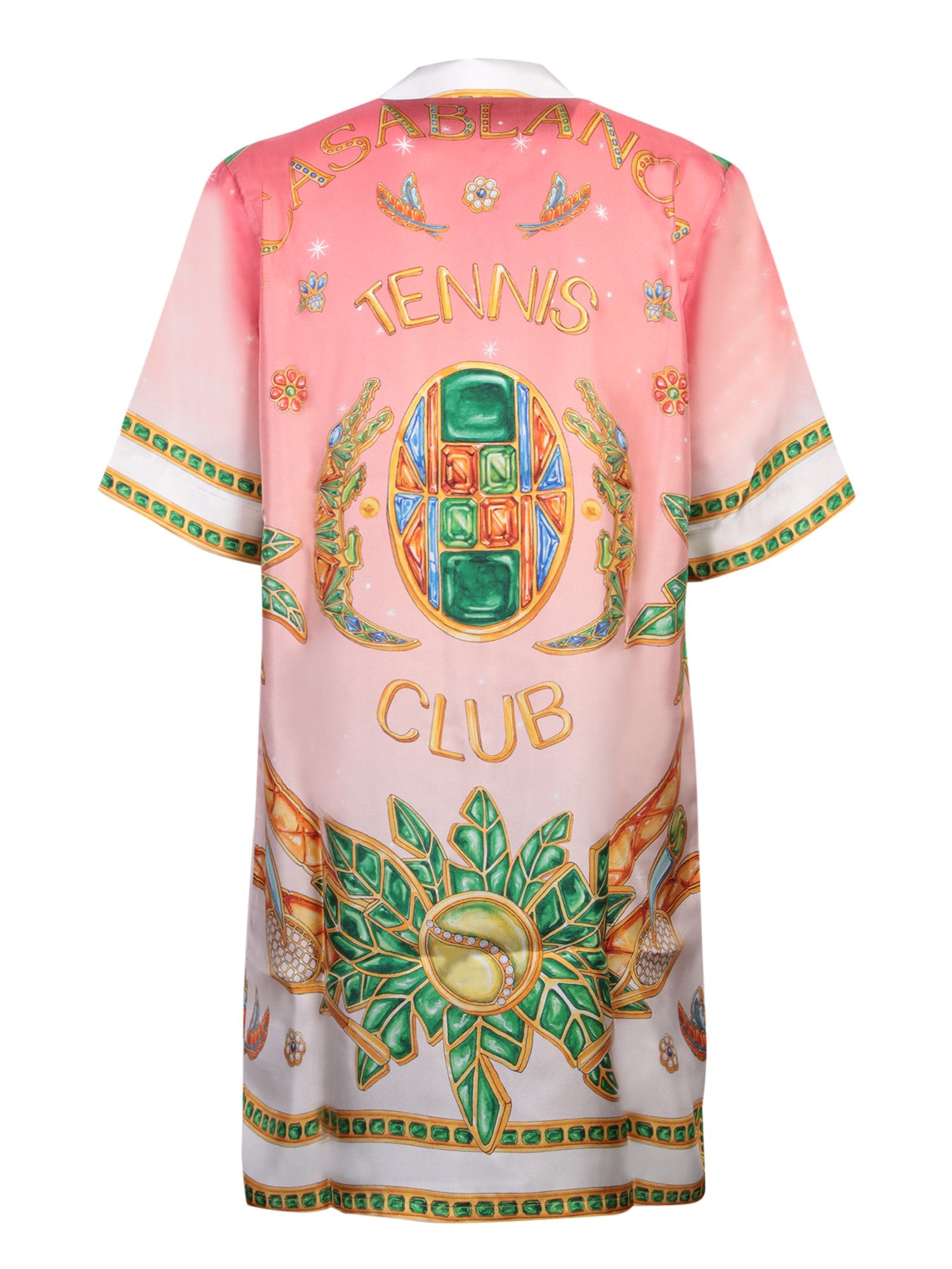 Pure silk mini dress with exotic print and vivid detailing. Short sleeves and pointed collar.