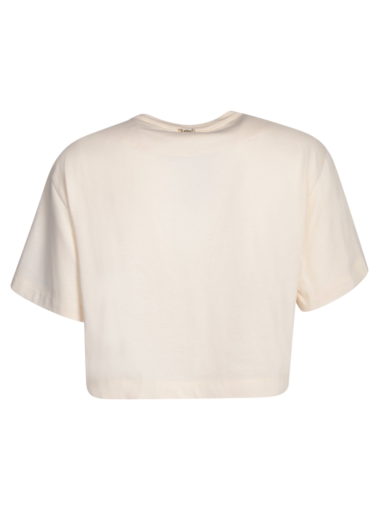 Made of a cotton blend in a cropped silhouette, this T-shirt is embellished with a metal mesh front panel