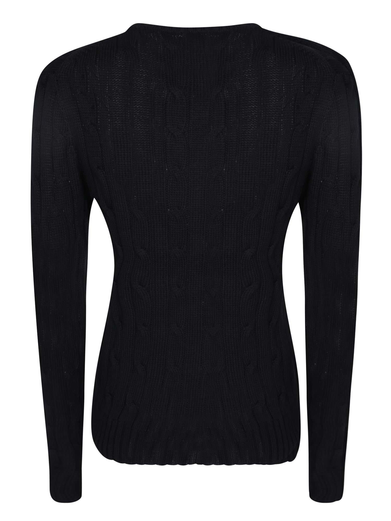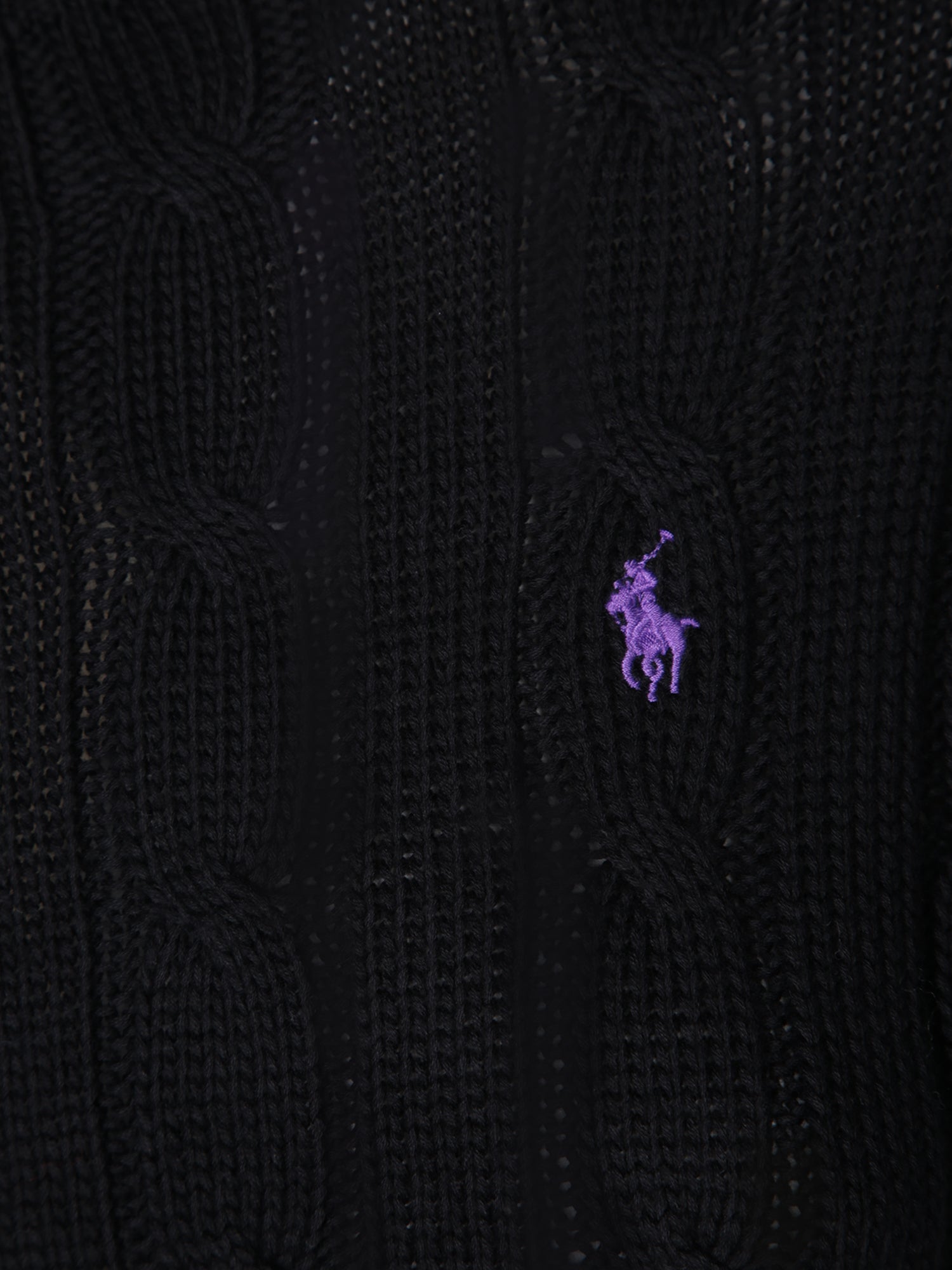Long sleeve sweater. Cable knit design. Crew neck. Embroidered horse logo on the chest.