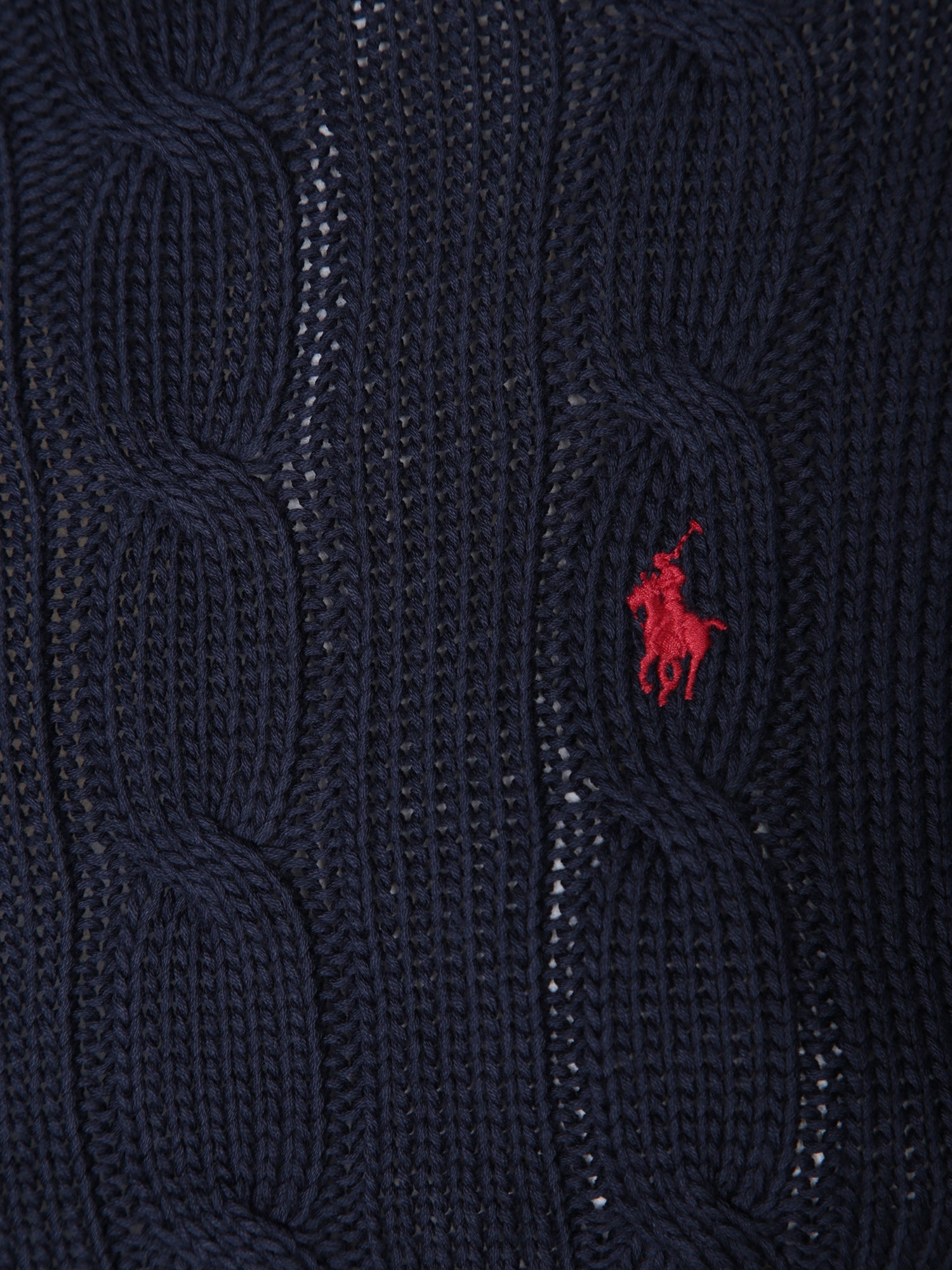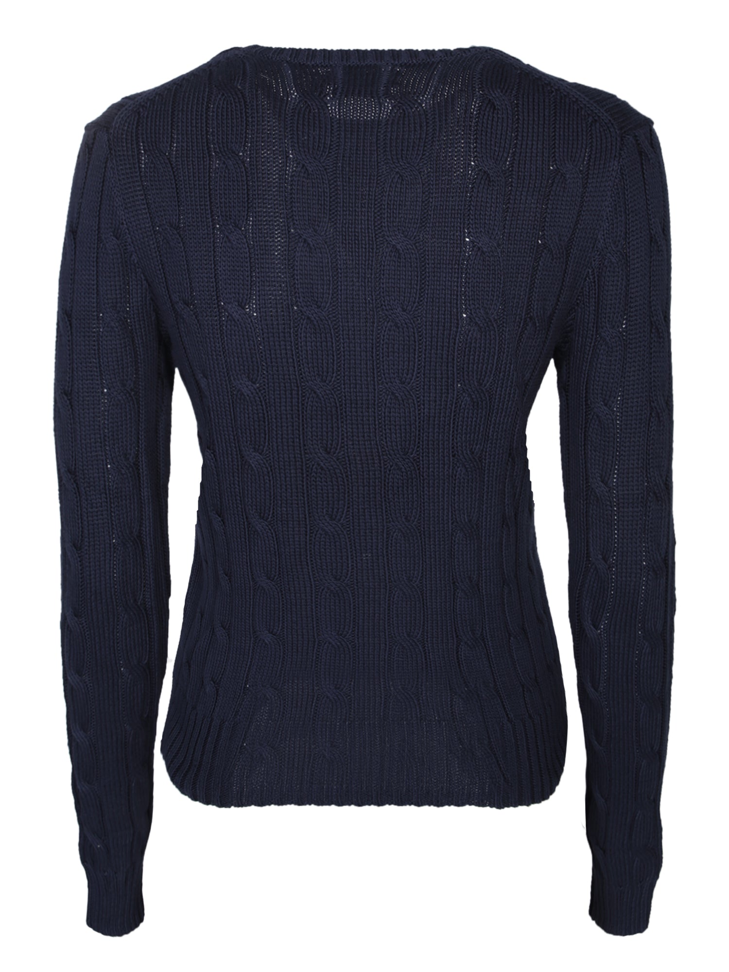 Long sleeve sweater. Cable knit pattern. Crew neck. Embroidered logo on the chest.